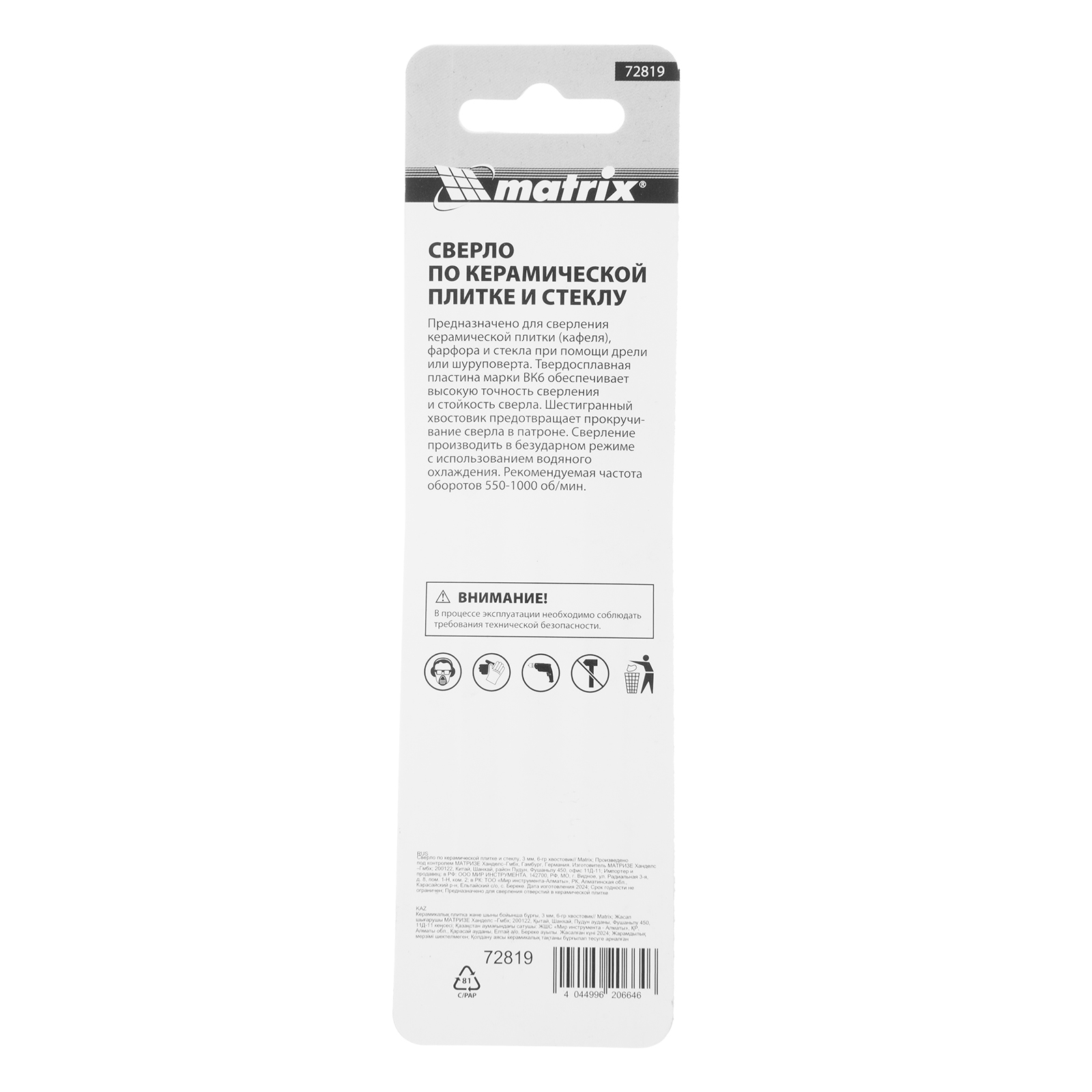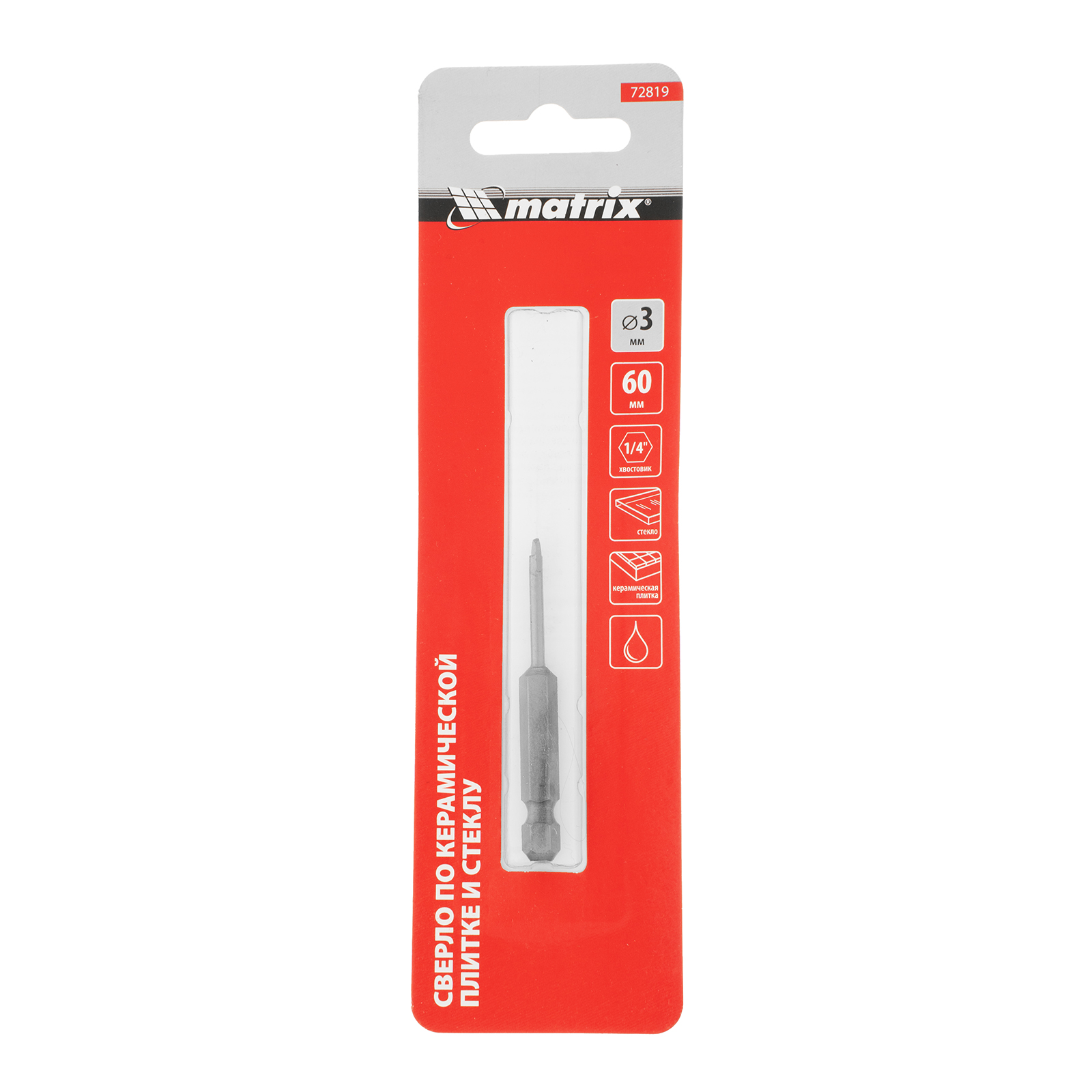Сверло Matrix 72819 диаметром 3 мм, с шестигранным хвостовиком, используется для сверления керамической плитки, стекла и других материалов с помощью дрели или шуруповерта. Выдерживает высокие нагрузки и подходит для интенсивного использования.