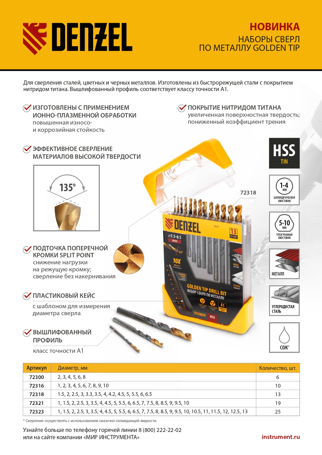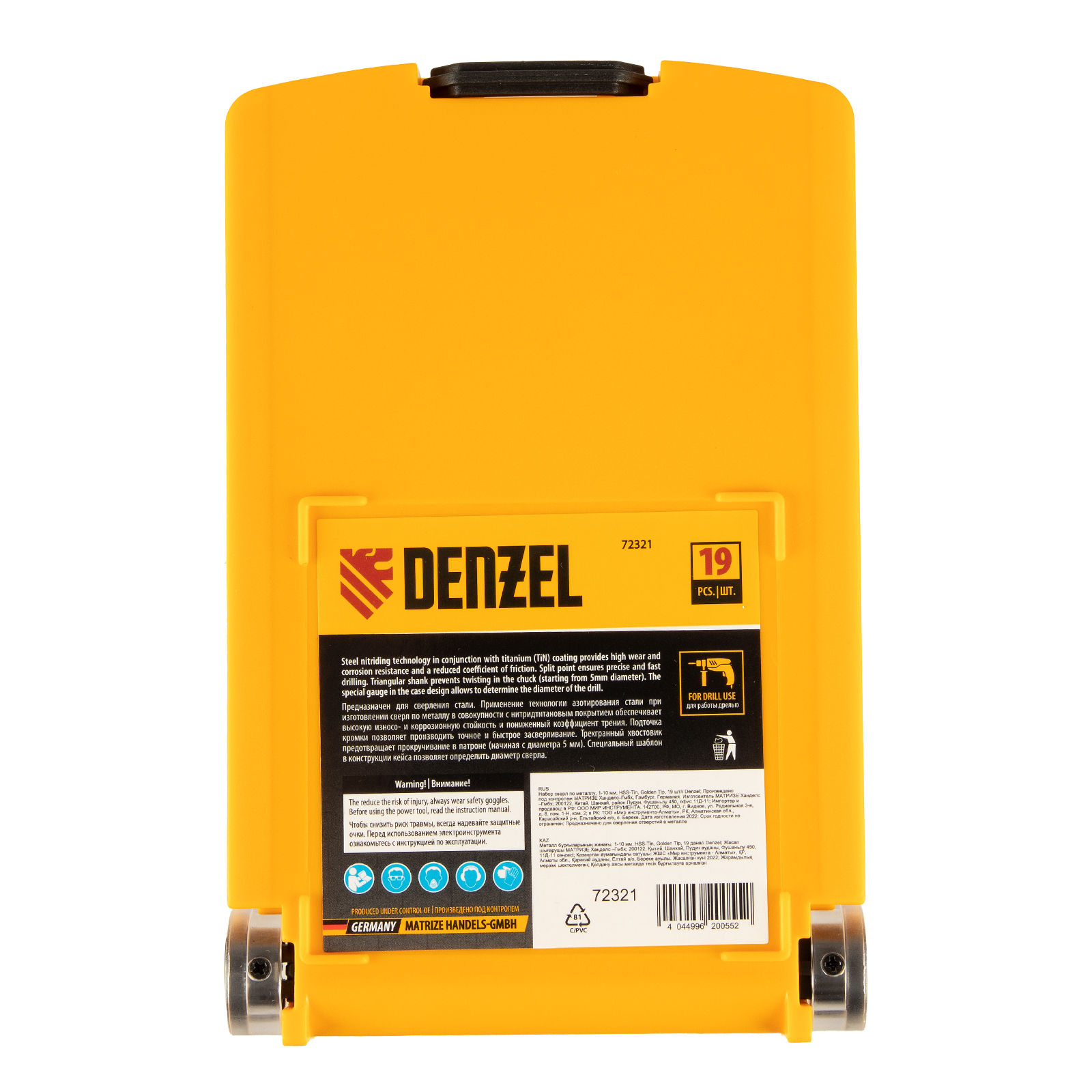Набор Denzel Golden Tip 72321 включает 19 сверл по металлу из стали HSS-Tin самых распространенных диаметров 1-10 мм. Вышлифованные профили обеспечивают идеальную геометрию сверл (класс точности A1) и позволяют получать качественные отверстия в стальных заготовках. Набор упакован в пластиковый кейс, в крышке которого предусмотрен шаблон для измерения диаметра сверла — такое решение значительно ускоряет работу.