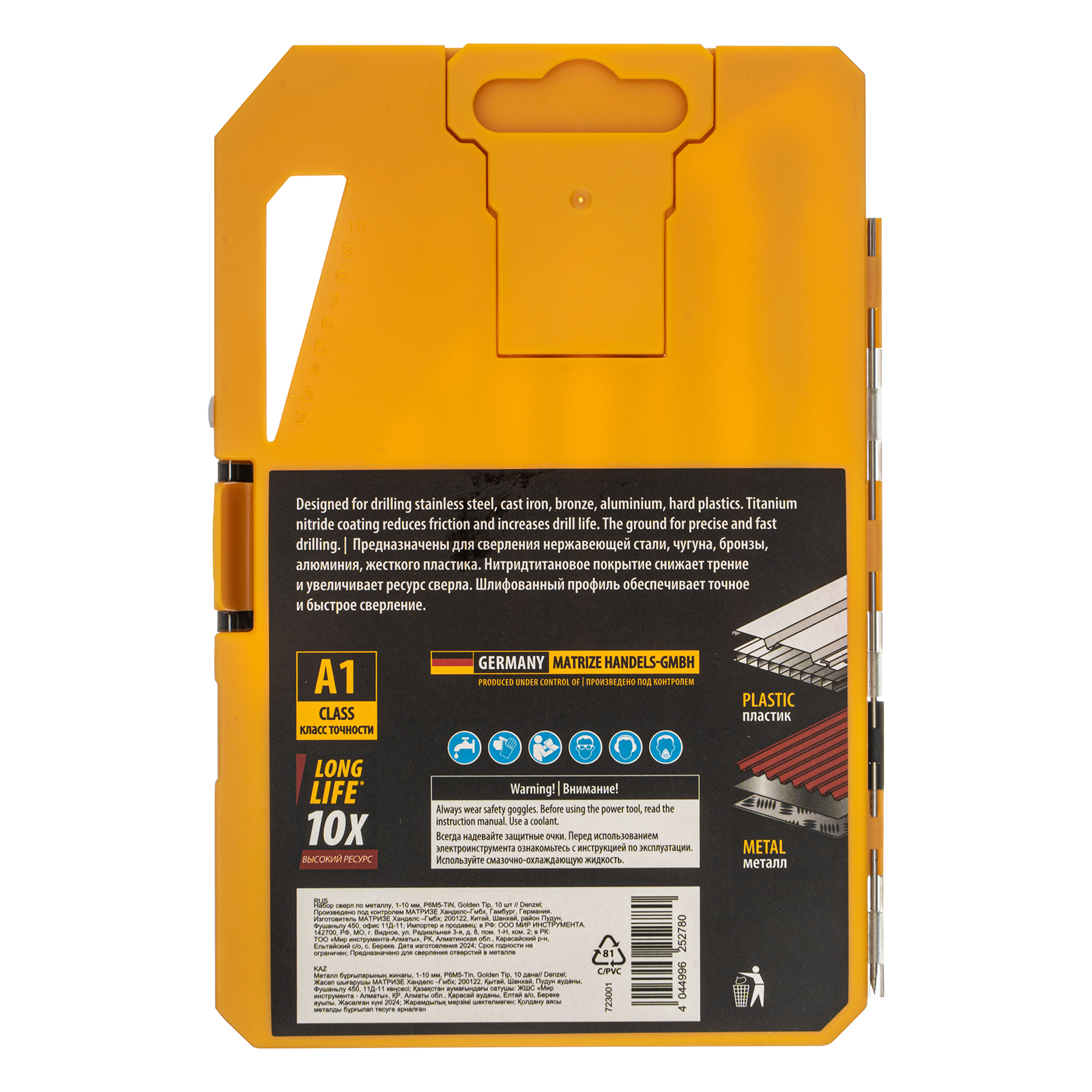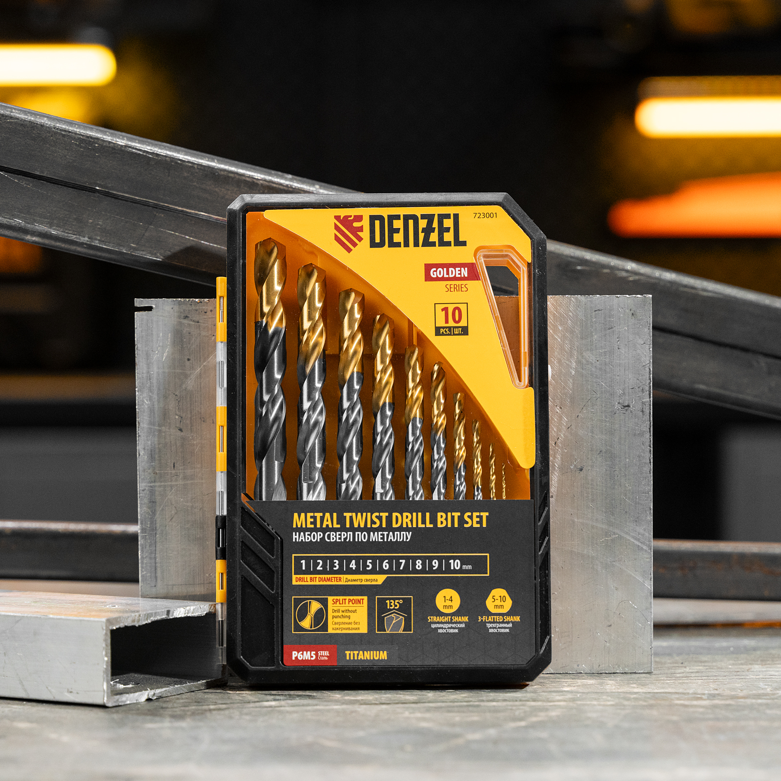 Набор Denzel Golden Tip 723001 состоит из 10 сверл по металлу диаметром 1-10 мм, изготовленных из стали P6M5. Угол заточки составляет 135°, что позволяет получать чистые и ровные отверстия в нержавеющей стали, чугуне, бронзе, алюминии, а также жестком пластике. Сверлам присвоен класс точности A1, что гарантирует высокое качество выполняемых работ. Оснастка характеризуется пониженным коэффициентом трения, что облегчает сверление и улучшает отвод стружки. Набор будет полезен дома и в мастерской.