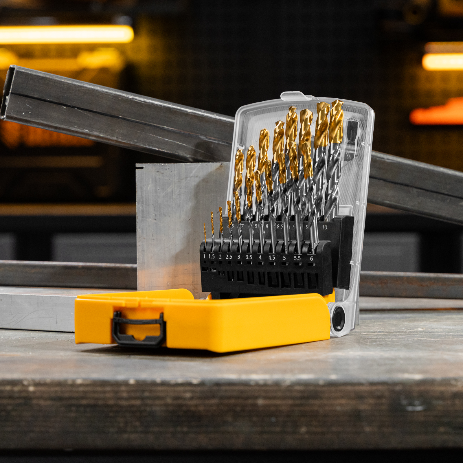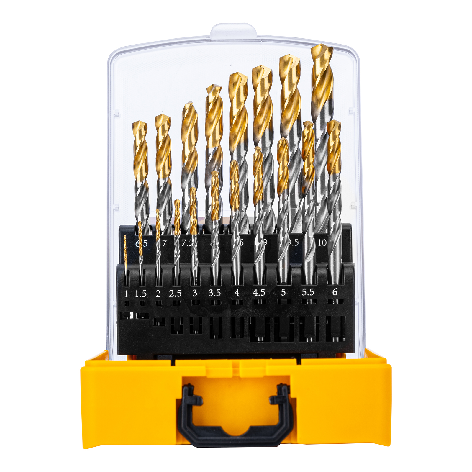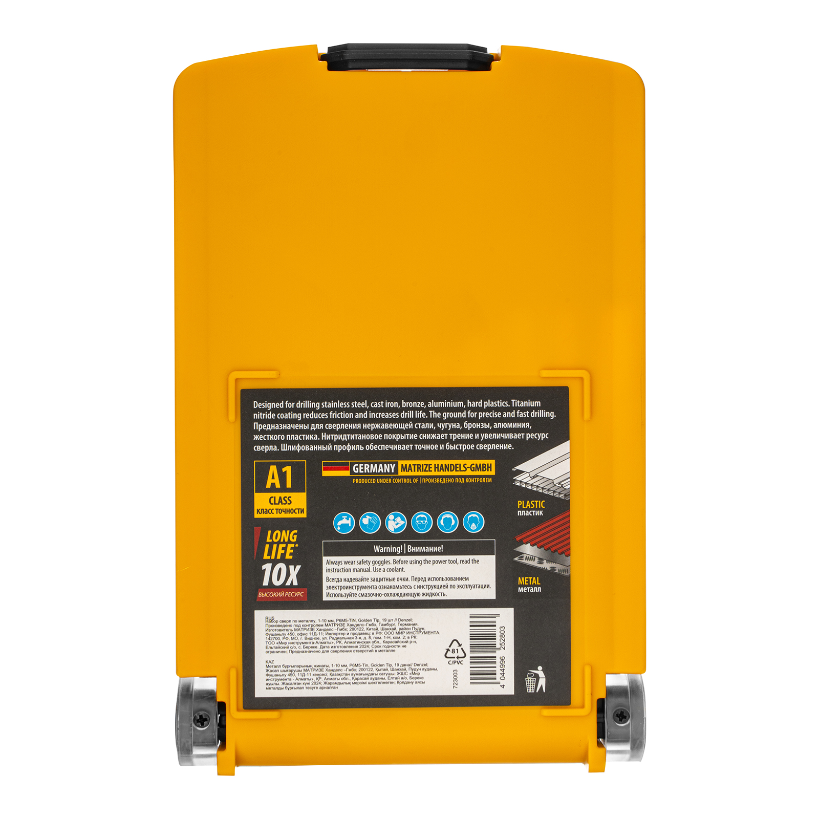 - Удобная упаковка — сверла поставляются в пластиковом кейсе с шаблоном для определения диаметра сверл.