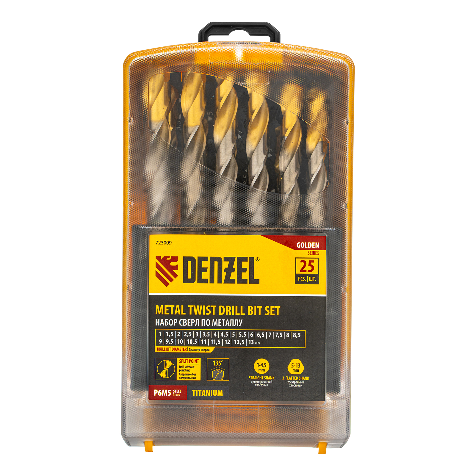Набор Denzel Golden Tip 723009 состоит из 25 сверл по металлу диаметром 1-13 мм, изготовленных из стали P6M5. Угол заточки составляет 135°, что позволяет получать чистые и ровные отверстия в нержавеющей стали, чугуне, бронзе, алюминии, а также жестком пластике. Сверлам присвоен класс точности A1, что гарантирует высокое качество выполняемых работ. Оснастка характеризуется пониженным коэффициентом трения, что облегчает сверление и улучшает отвод стружки. Набор будет полезен дома и в мастерской.