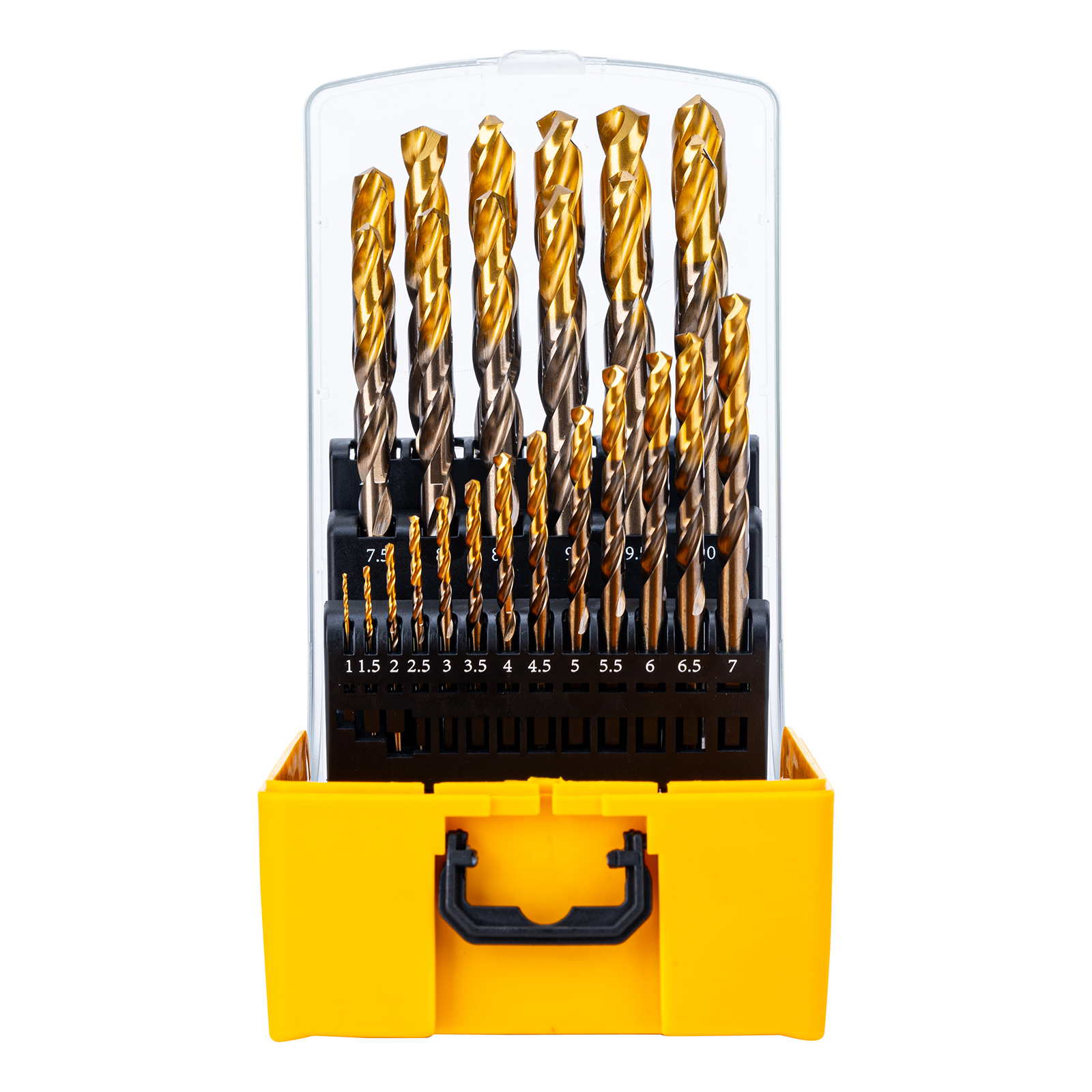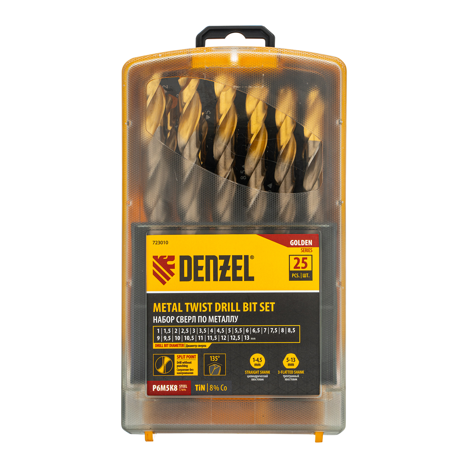 Набор Denzel Golden Tip 723010 состоит из 25 сверл по металлу диаметром 1-13 мм, изготовленных из стали P6M5K8. Угол заточки составляет 135°, что позволяет получать чистые и ровные отверстия в закаленной и нержавеющей стали, цветных и черных металлах, а также жестком пластике. Сверлам присвоен класс точности A1, что гарантирует высокое качество выполняемых работ. Оснастка характеризуется пониженным коэффициентом трения, что облегчает сверление и улучшает отвод стружки. Набор будет полезен дома и в мастерской.