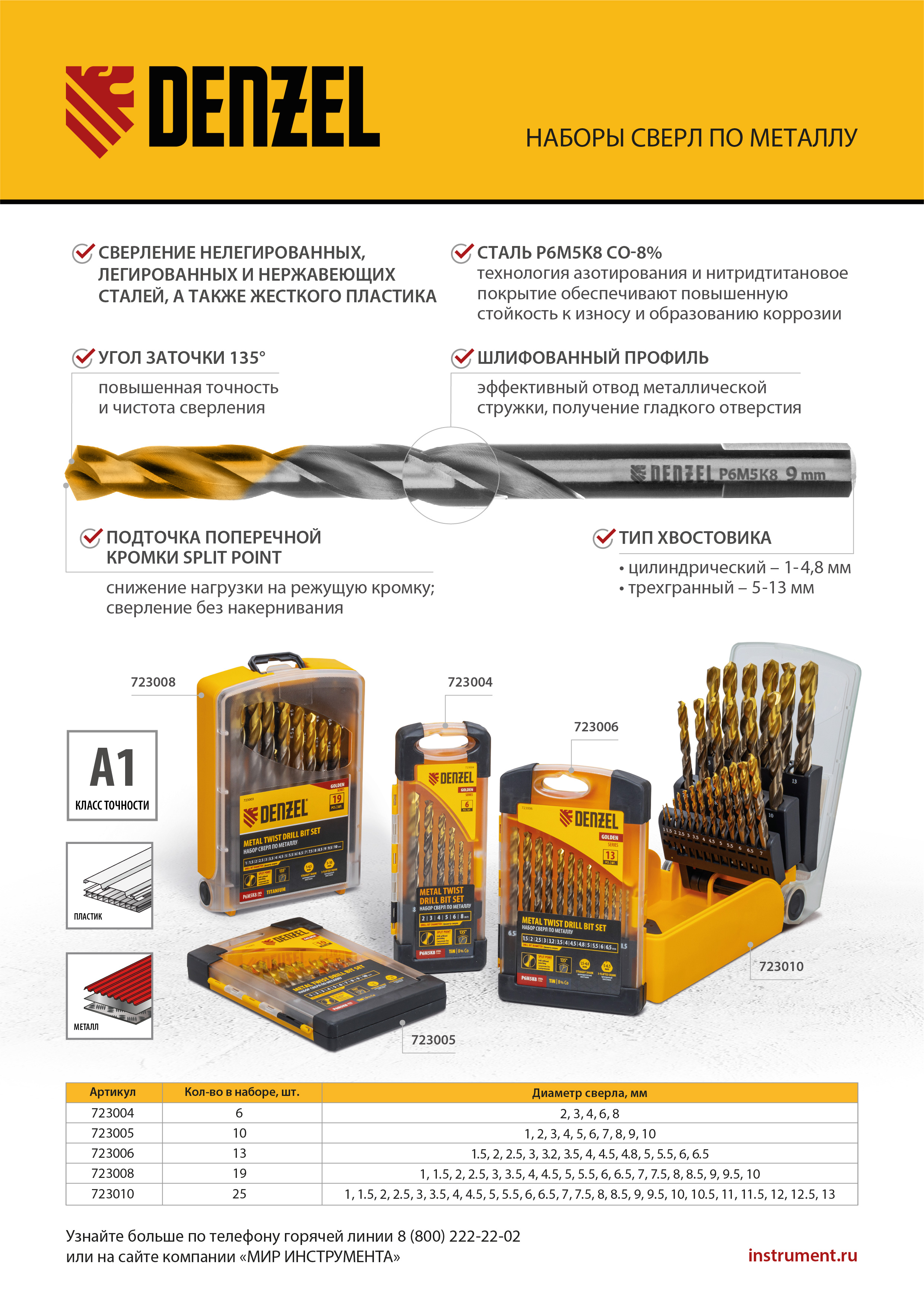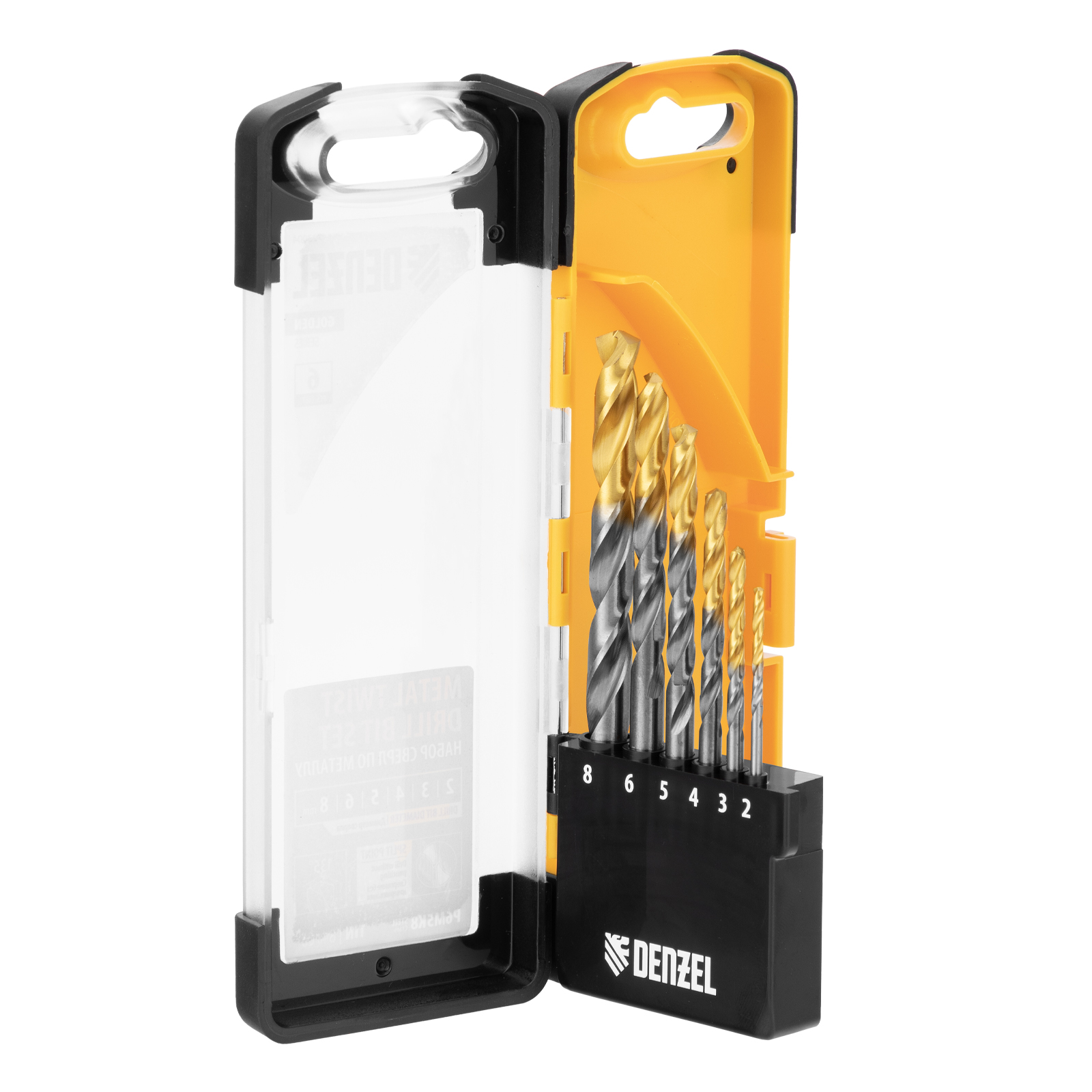 Набор Denzel Golden Tip 723004 состоит из 6 сверл по металлу диаметром 2-8 мм, изготовленных из стали P6M5K8. Угол заточки составляет 135°, что позволяет получать чистые и ровные отверстия в закаленной и нержавеющей стали, цветных и черных металлах, а также жестком пластике. Сверлам присвоен класс точности A1, что гарантирует высокое качество выполняемых работ. Оснастка характеризуется пониженным коэффициентом трения, что облегчает сверление и улучшает отвод стружки. Набор будет полезен дома и в мастерской.