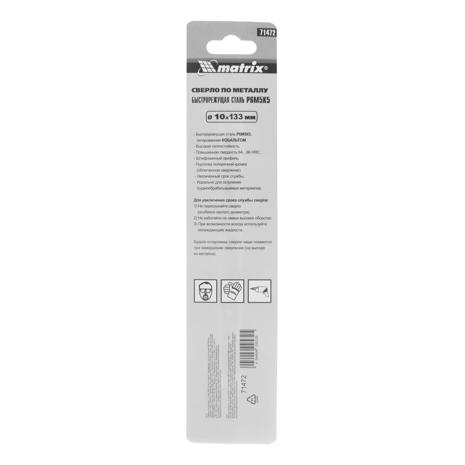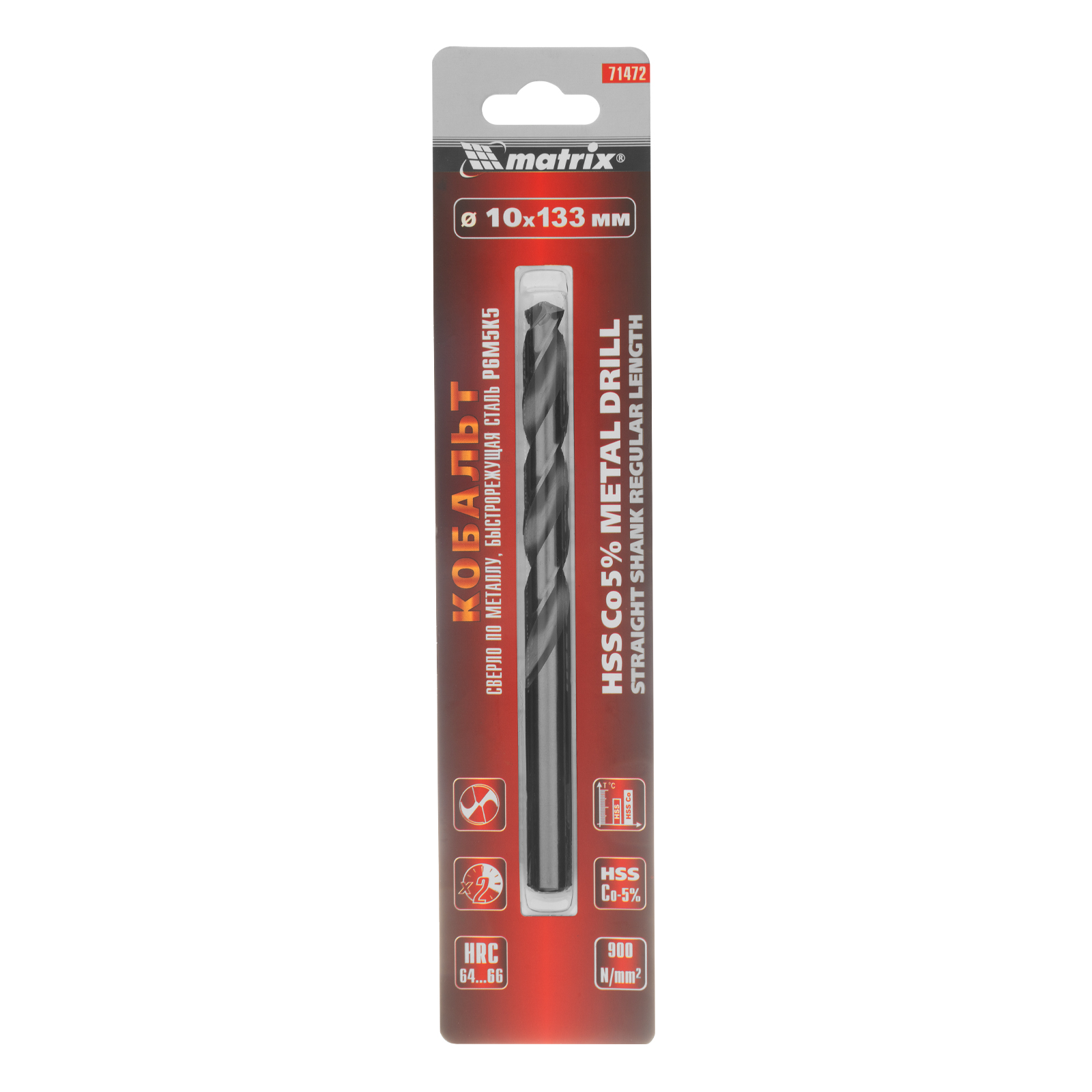 Сверло Matrix 71472 диаметром 10 мм, из стали HSS Co-5%, имеет угол заточки 135°, оптимальный для сверления легированных и цветных металлов. Подходит для профессионального использования на строительной площадке.
