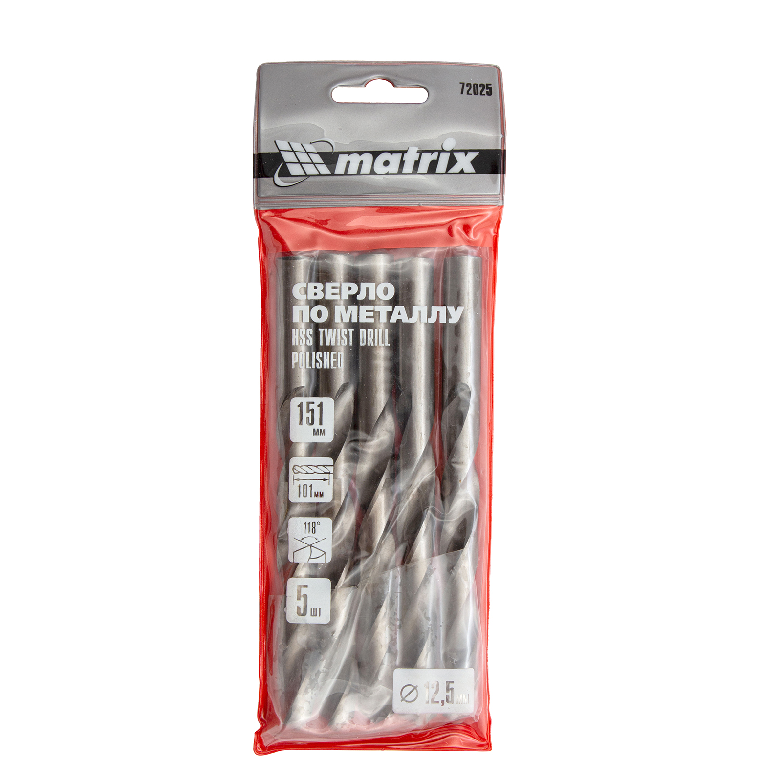Полированное сверло по металлу Matrix 72025 из стали HSS, с цилиндрическим хвостовиком, 5 шт. в упаковке, используется для получения отверстий диаметром 12,5 мм. Угол заточки составляет 118°, поэтому сверло оптимально для работы с черными металлами, сталью, чугуном и твердой бронзой.