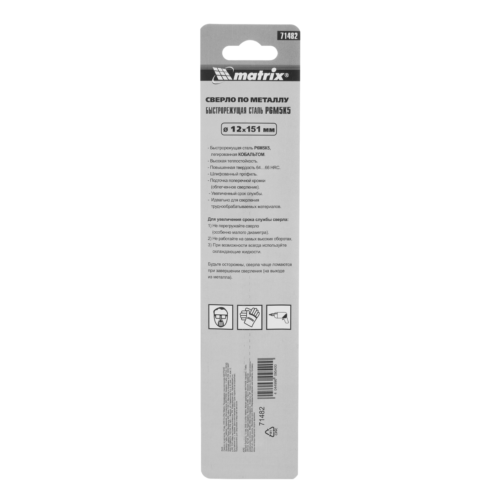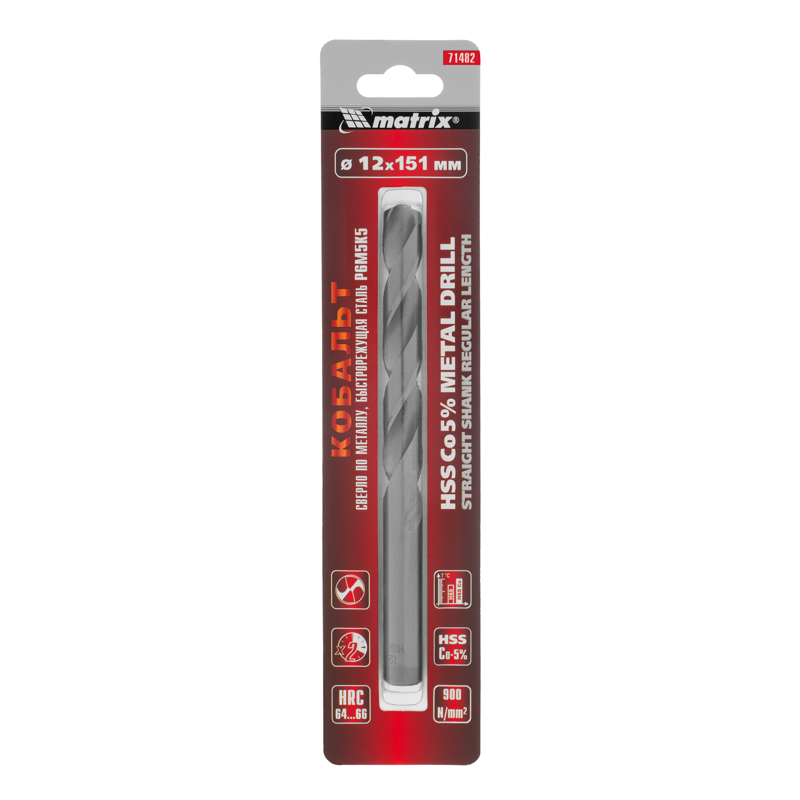Сверло Matrix 71482 диаметром 12 мм, из стали HSS Co-5%, имеет угол заточки 135°, оптимальный для сверления легированных и цветных металлов. Подходит для профессионального использования на строительной площадке.