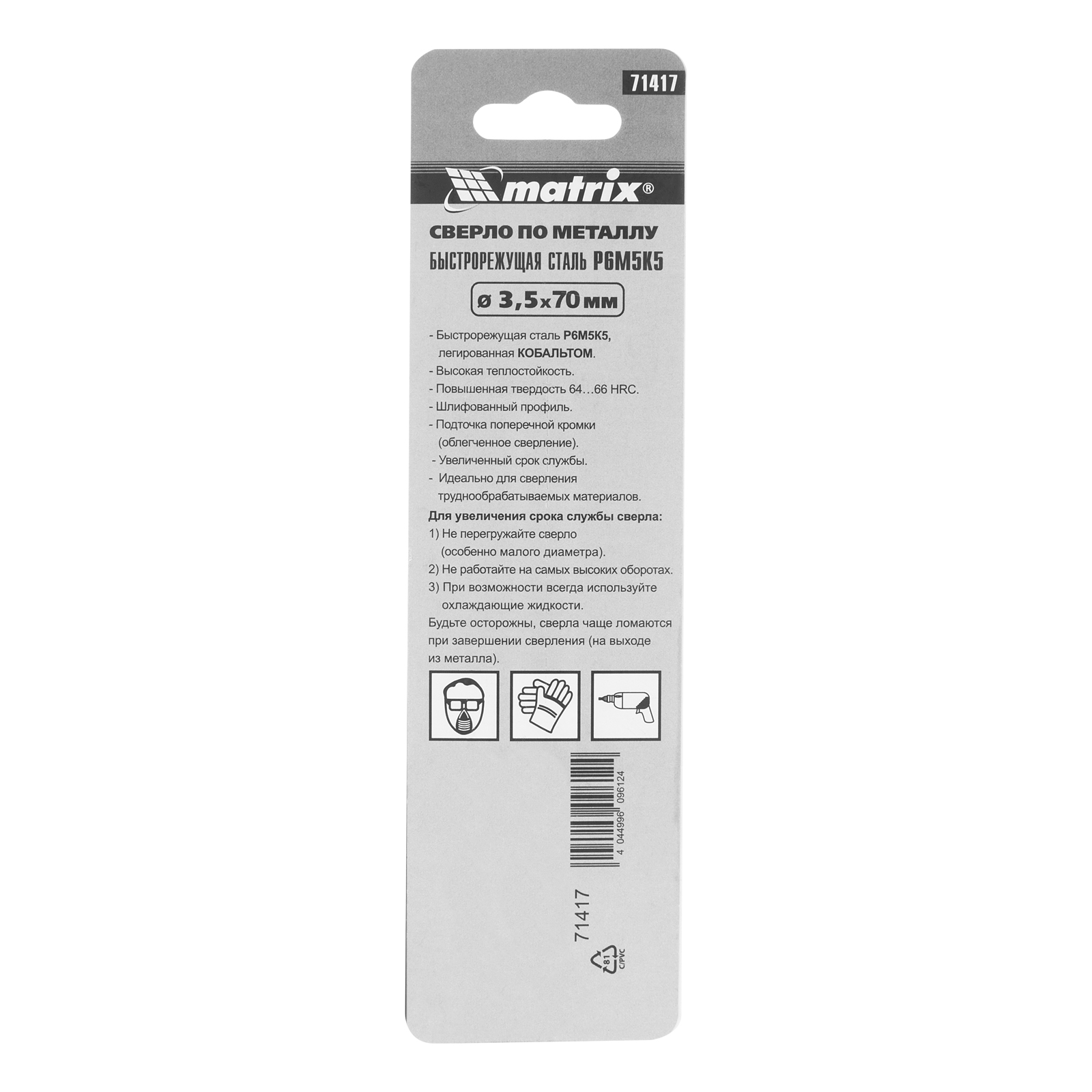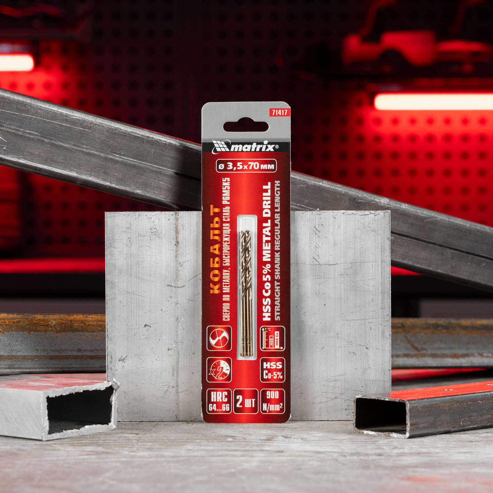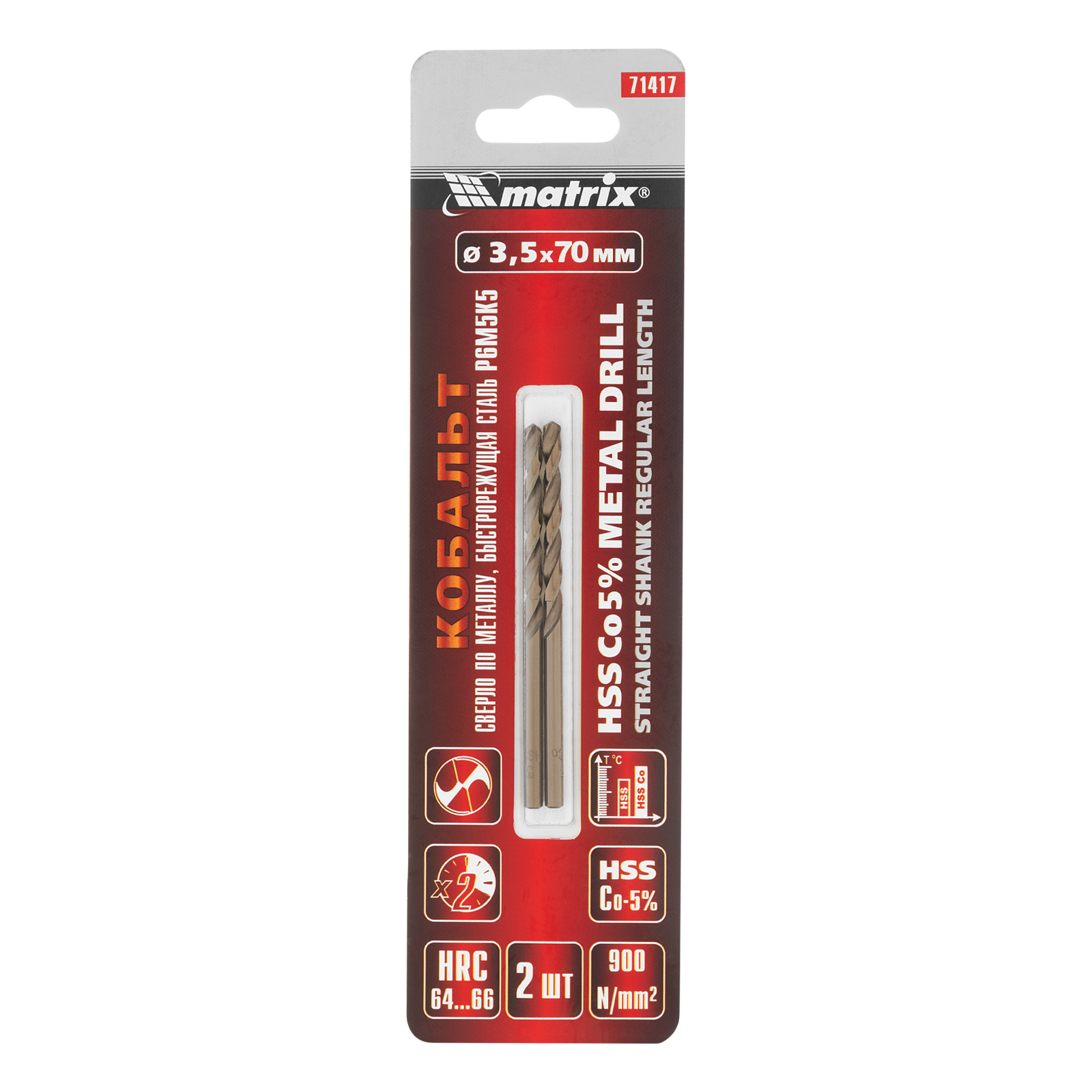 Сверло Matrix 71417 диаметром 3,5 мм, из стали HSS Co-5%, 2 штуки в комплекте, имеет угол заточки 135°, оптимальный для сверления легированных и цветных металлов. Подходит для профессионального использования на строительной площадке.