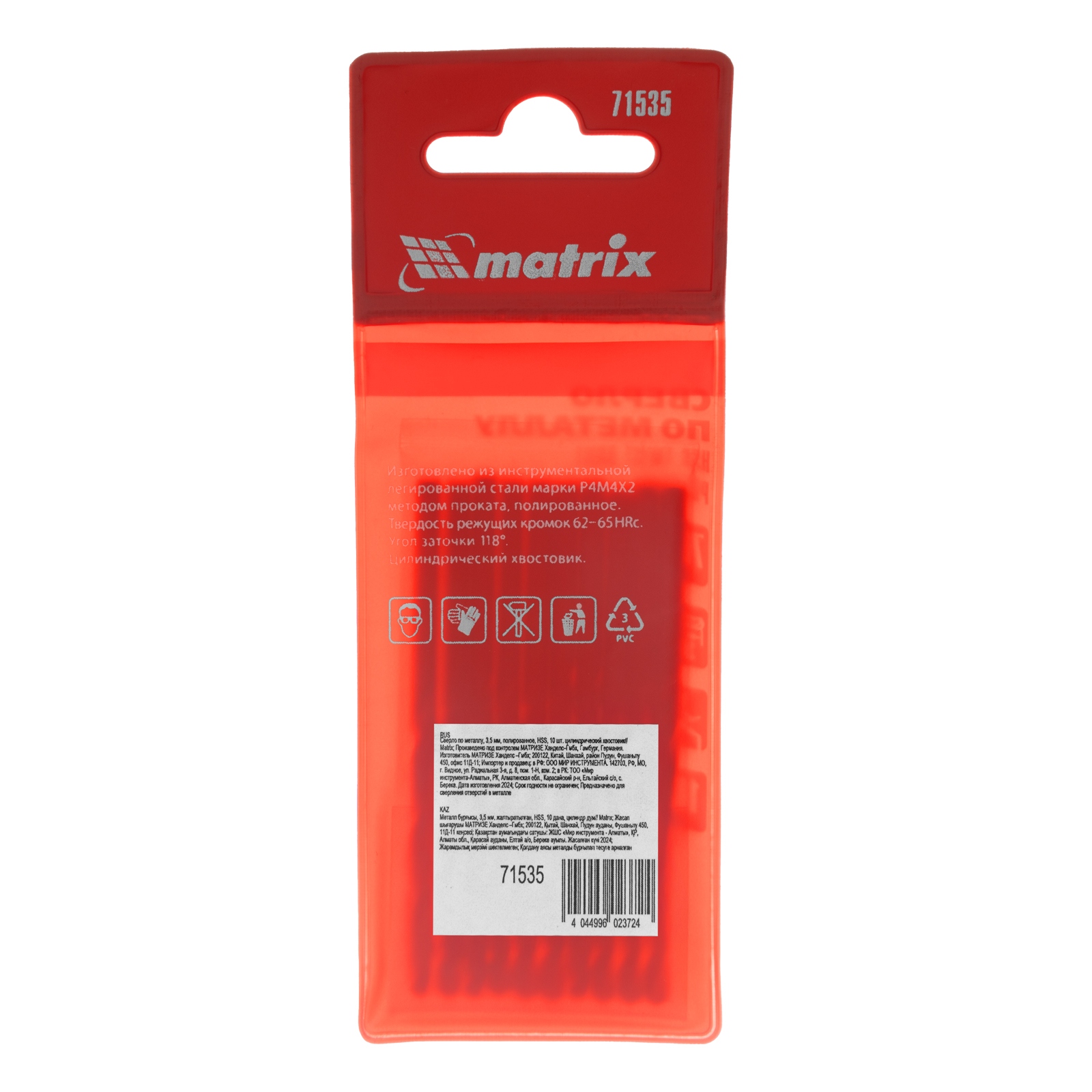 Полированное сверло по металлу Matrix 71535 из стали HSS, с цилиндрическим хвостовиком, 10 шт. в упаковке, используется для получения отверстий диаметром 3,5 мм. Угол заточки составляет 118 градусов, поэтому сверло оптимально для работы с черными металлами, сталью, чугуном и твердой бронзой.