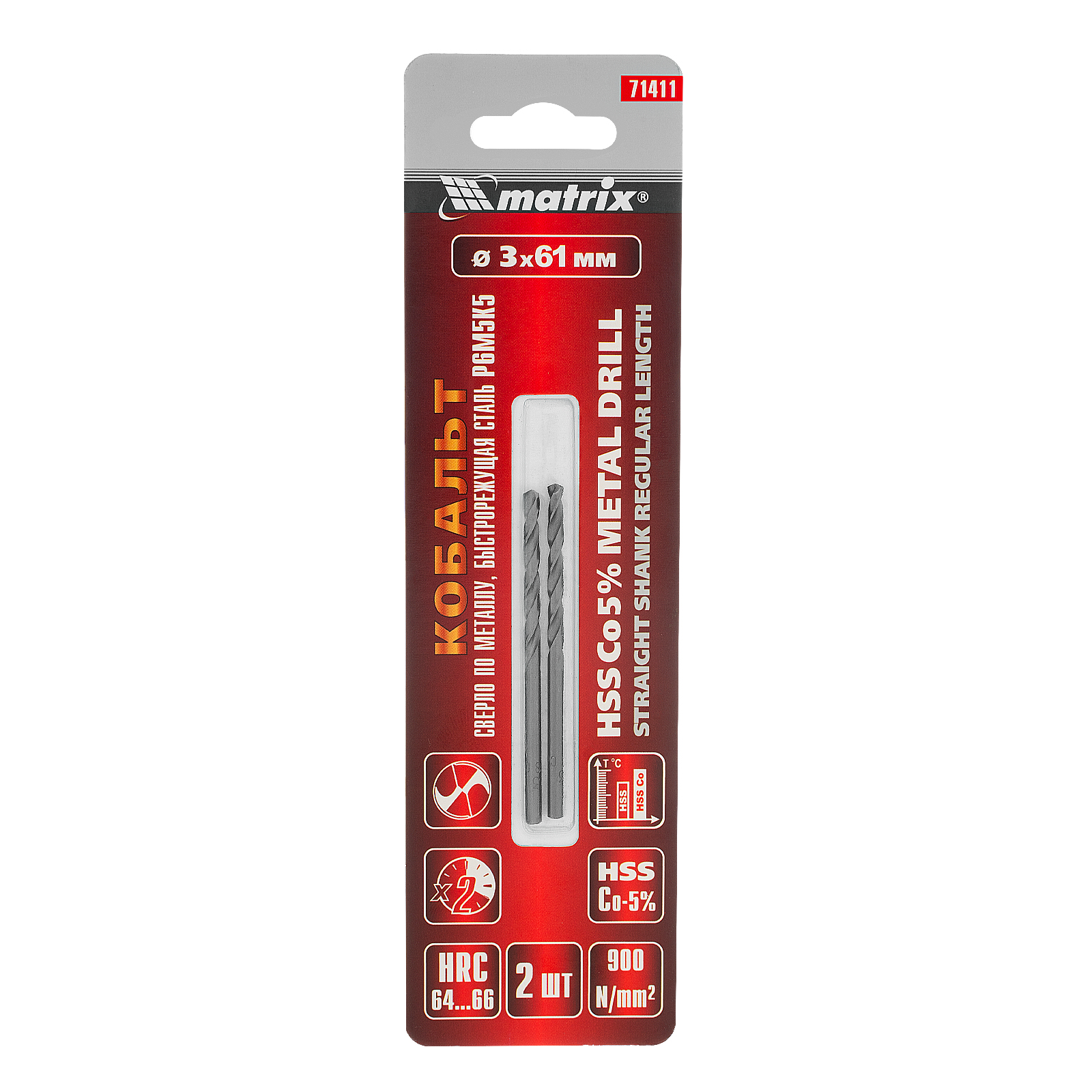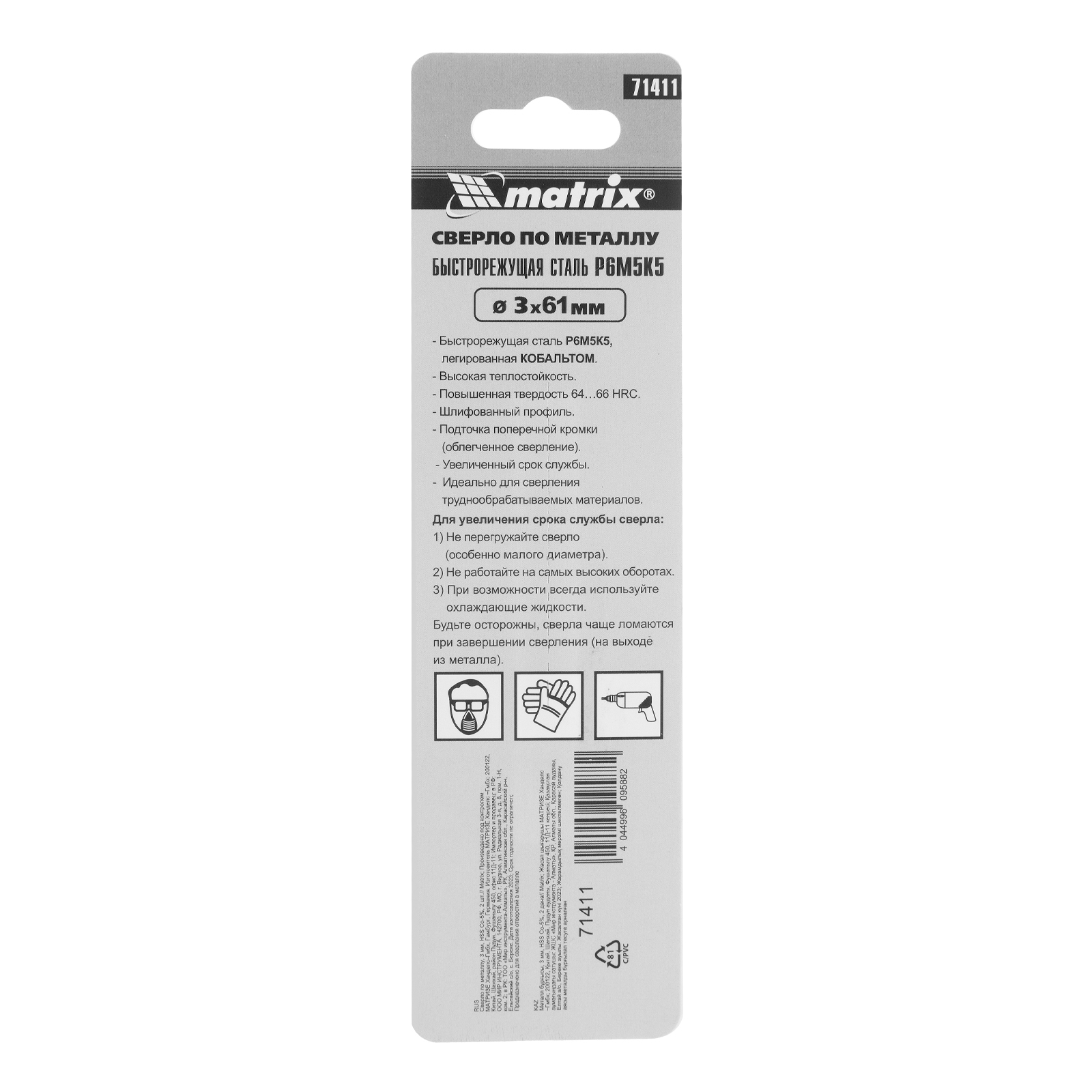 Сверло Matrix 71411 диаметром 3 мм, из стали HSS Co-5%, 2 штуки в комплекте, имеет угол заточки 135°, оптимальный для сверления легированных и цветных металлов. Подходит для профессионального использования на строительной площадке.