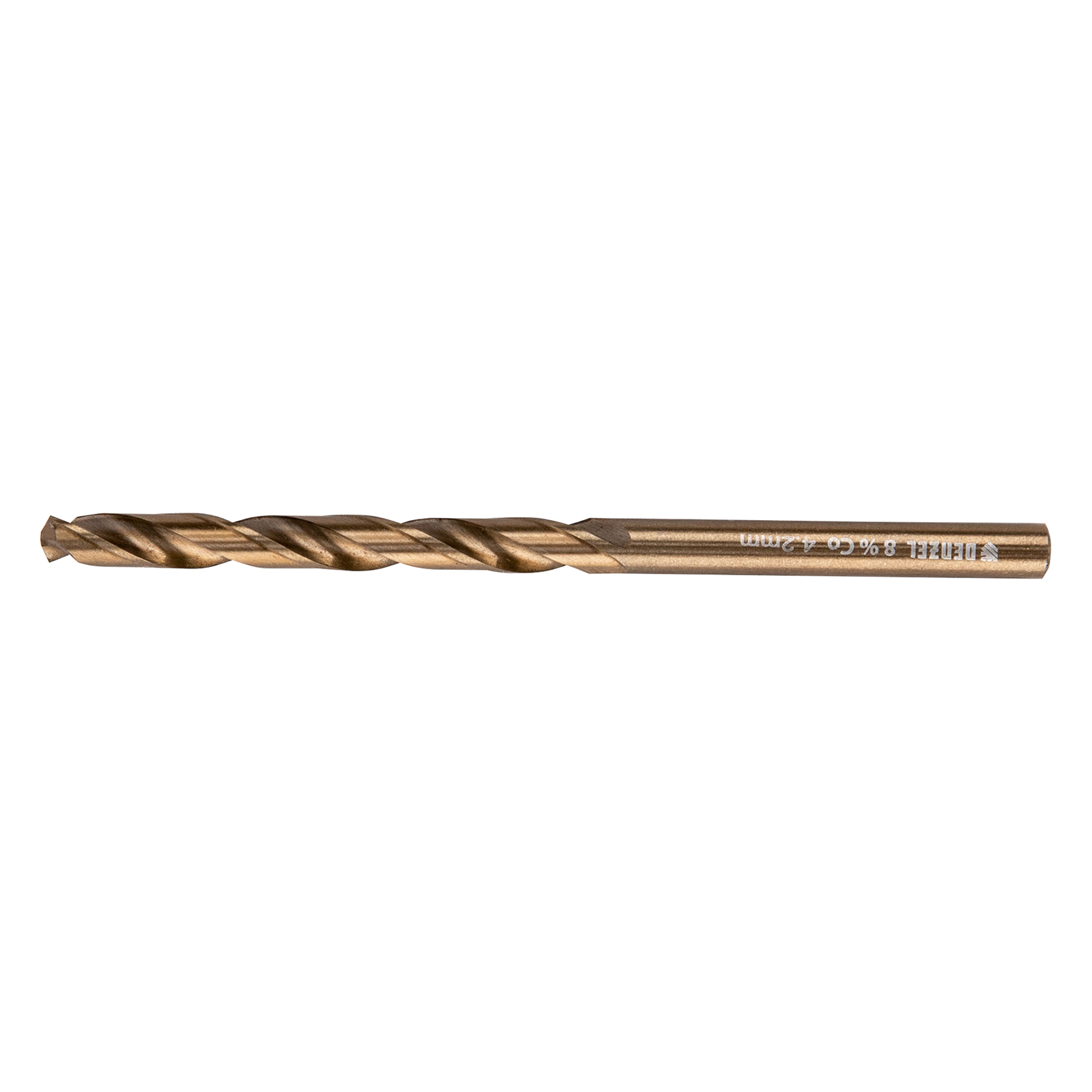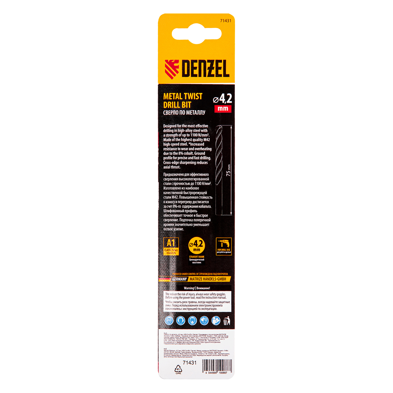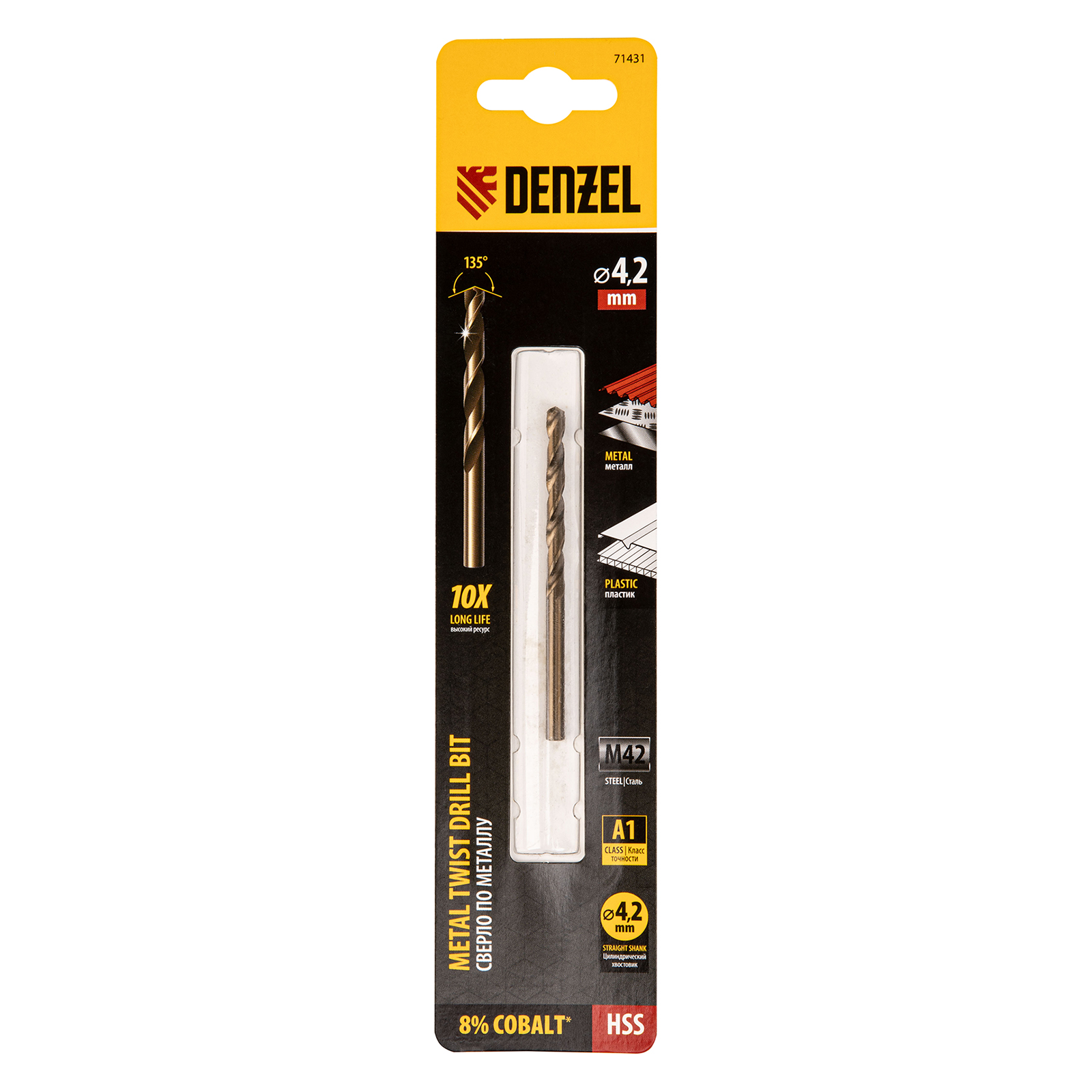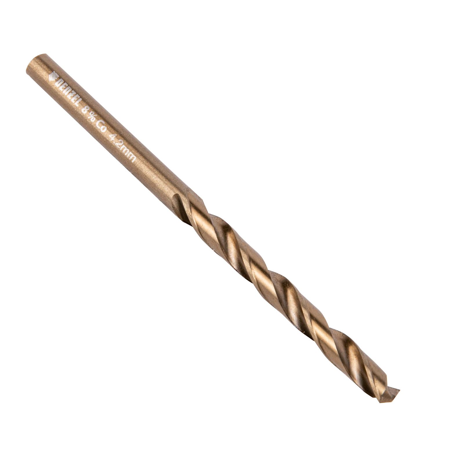 Кобальтовое сверло по металлу Denzel 71431 диаметром 4,2 мм, из стали HSS Co-8%, позволяет получать отверстия высокой точности в нержавеющей стали, цветных металлах, легированных и нелегированных сталях с пределом прочности до 1100 Н/мм2, а также в жестком пластике. Угол заточки 135° обеспечивает повышенную точность и чистоту сверления.