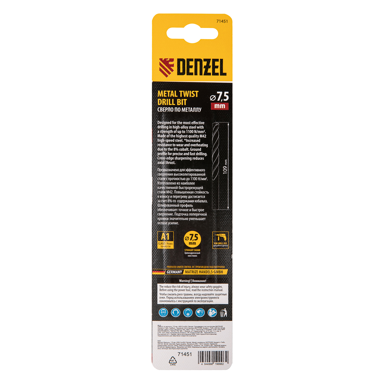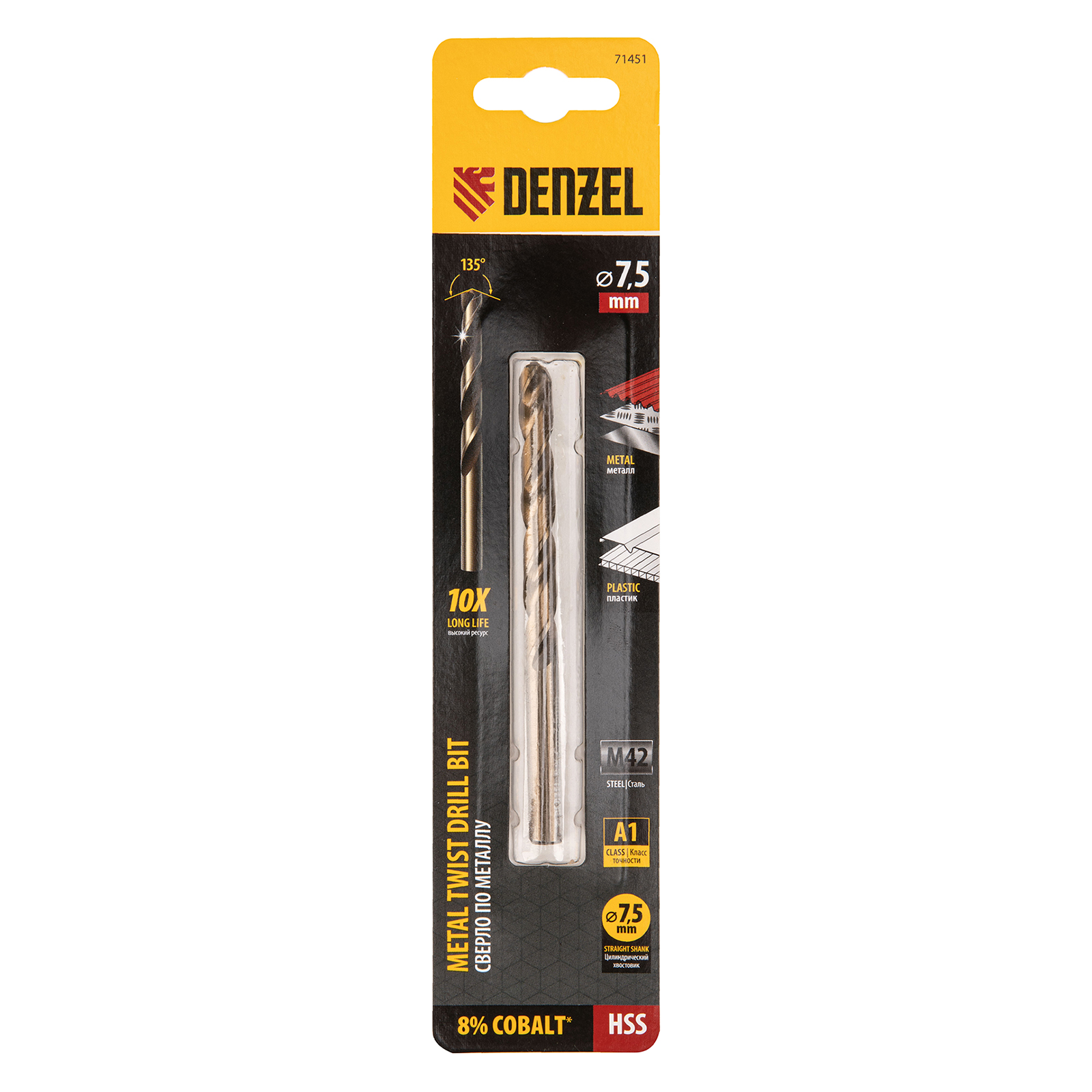 Кобальтовое сверло по металлу Denzel 71451 диаметром 7,5 мм, из стали HSS Co-8%, позволяет получать отверстия высокой точности в нержавеющей стали, цветных металлах, легированных и нелегированных сталях с пределом прочности до 1100 Н/мм2, а также в жестком пластике. Угол заточки 135° обеспечивает повышенную точность и чистоту сверления.