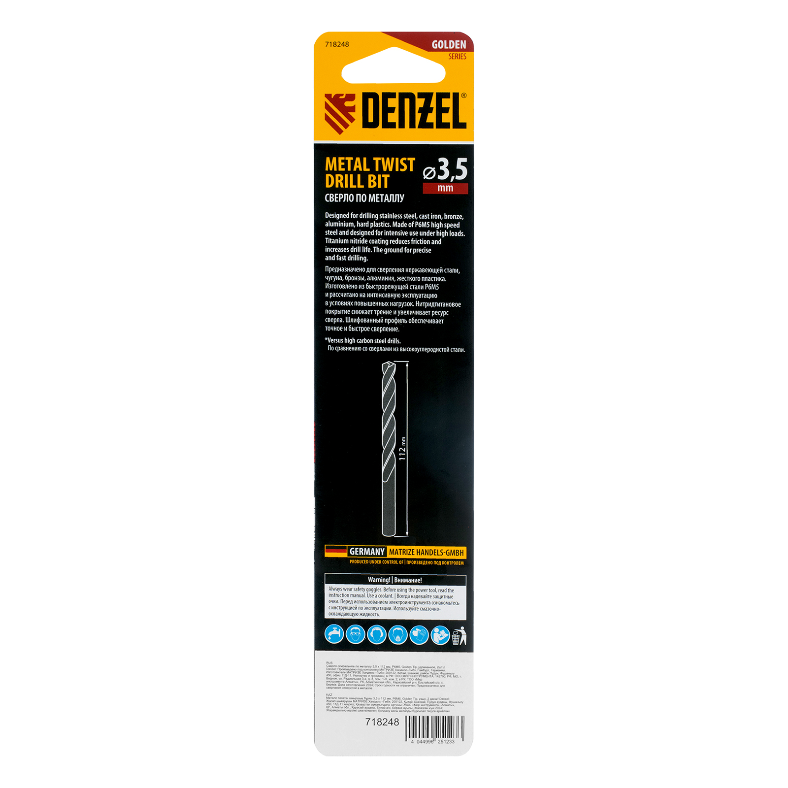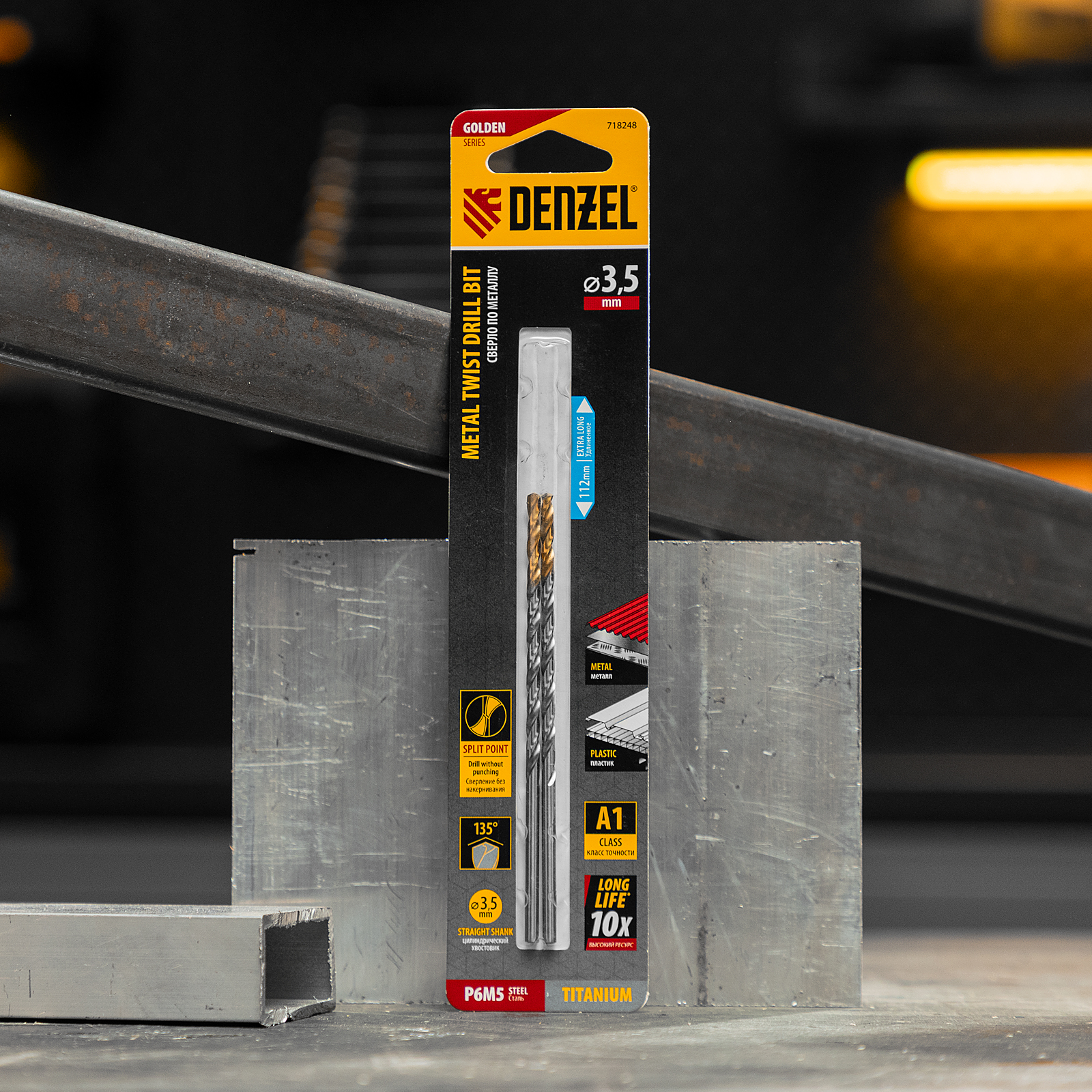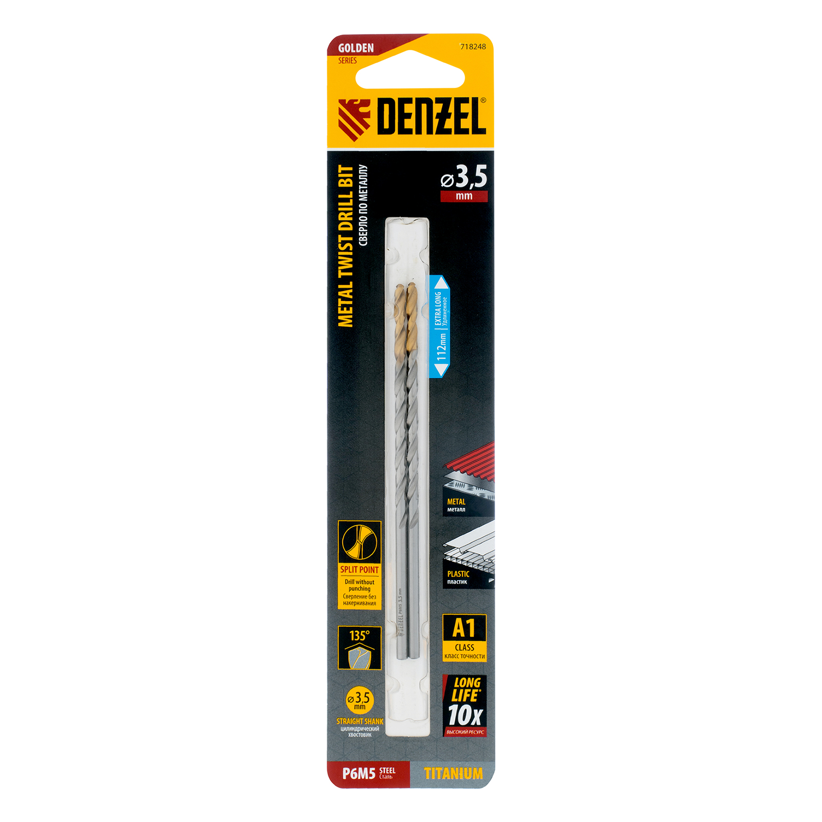 Удлиненное спиральное сверло по металлу Denzel Golden Tip 718248 из стали P6M5, размером 3,5 х 112 мм, 2 шт. в упаковке, предназначено для получения отверстий в легированных и цветных металлах — меди, алюминии, мягкой бронзе, титане, латуни. Оснастка позволяет эффективно справляться с этими задачами благодаря оптимальному углу заточки 135°. Класс точности A гарантирует высокое качество работ, а удлиненный профиль позволяет сверлить глубокие отверстия. Сверло используется для проведения монтажно-сборочных работ.