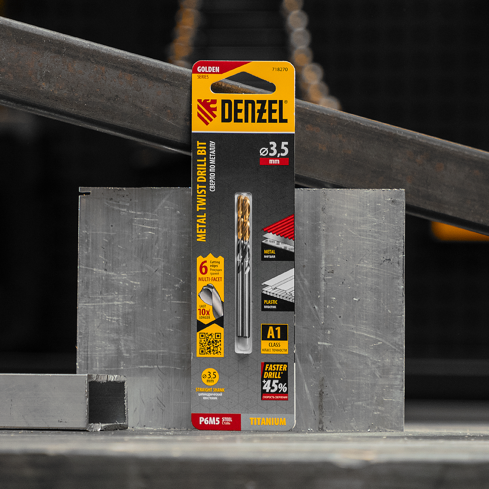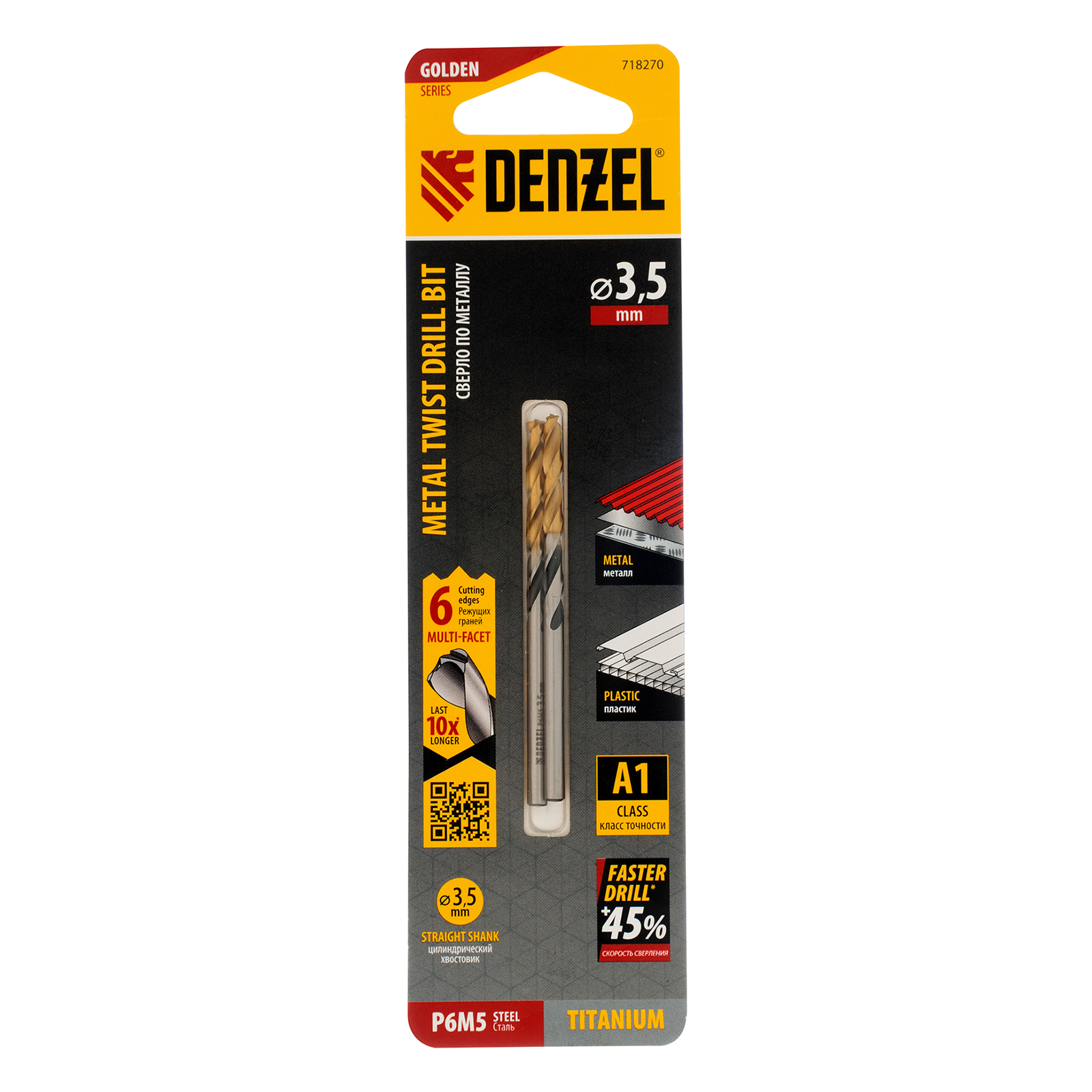 Спиральное сверло по металлу Denzel Golden Tip 718270 из стали P6M5, размером 3,5 х 70 мм, с многогранной заточкой, 2 штуки в упаковке, предназначено для получения отверстий в легированных сталях и цветных металлах. Многогранная заточка позволяет получать чистые и ровные отверстия практически без заусенцев. Сверлу присвоен класс точности A, что гарантирует высокое качество работ. Оснастка подходит для бытового и профессионального применения.