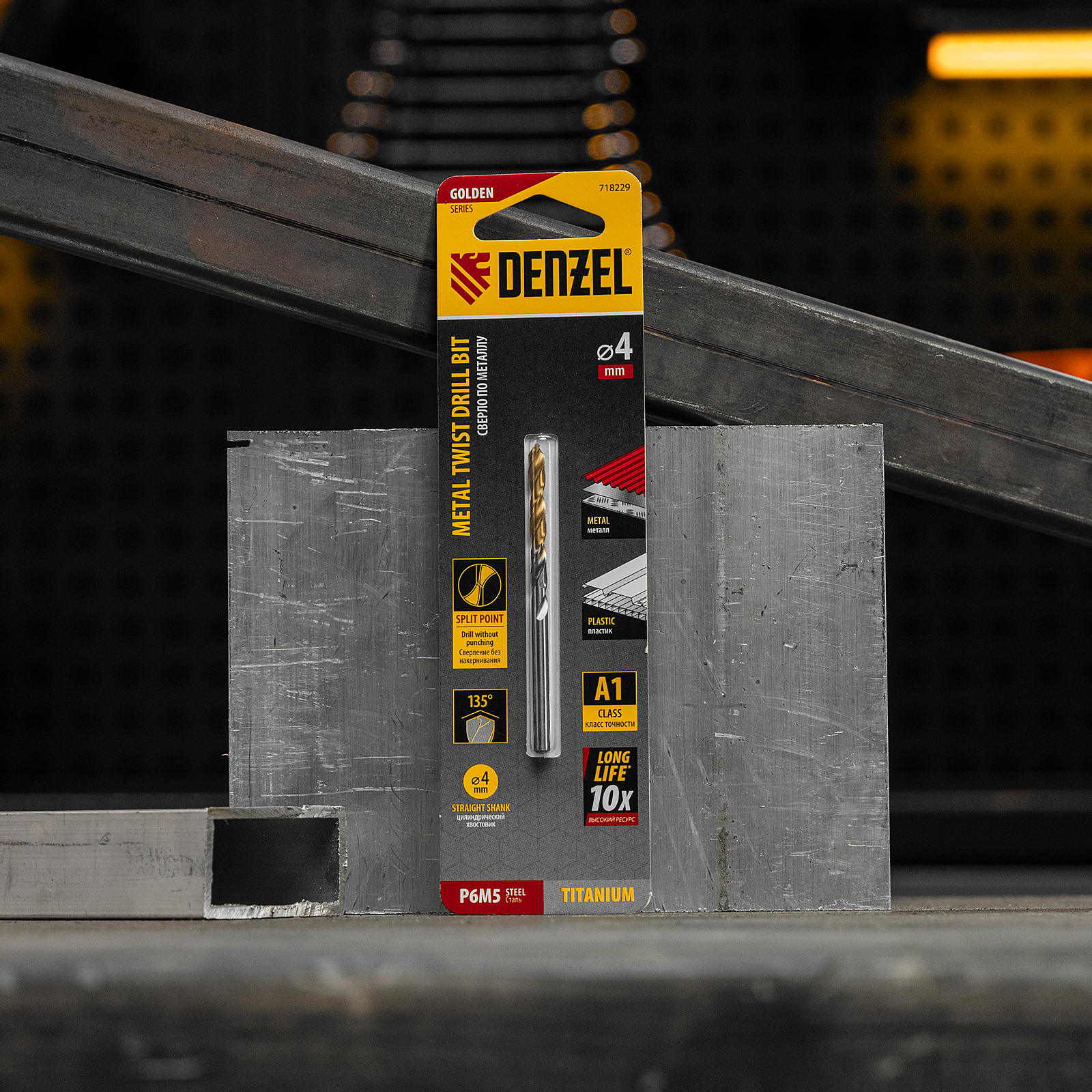 Спиральное сверло по металлу Denzel Golden Tip 718229 из стали P6M5, размером 4 х 75 мм, предназначено для получения отверстий в легированных и цветных металлах — меди, алюминии, мягкой бронзе, титане, латуни. Оснастка позволяет эффективно справляться с поставленными задачами благодаря оптимальному углу заточки 135°. Класс точности A гарантирует высокое качество полученных отверстий. Сверло используется для проведения монтажно-сборочных работ.