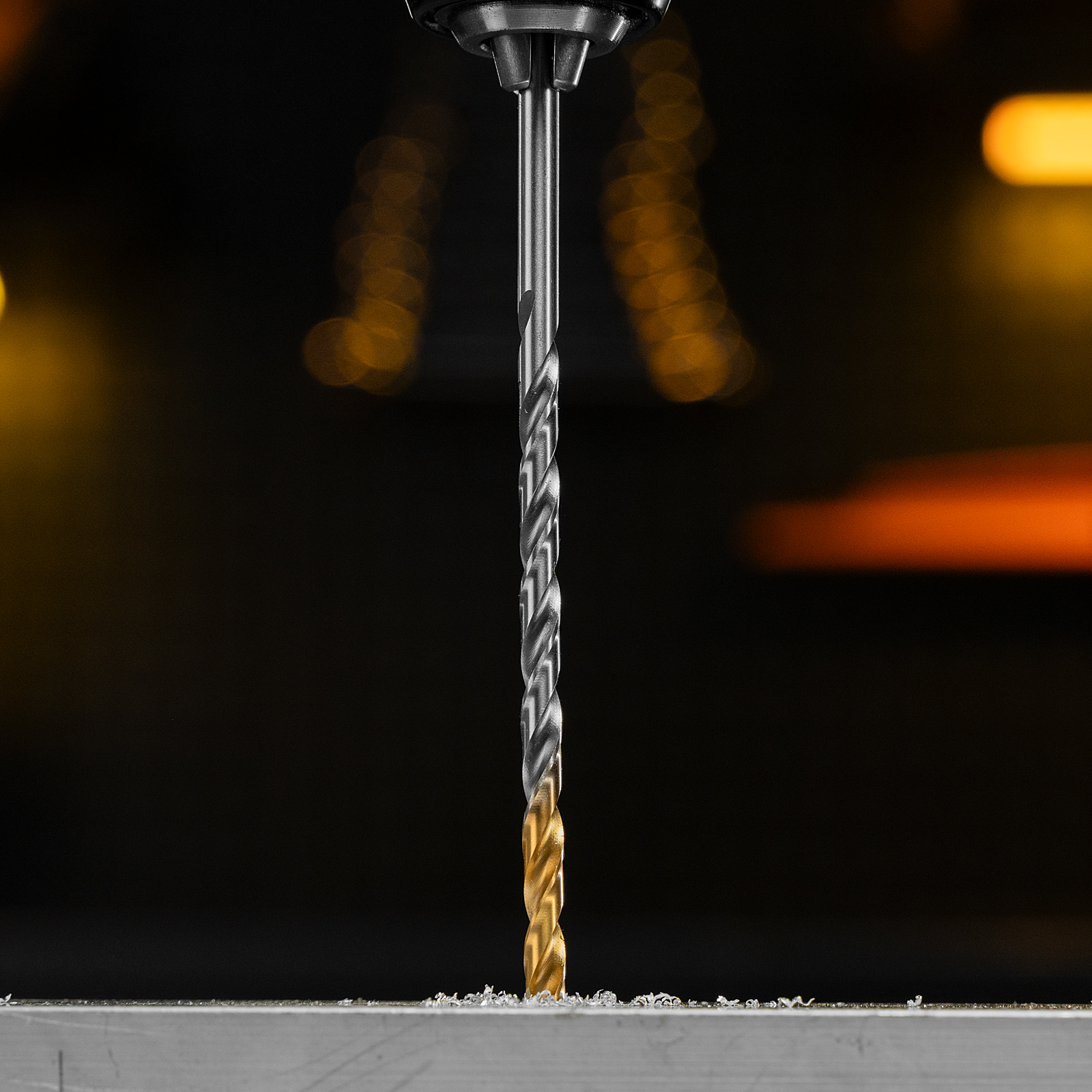- Высокая производительность — поверхность сверла покрыта нитридом титана, что снижает трение о стенки отверстия и уменьшает нагрев, а также улучшает отвод стружки.