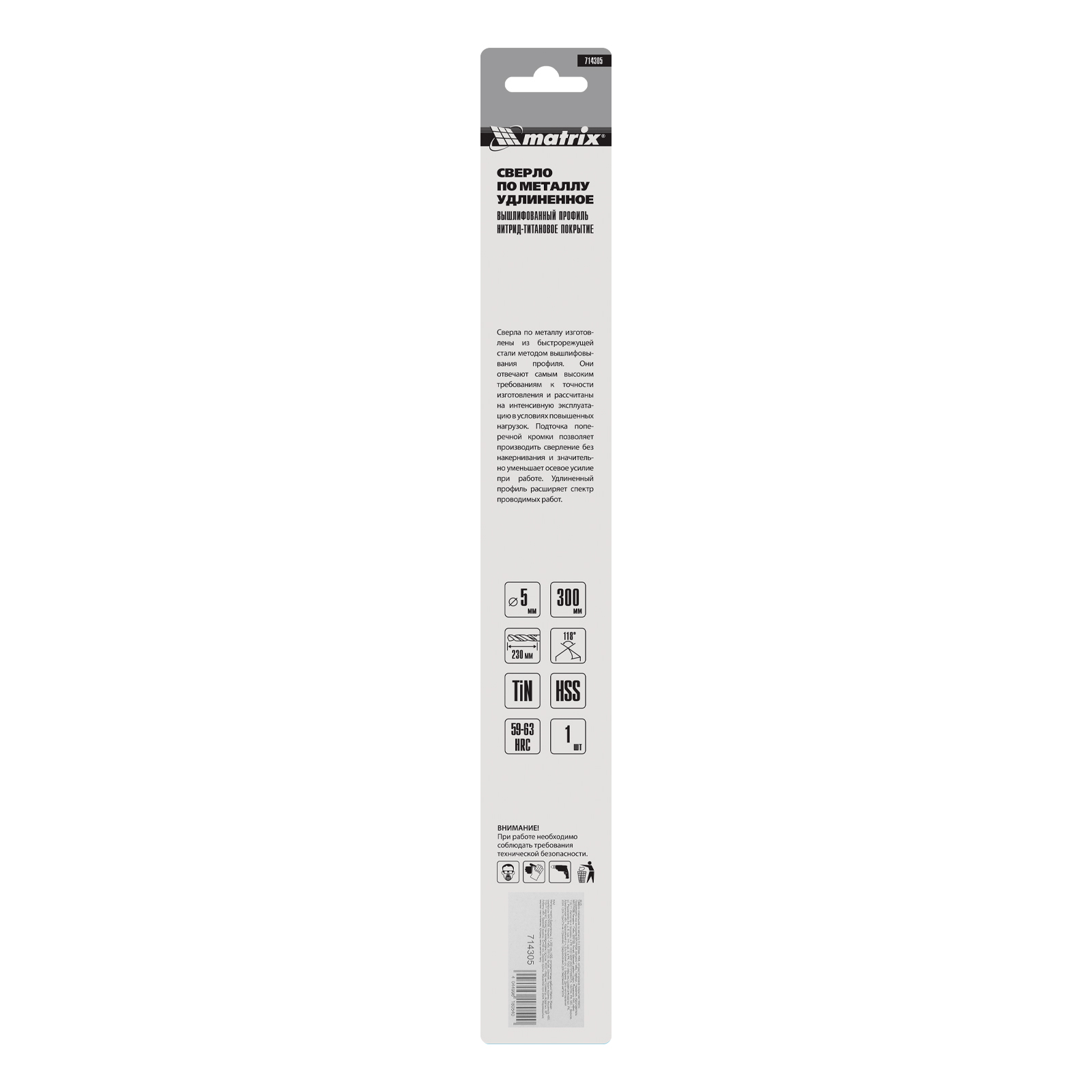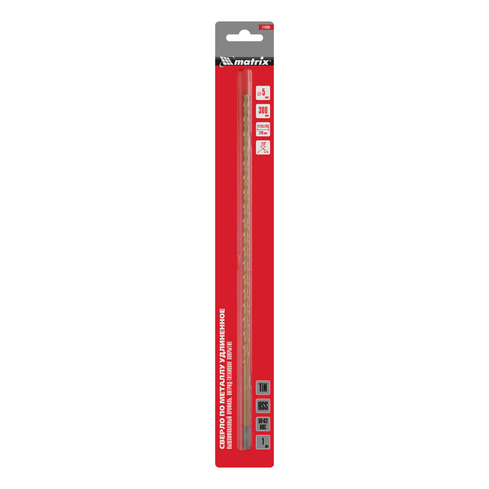 Спиральное сверло Matrix 714305 диаметром 5 мм, из стали HSS, с нитридтитановым покрытием и удлиненным профилем 300 мм, предназначено для получения глубоких отверстий в металле. Угол заточки 118° оптимален для работы с черными металлами, сталью, чугуном и твердой бронзой. Сверло испытывает уменьшенное осевое усилие во время работы, выдерживает интенсивные нагрузки и подходит для профессионального использования.