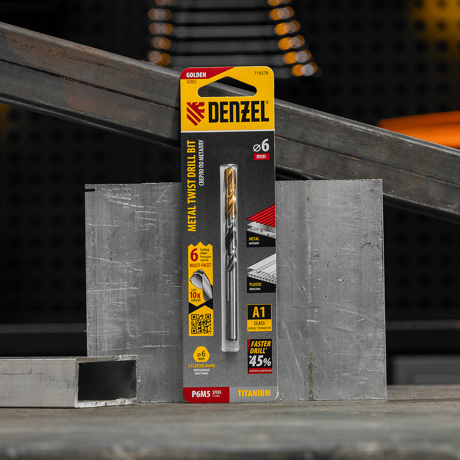 Спиральное сверло по металлу Denzel Golden Tip 718278 из стали P6M5, размером 6 х 93 мм, с многогранной заточкой, предназначено для получения отверстий в легированных сталях и цветных металлах. Многогранная заточка позволяет получать чистые и ровные отверстия практически без заусенцев. Сверлу присвоен класс точности A, что гарантирует высокое качество работ. Оснастка подходит для бытового и профессионального применения.