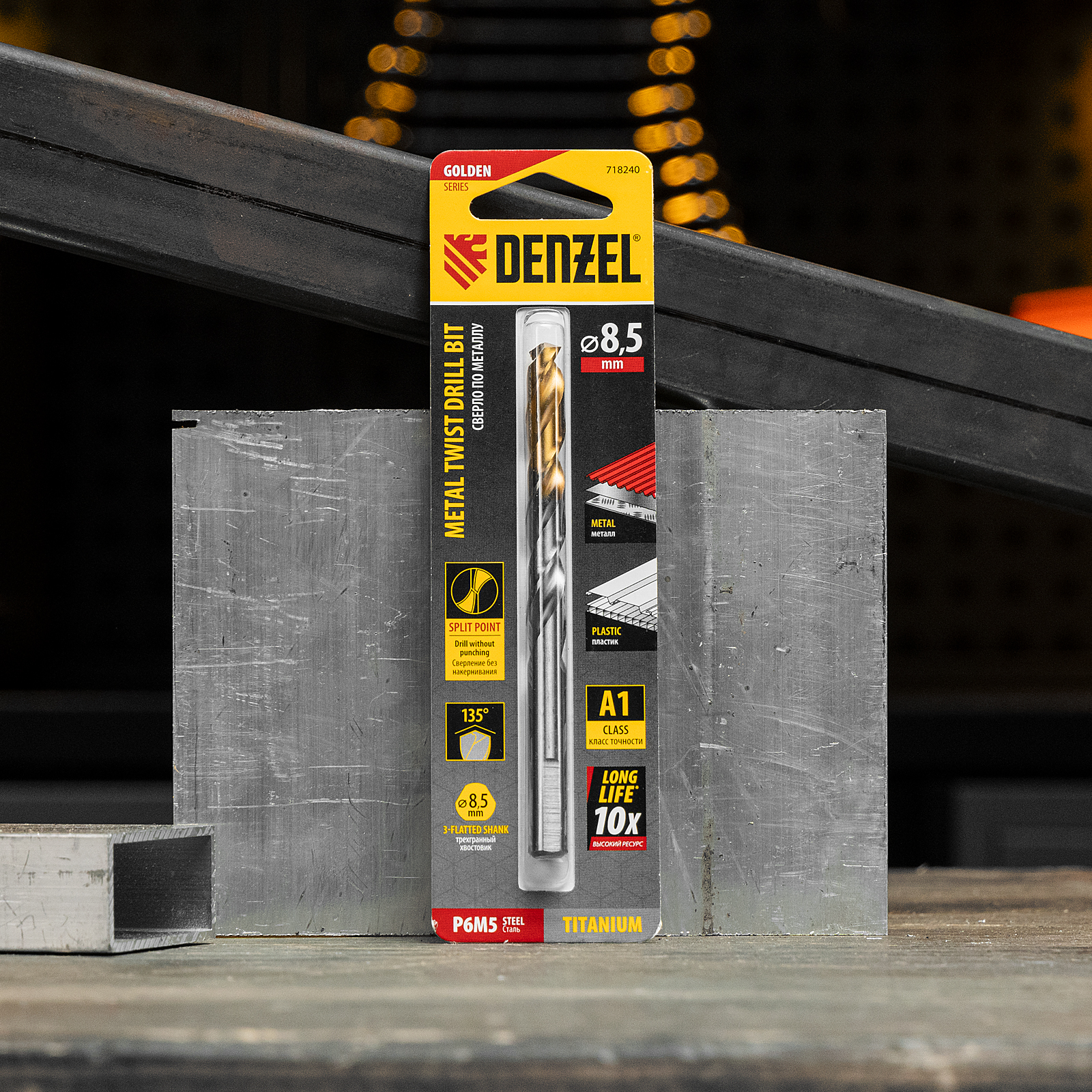 Спиральное сверло по металлу Denzel Golden Tip 718240 из стали P6M5, размером 8,5 х 117 мм, предназначено для получения отверстий в легированных и цветных металлах — меди, алюминии, мягкой бронзе, титане, латуни. Оснастка позволяет эффективно справляться с поставленными задачами благодаря оптимальному углу заточки 135°. Класс точности A гарантирует высокое качество полученных отверстий. Сверло используется для проведения монтажно-сборочных работ.