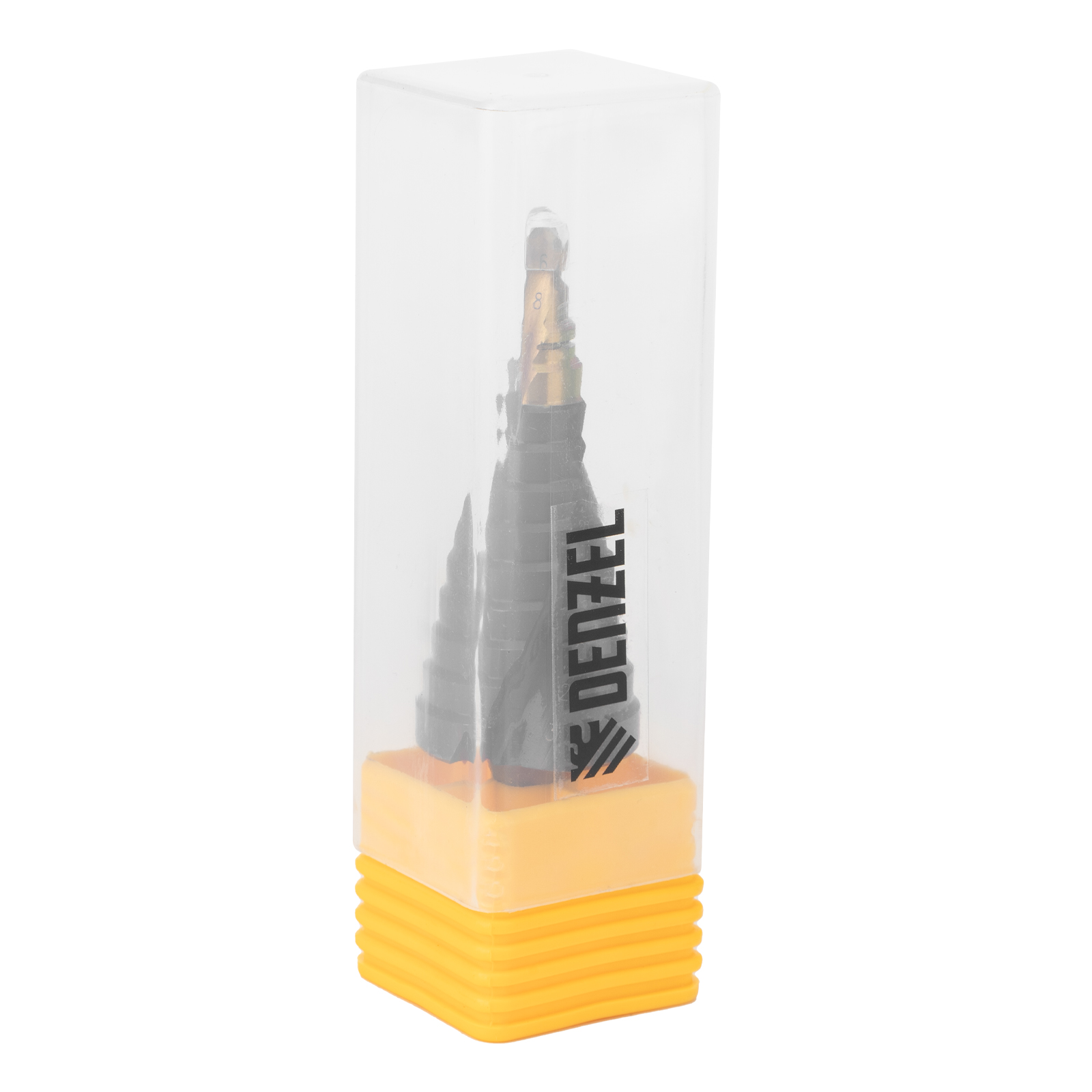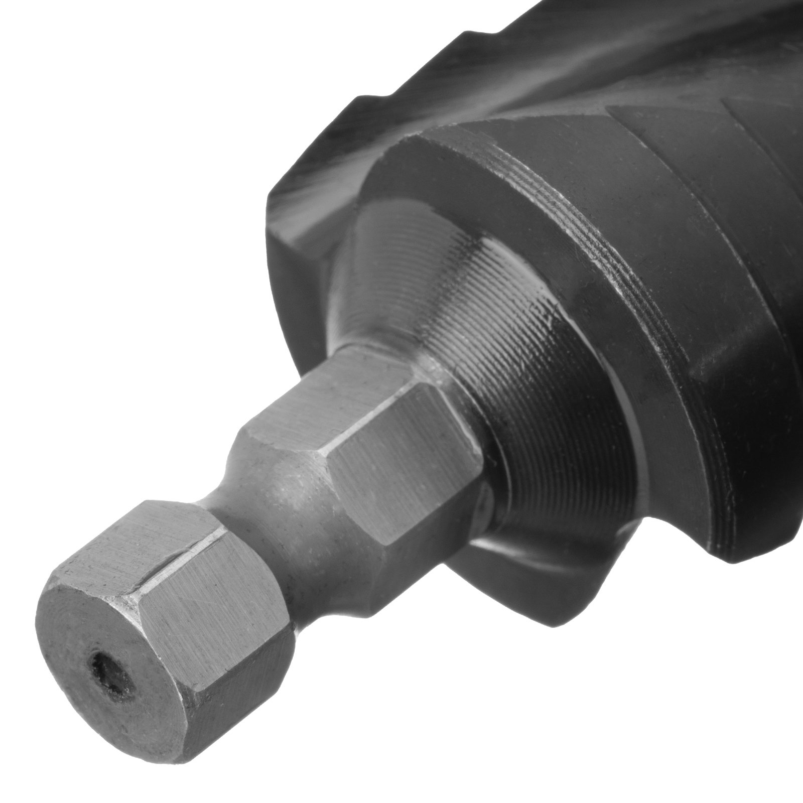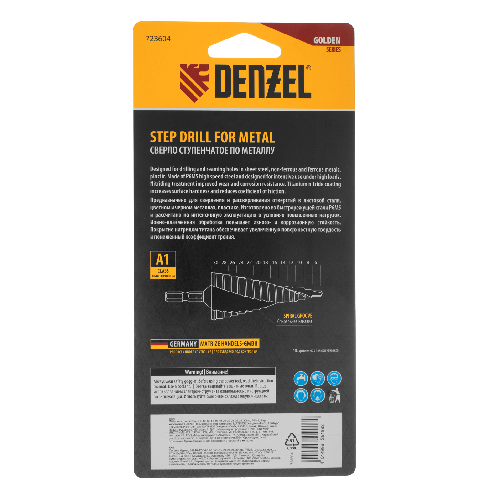 Ступенчатое сверло Denzel 723604 из стали P6M5, с 6-гранным хвостовиком, предназначено для сверления отверстий диаметром от 6 до 30 мм в сталях, цветных металлах и пластике. Избавляет от необходимости иметь при себе целый набор традиционных сверл. Позволяет получать отверстия с ровными краями и уже снятой фаской под гайку или болт. Оснастке присвоен класс точности A1. Сверло пригодится дома и в мастерской.