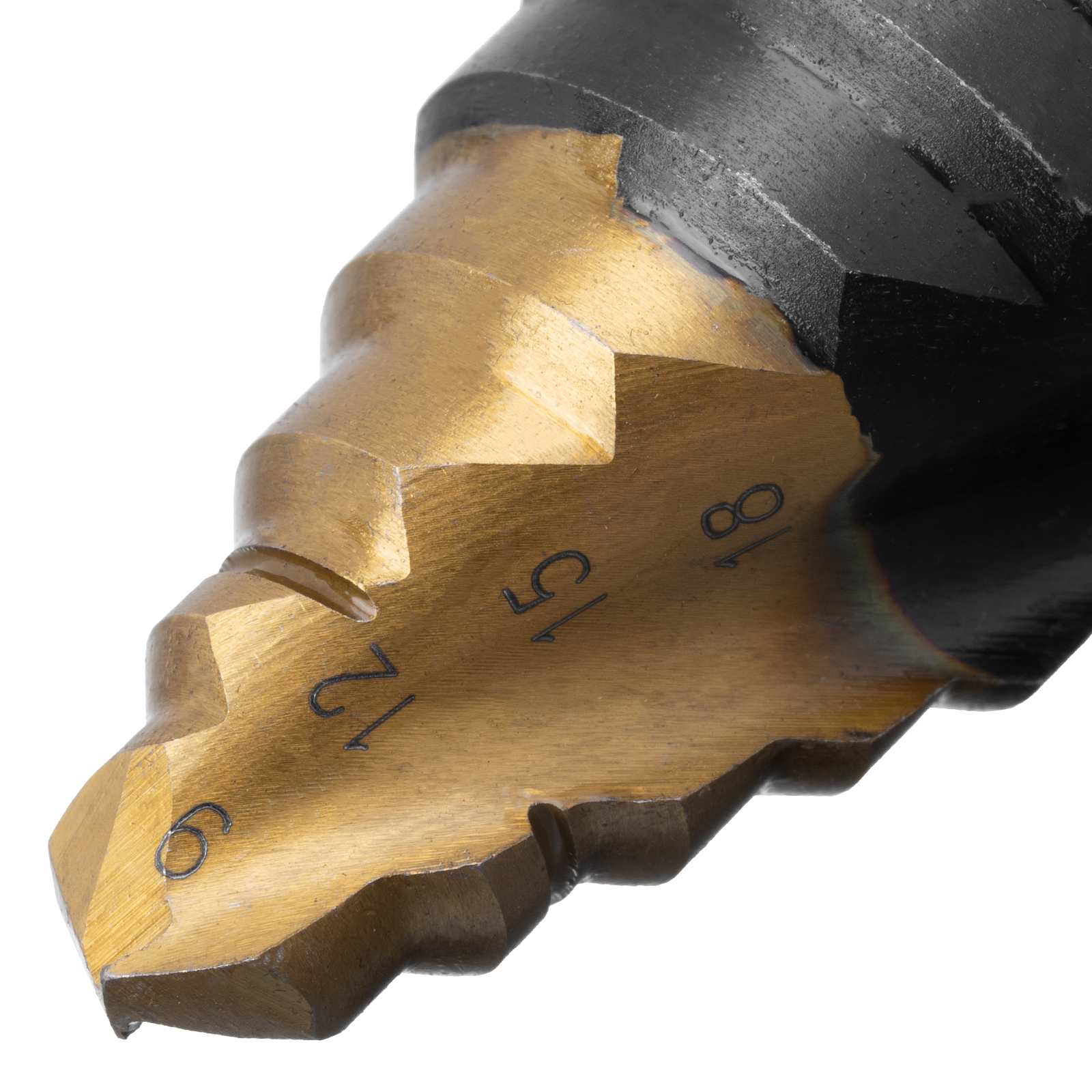 Ступенчатое сверло Denzel 723605 из стали P6M5, с 6-гранным хвостовиком, предназначено для сверления отверстий диаметром от 9 до 36 мм в сталях, цветных металлах и пластике. Избавляет от необходимости иметь при себе целый набор традиционных сверл. Позволяет получать отверстия с ровными краями и уже снятой фаской под гайку или болт. Оснастке присвоен класс точности A1. Сверло пригодится дома и в мастерской.
