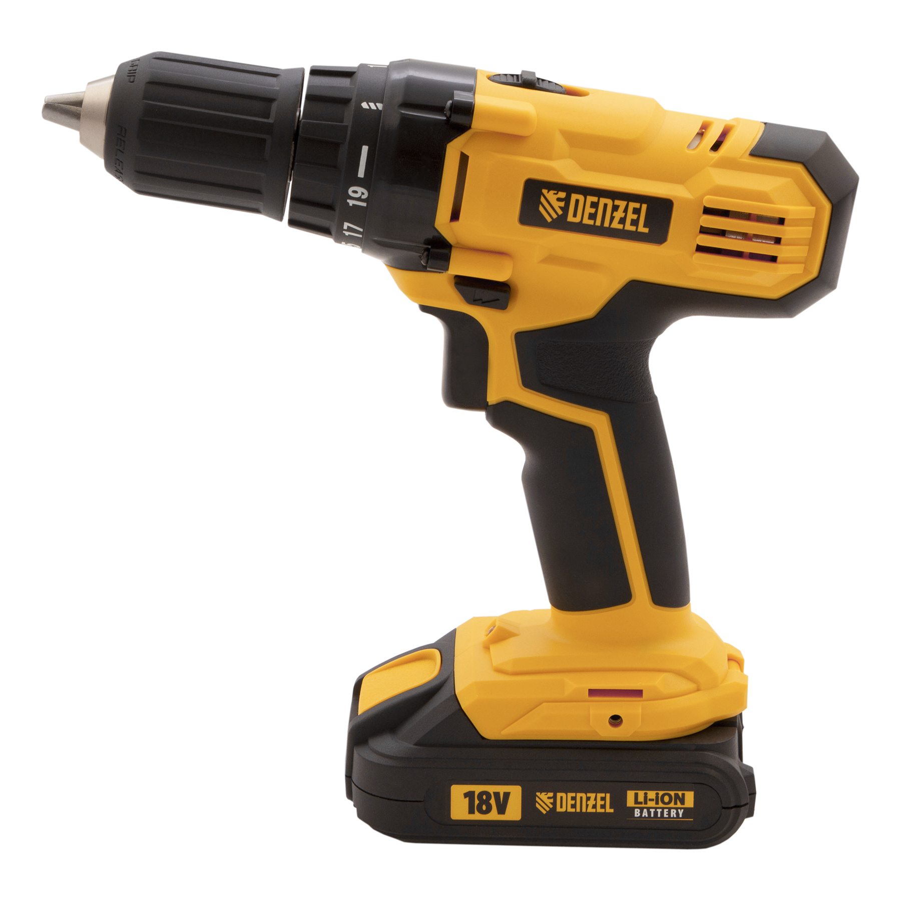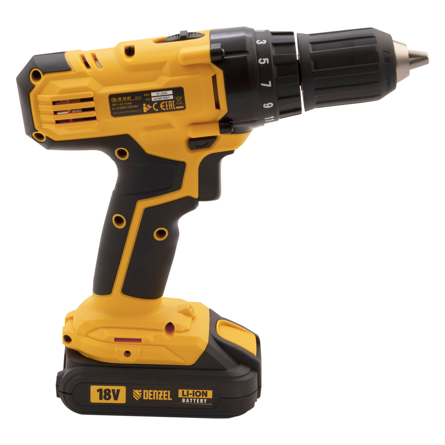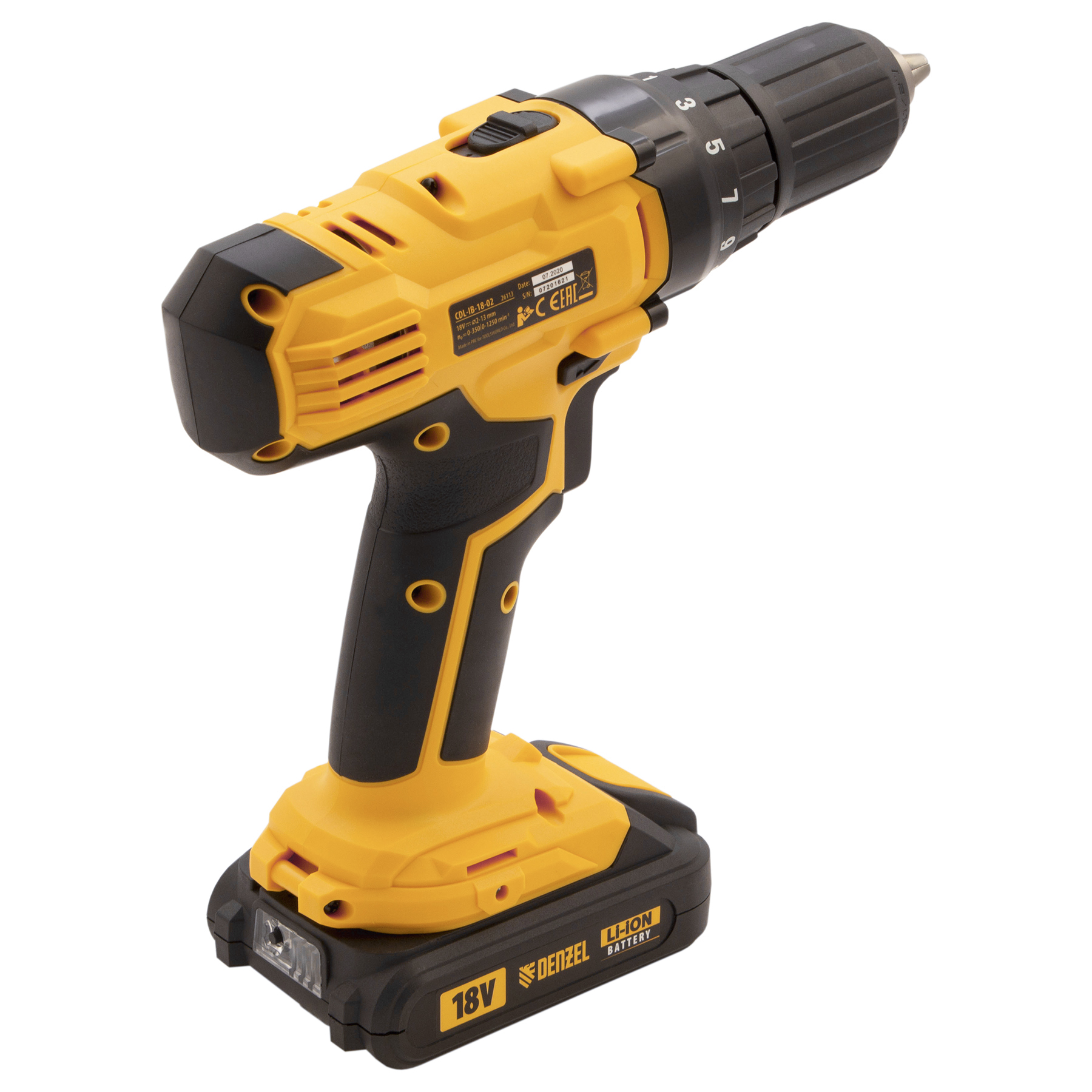 Аккумуляторная дрель-шуруповерт Denzel CDL-IB-18-02 26113 с 2 батареями Li-Ion 18 В, 1,5 А/ч, предназначена для закручивания/откручивания шурупов и винтов, а также для получения отверстий в металле, древесине, пластмассе и других конструкционных материалах. Подойдет для проведения мелких строительных работ и домашнего ремонта. Инструмент имеет два режима вращения 0-350 / 0-1250 об/мин, благодаря чему успешно справляется с разными задачами.
