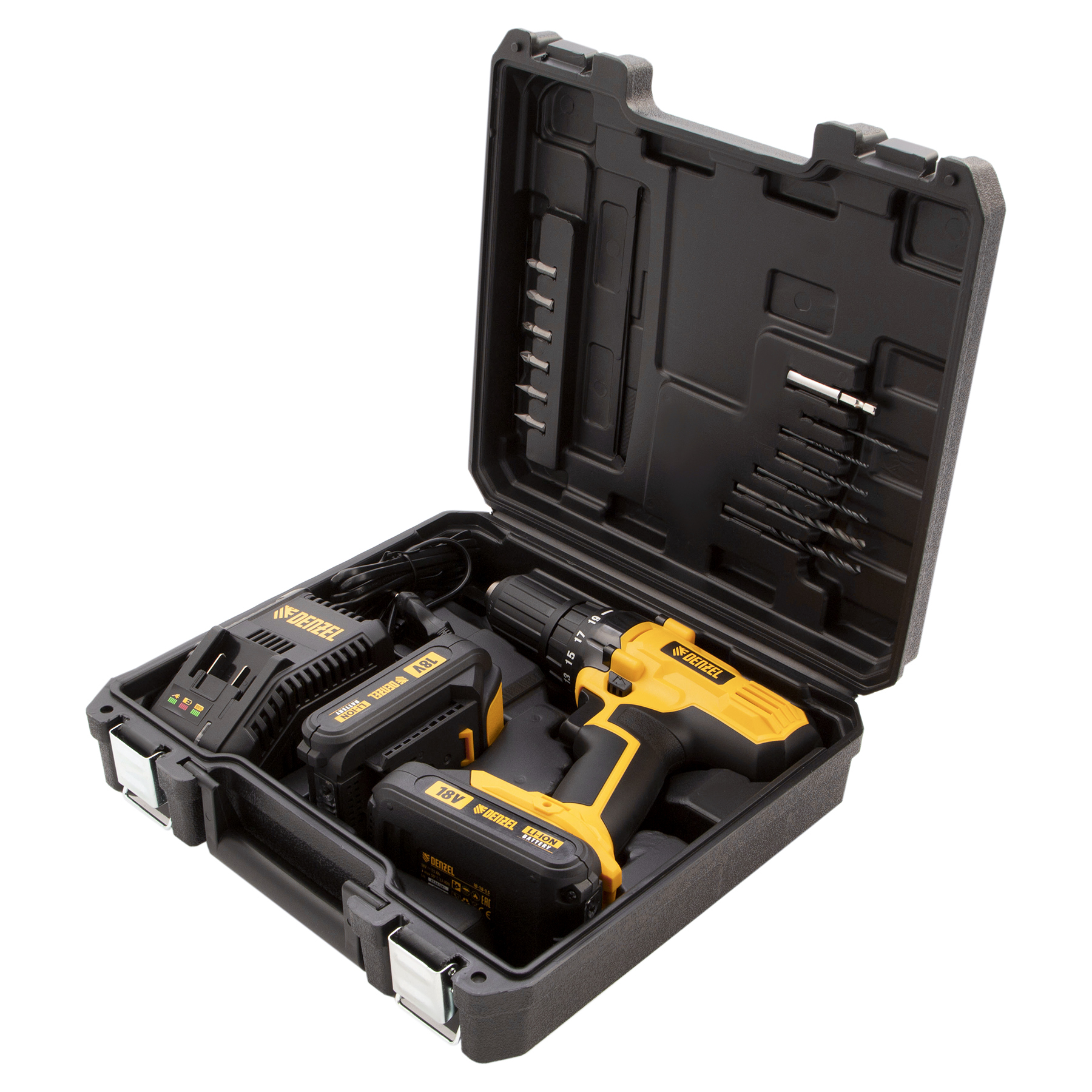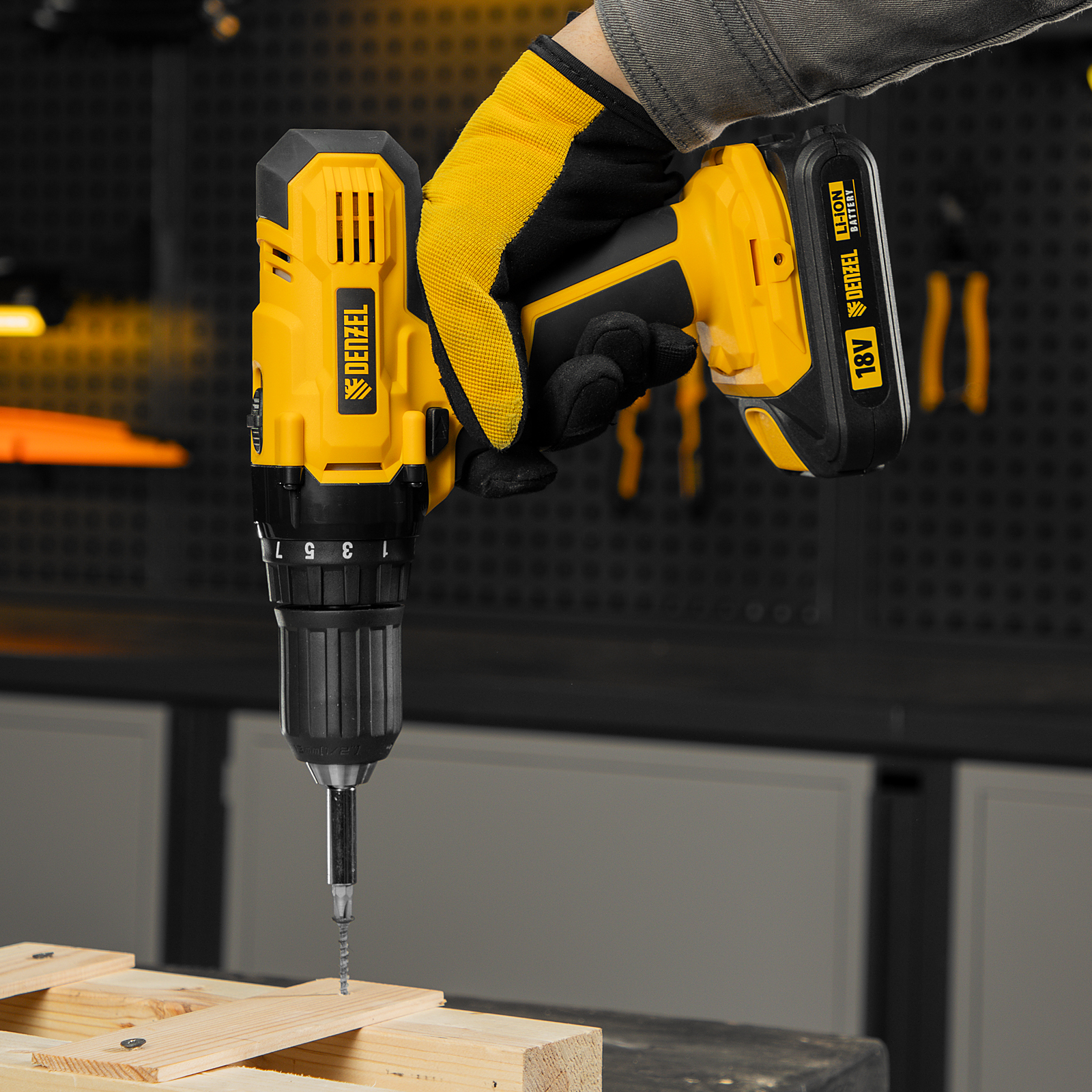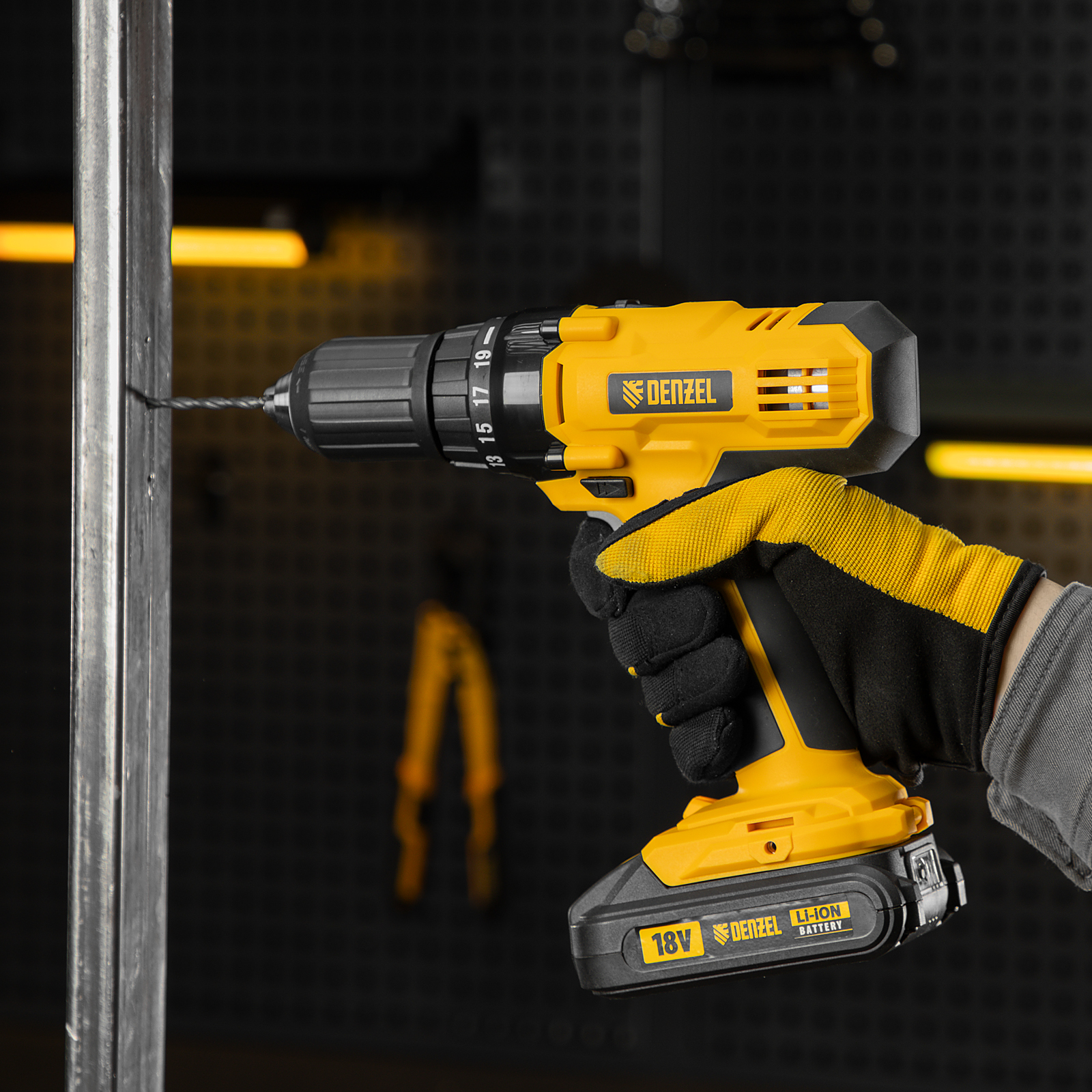 Аккумуляторная дрель-шуруповерт Denzel CDL-IB-18-02 26113 с 2 батареями Li-Ion 18 В, 1,5 А/ч, предназначена для закручивания/откручивания шурупов и винтов, а также для получения отверстий в металле, древесине, пластмассе и других конструкционных материалах. Подойдет для проведения мелких строительных работ и домашнего ремонта. Инструмент имеет два режима вращения 0-350 / 0-1250 об/мин, благодаря чему успешно справляется с разными задачами.