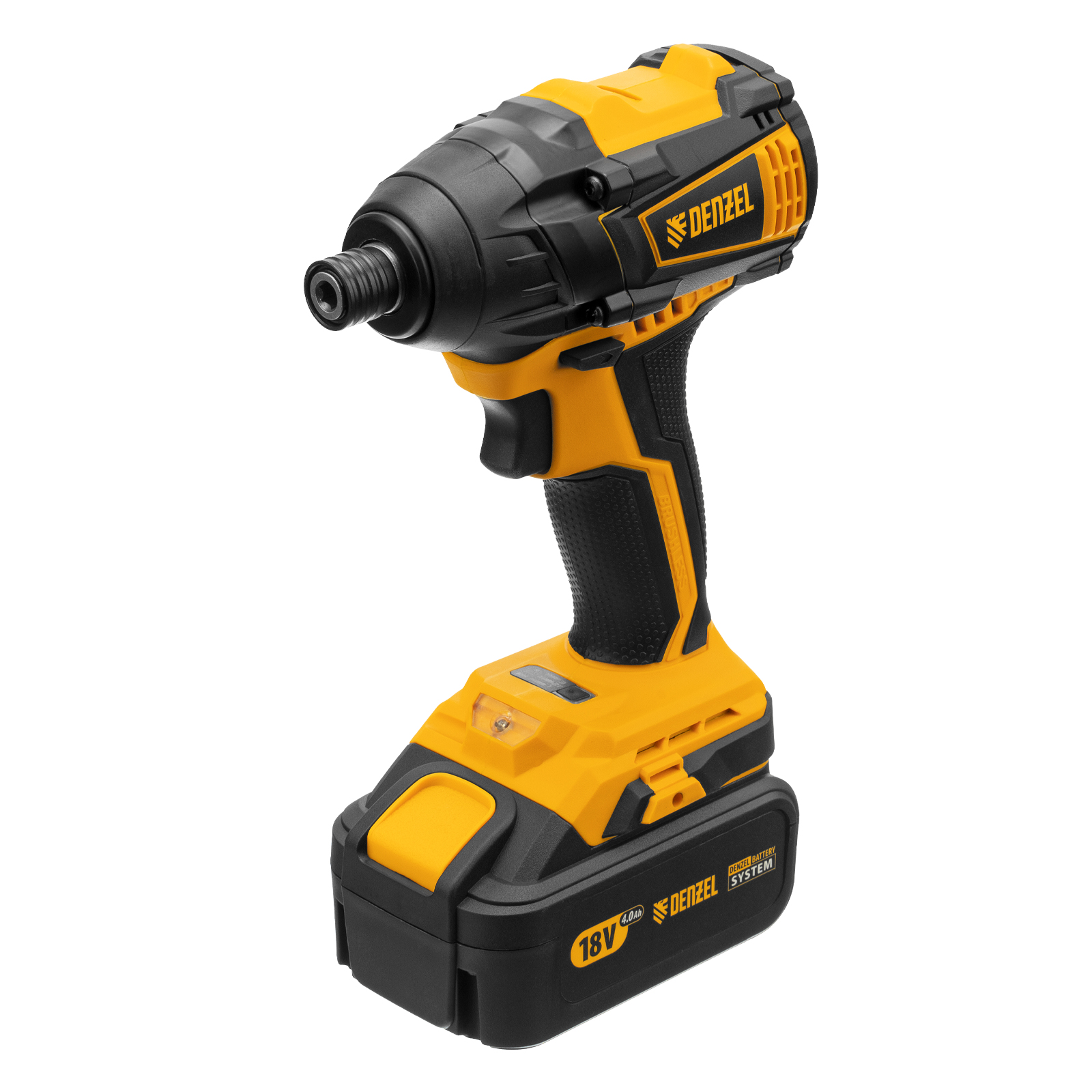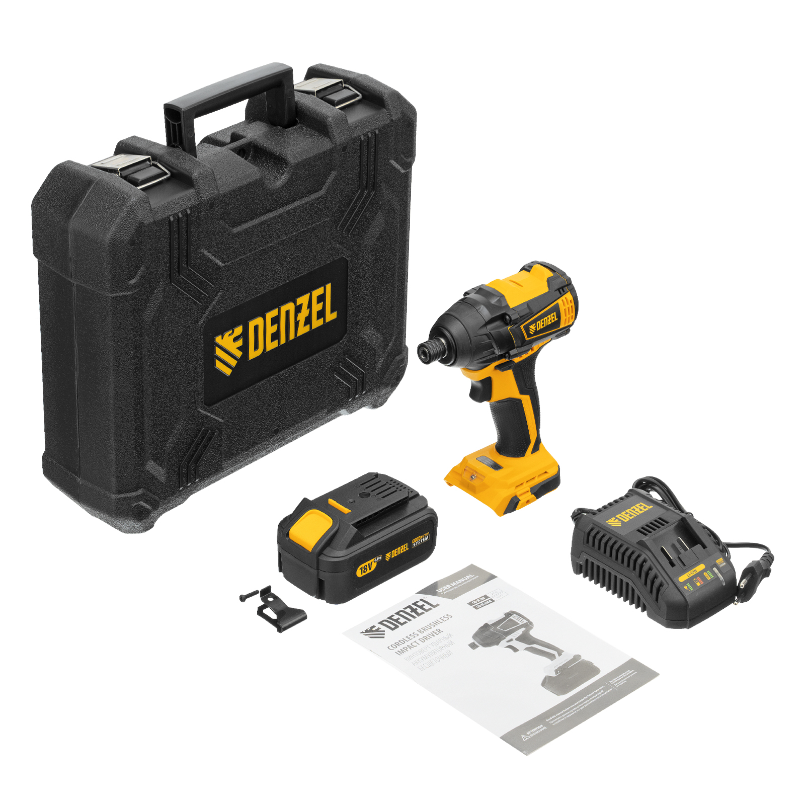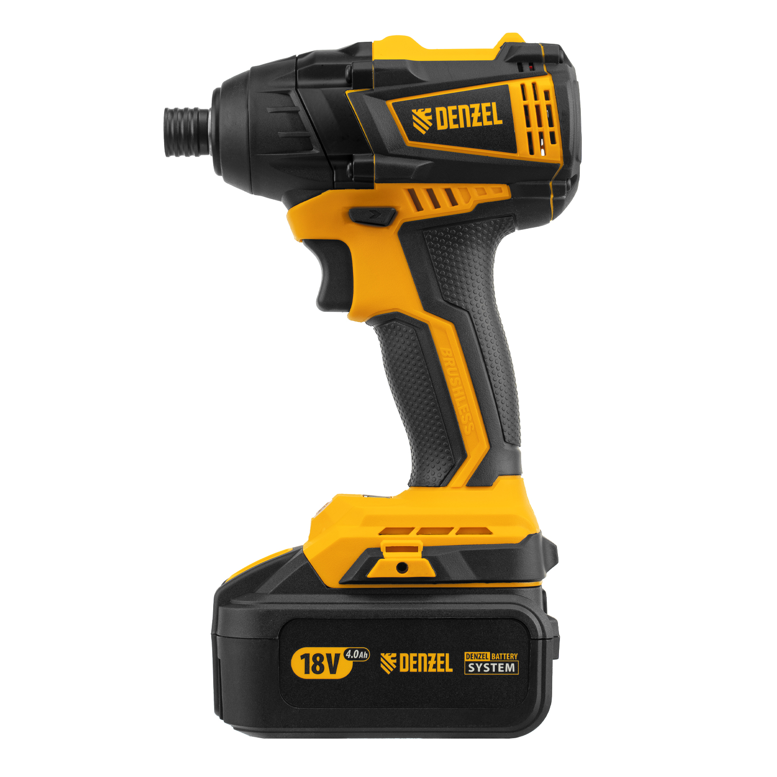 Ударный аккумуляторный винтоверт Denzel CID-IB-200 26510 с бесщеточным двигателем работает от батареи Li-Ion с рабочим напряжением 18 В и предназначен для завинчивания и отвинчивания винтов и шурупов, а также затягивания и откручивания гаек. Эффективен для демонтажа перетянутого и закисшего крепежа, закручивания длинных болтов и шурупов. Пригодится для сборки мебели и различных конструкций.,Аккумуляторный винтоверт не зависит от стационарного источника энергии. Интеллектуальная батарея емкостью 4 А/ч с защитой от перезаряда и глубокого разряда не имеет эффекта памяти, благодаря чему обеспечивает стабильную работу инструмента на протяжении длительного времени.