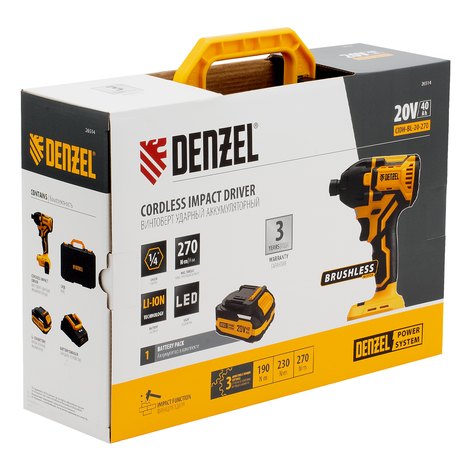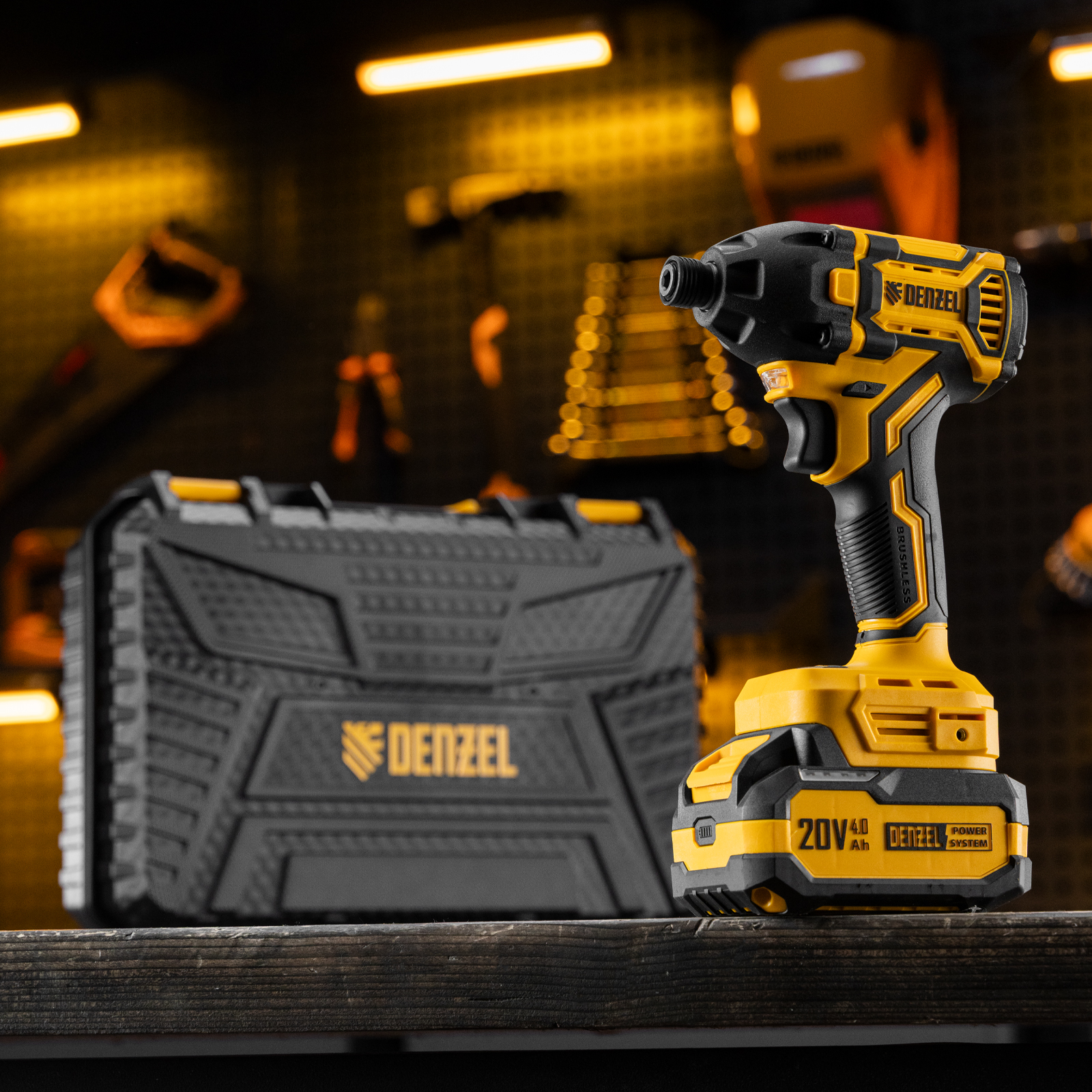 - Универсальность — аккумулятор Li-Ion емкостью 4 А·ч совместим со всеми инструментами единой платформы Denzel Power System 20V.