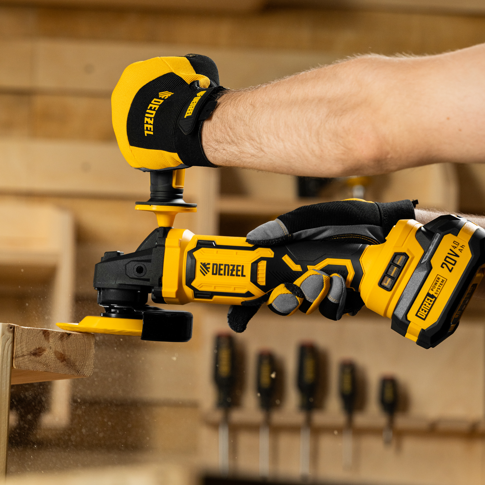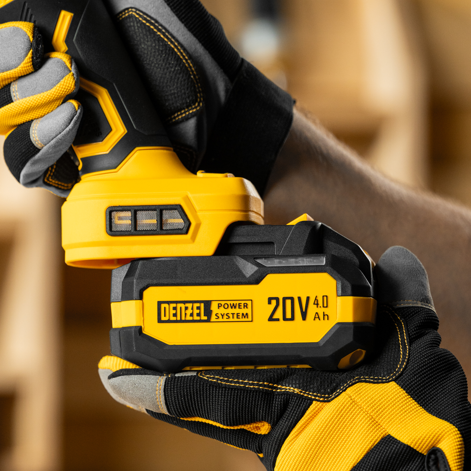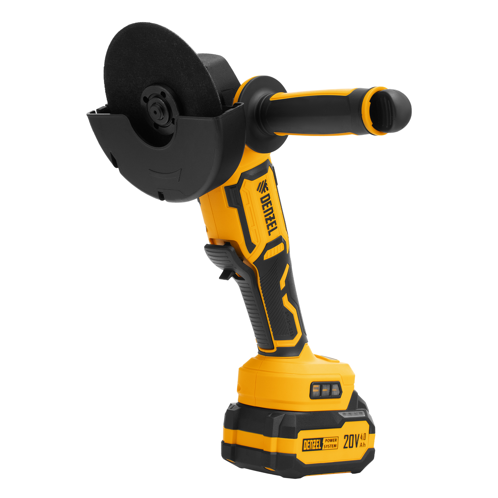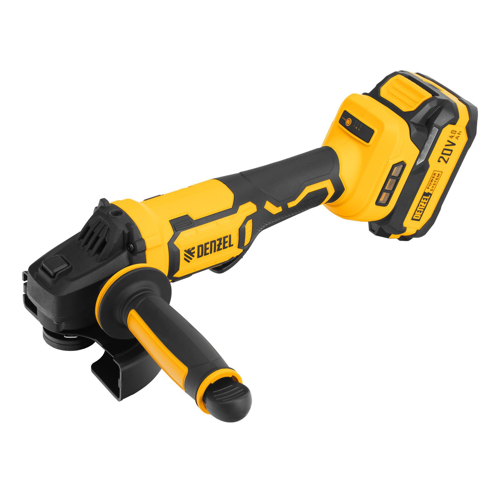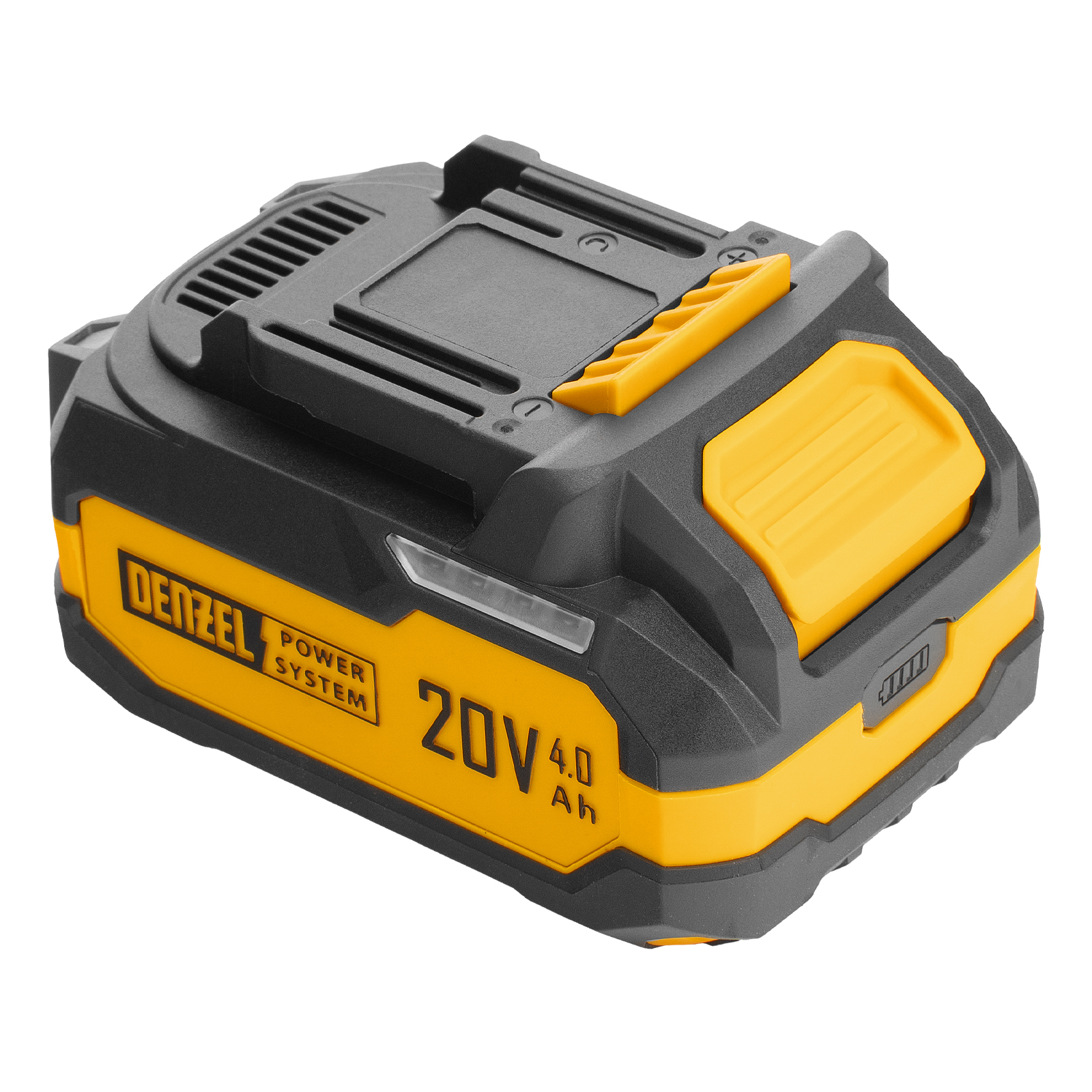 - Универсальность — аккумулятор Li-Ion емкостью 4 А·ч совместим со всеми инструментами единой платформы Denzel Power System 20V.