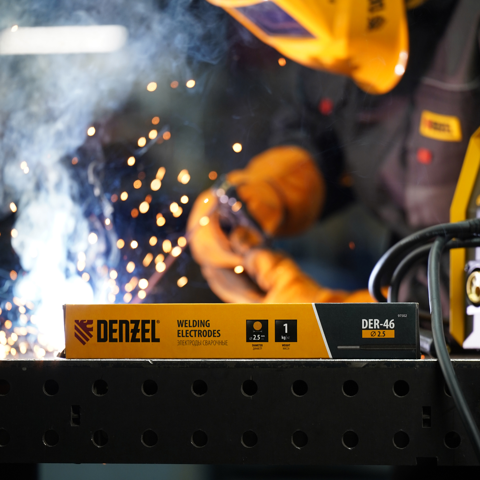 Электроды Denzel 97502 марки DER-46, диаметром 2,5 мм, с рутиловым покрытием красного цвета, 1 кг в упаковке, предназначены для ручной дуговой сварки деталей из углеродистых и низколегированных конструкционных сталей толщиной до 5 мм при максимальном токе 140 А. Позволяют получать швы, устойчивые к вибрациям и воздействию агрессивных сред. Толщина обмазки выше, чем у аналогичных электродов других торговых марок, что обеспечивает высокое качество шва. Электроды подходят для создания нахлестных, угловых и стыковых соединений в рядовых конструкциях, потолочных и вертикальных швов, оптимальны для сварки газовых и водопроводных труб с низким давлением.