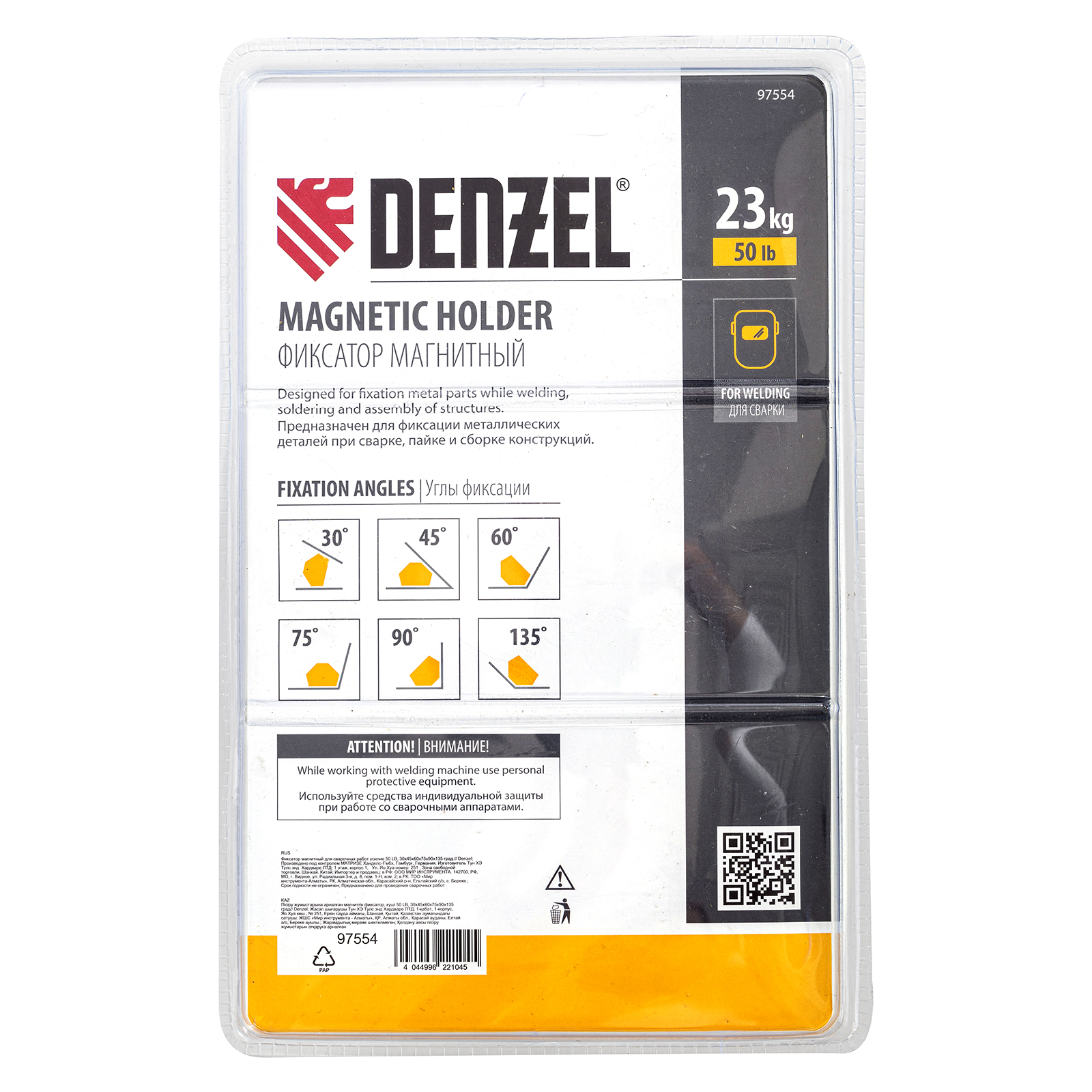 Фиксатор магнитный Denzel 97554 выдерживает усилие 50 LB (23 кг), позволяет соединять металлические детали разного размера под углом 30°, 45°, 60°, 75°, 90° и 135° и используется при проведении сварочных работ.