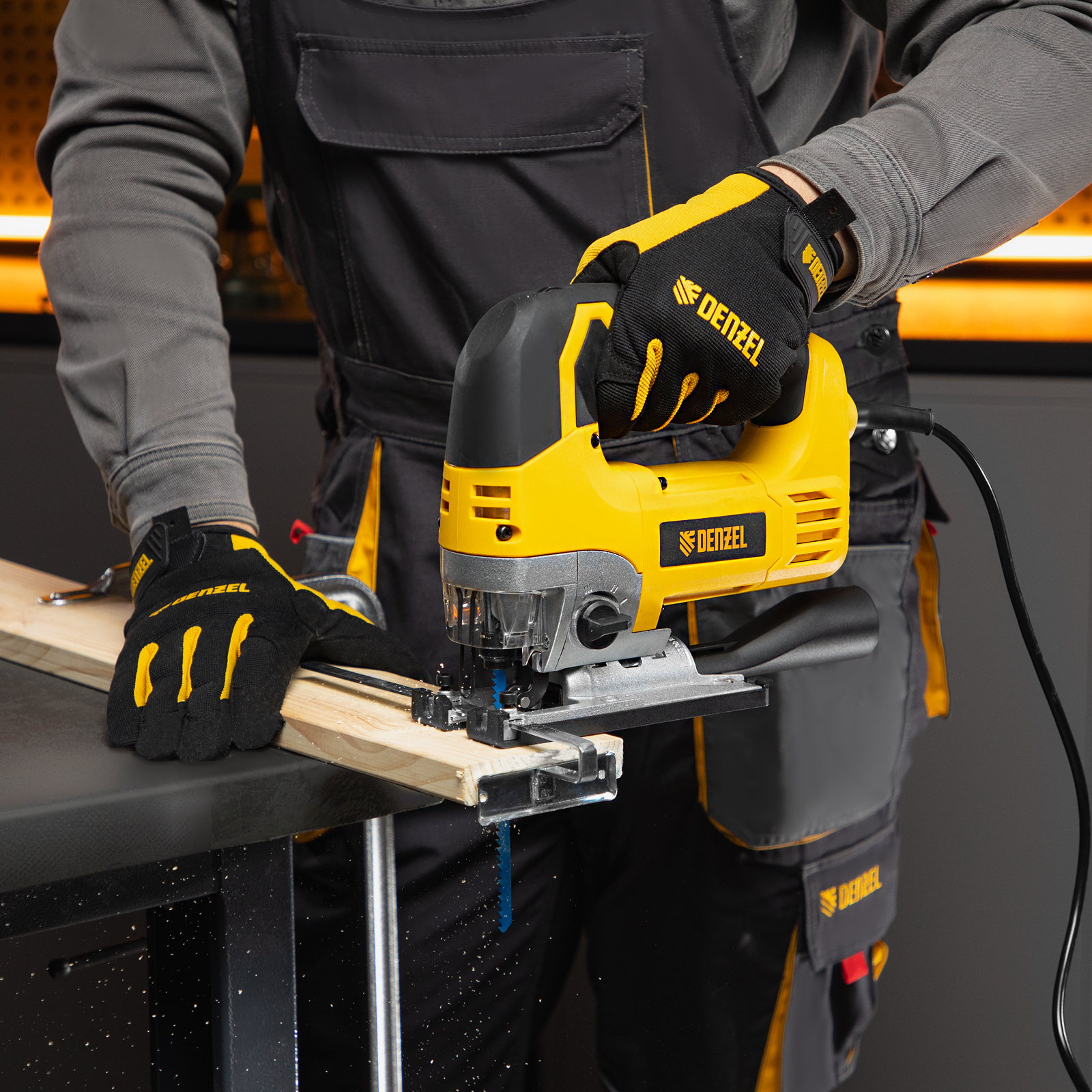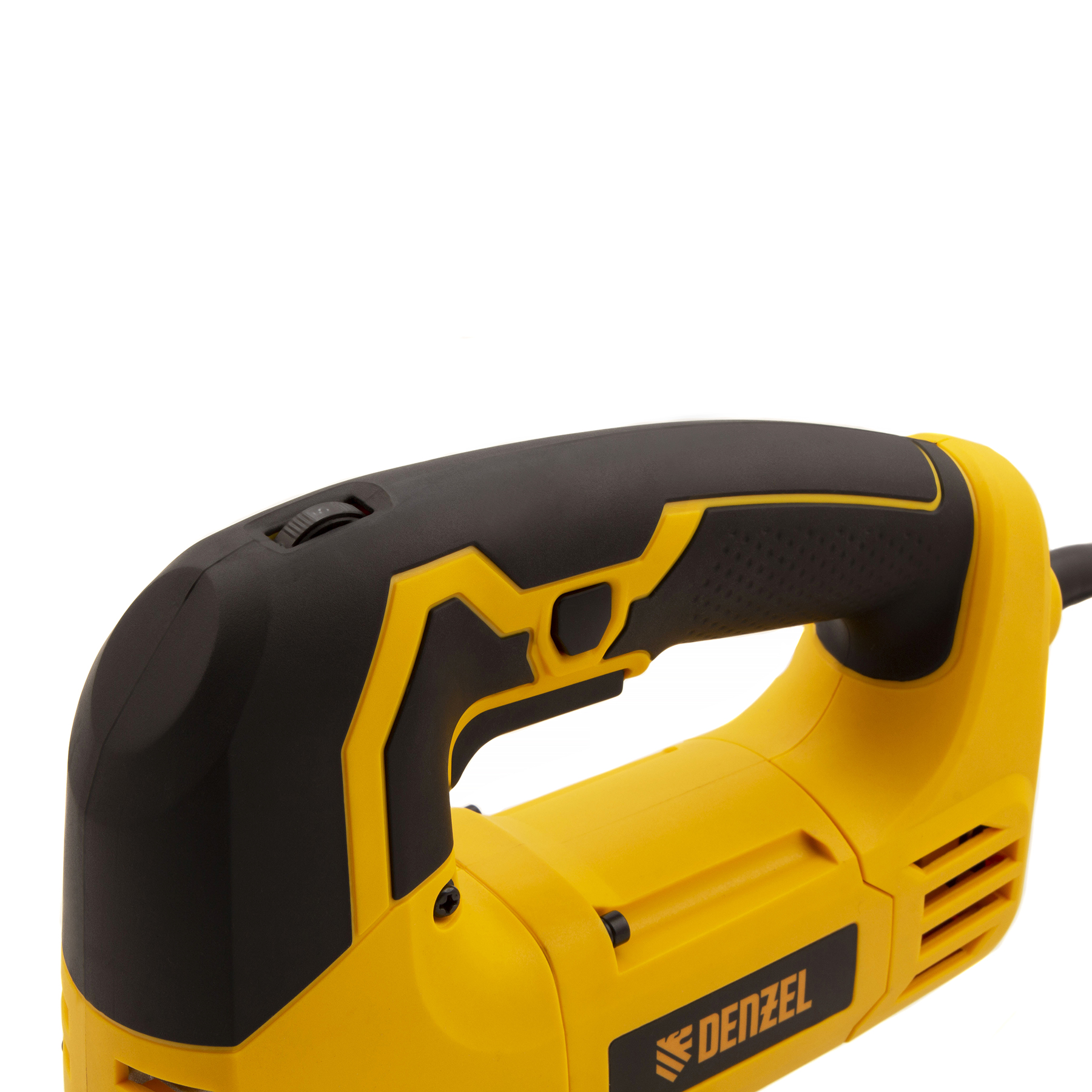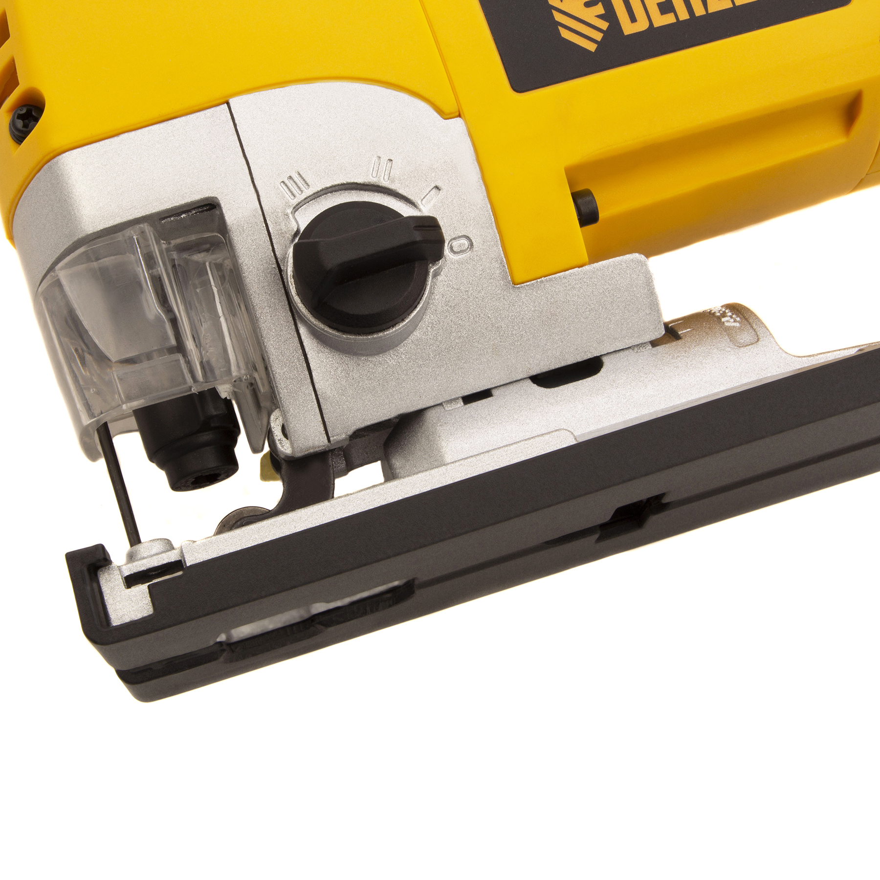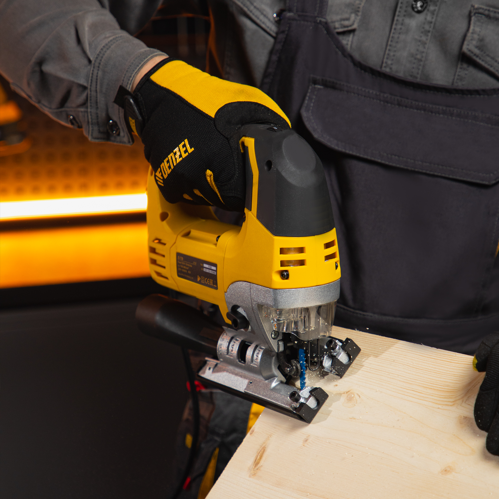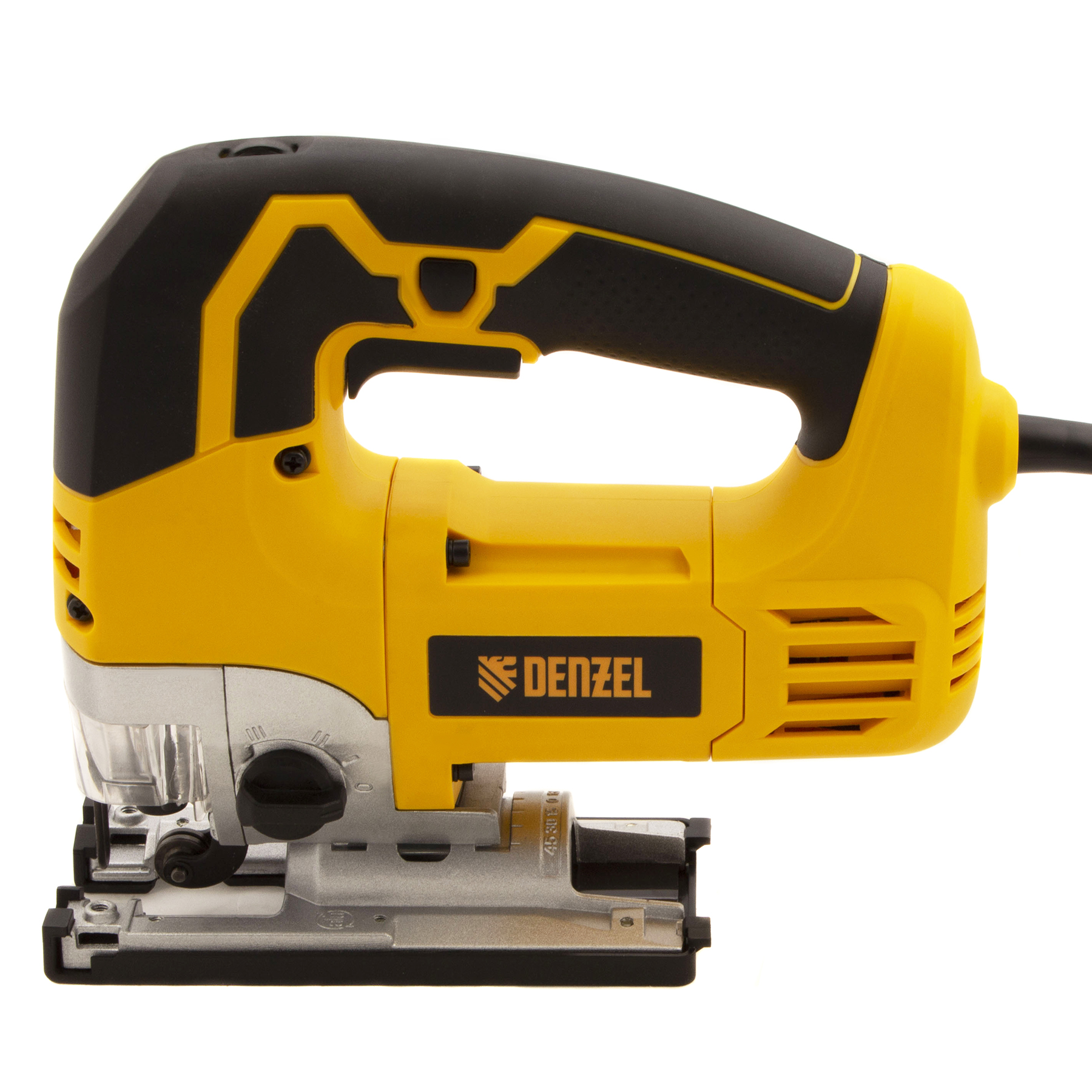 Электрический лобзик Denzel JS-110 27107 мощностью 750 Вт предназначен для прямого и фигурного реза листовых материалов из металла, древесины, и пластмассы, а также для вырезки варочных панелей или отверстий под мойки в столешницах. Это наиболее производительная модель в линейке производителя. Электродвигатель Denzel обеспечивает частоту хода пильного полотна в диапазоне 1100-3000 ход/мин. Максимальная глубина пропила составляет: до 110 мм для древесины, до 25 мм для цветных металлов и до 10 мм для стали. Угол наклона подошвы регулируется, что позволяет совершать пропилы под углом до 45°. Лобзик подключается к сети, поэтому время работы не ограничено.