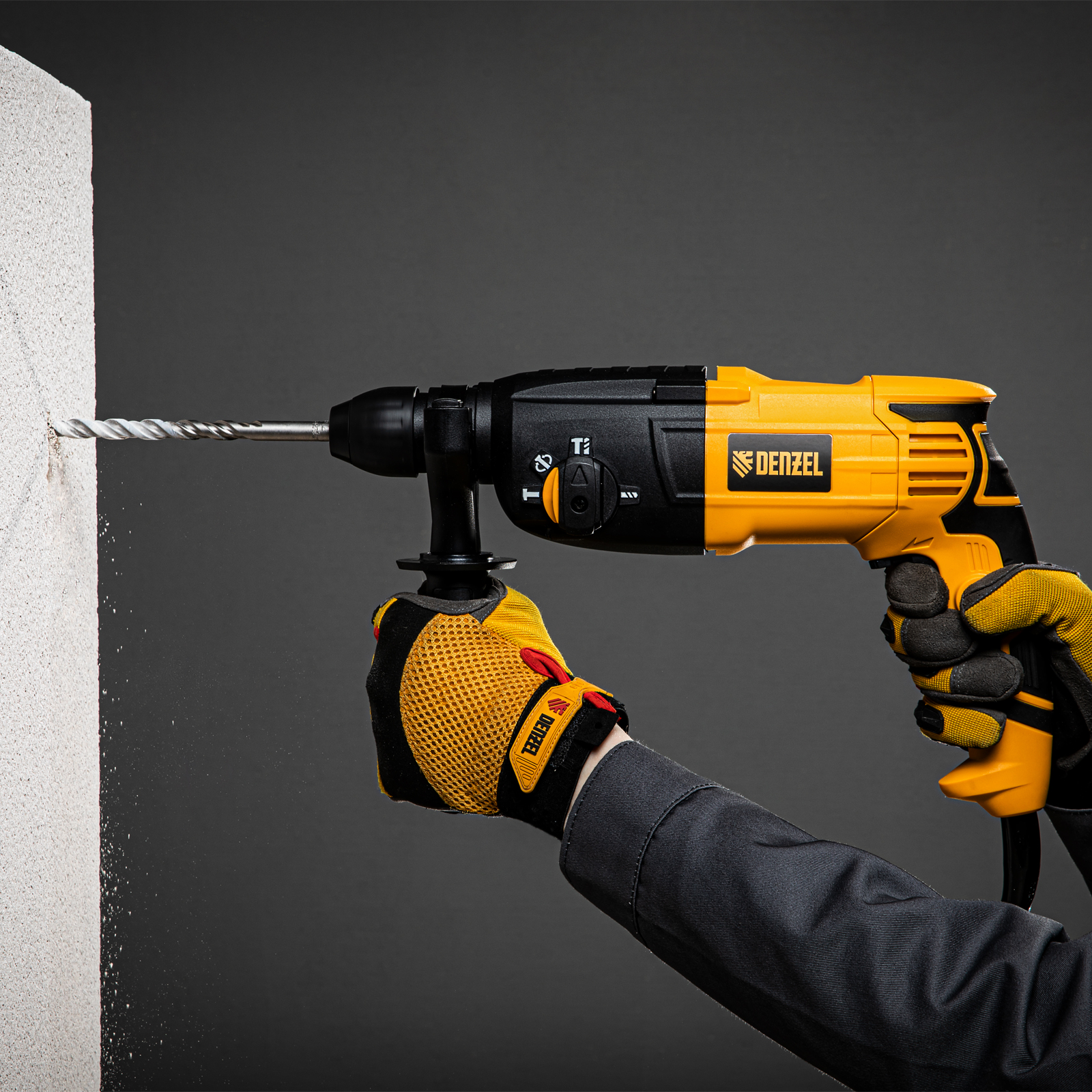 Электрический перфоратор Denzel RH-750-24 26605 мощностью 750 Вт, с патроном под хвостовик SDS-plus, имеет 3 режима, развивает энергию удара 2,5 Дж и используется для проведения отделочных и монтажных работ в режиме сверления, бурения и долбления. Эффективно работает с твердыми материалами. Максимальный диаметр отверстий в бетоне составляет 24 мм, в древесине — 40 мм, металле — 13 мм.
