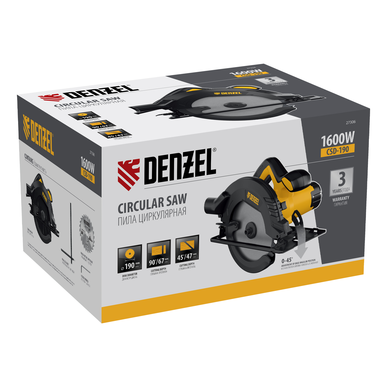 Циркулярная пила Denzel CSD-190 27306 мощностью 1600 Вт используется для продольного и поперечного распиливания древесины. Совместима с пильными дисками диаметром 190 мм. Шарнирное крепление режущего узла позволяет регулировать глубину пропила, а также угол наклона в диапазоне 0-45°. Максимальная глубина пропила под углом 90° составляет 67 мм, под углом 45° — 47 мм, быстрая регулировка глубины пропила повышает эффективность работы. Пила оптимальна для бытового использования.