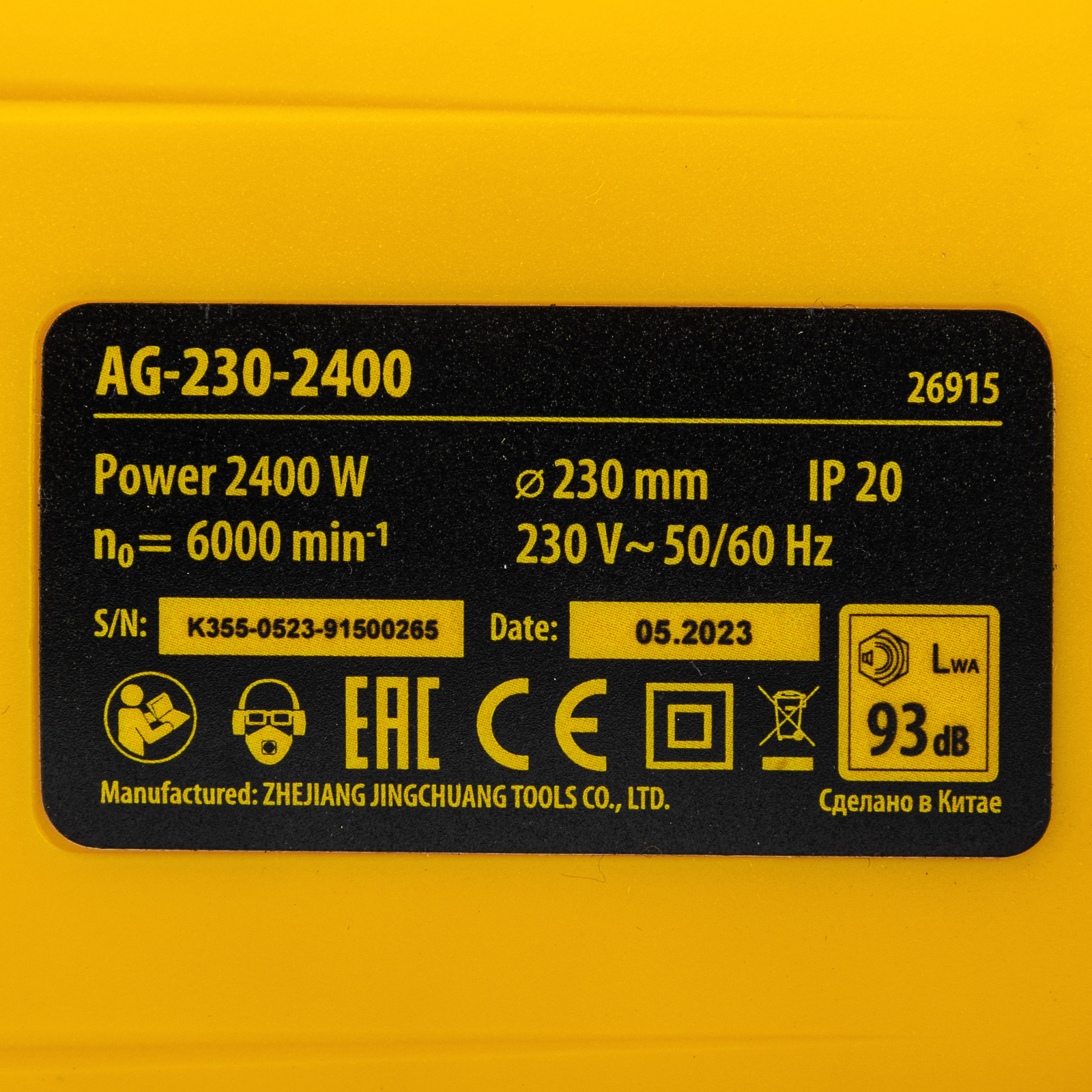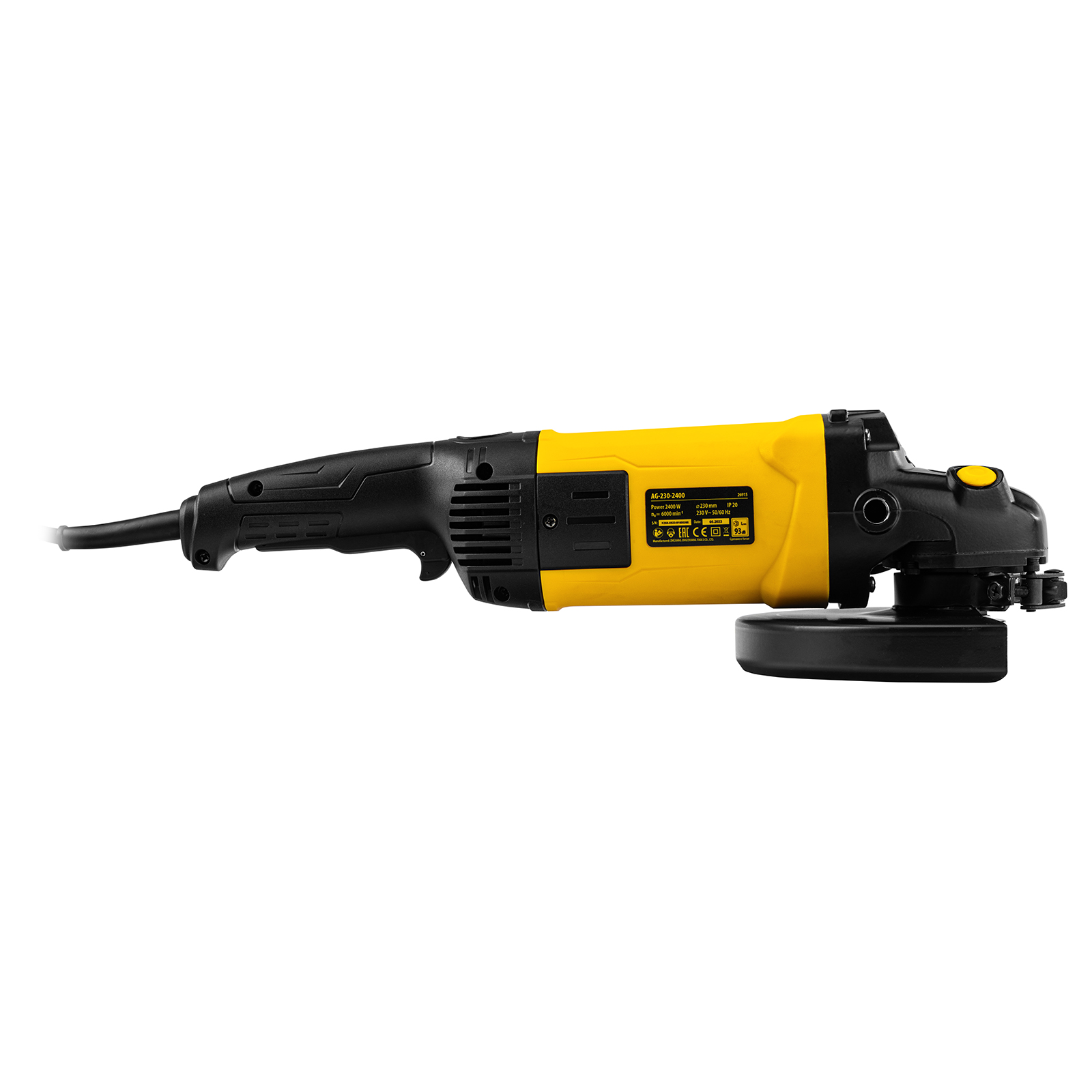 Угловая шлифовальная машина Denzel AG230-2400 26915 мощностью 2400 Вт совместима с насадками максимальным диаметром 230 мм, поддерживает частоту вращения шпинделя 6000 об/мин, благодаря чему эффективно справляется с обработкой и зачисткой поверхностей, а также резкой, шлифовкой металла толщиной до 80 мм и камня. Пригодится дома, в гараже и на даче.
