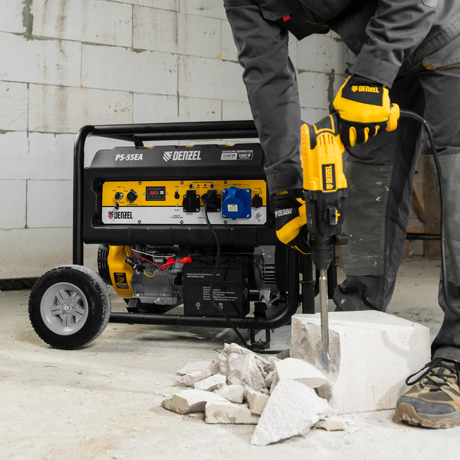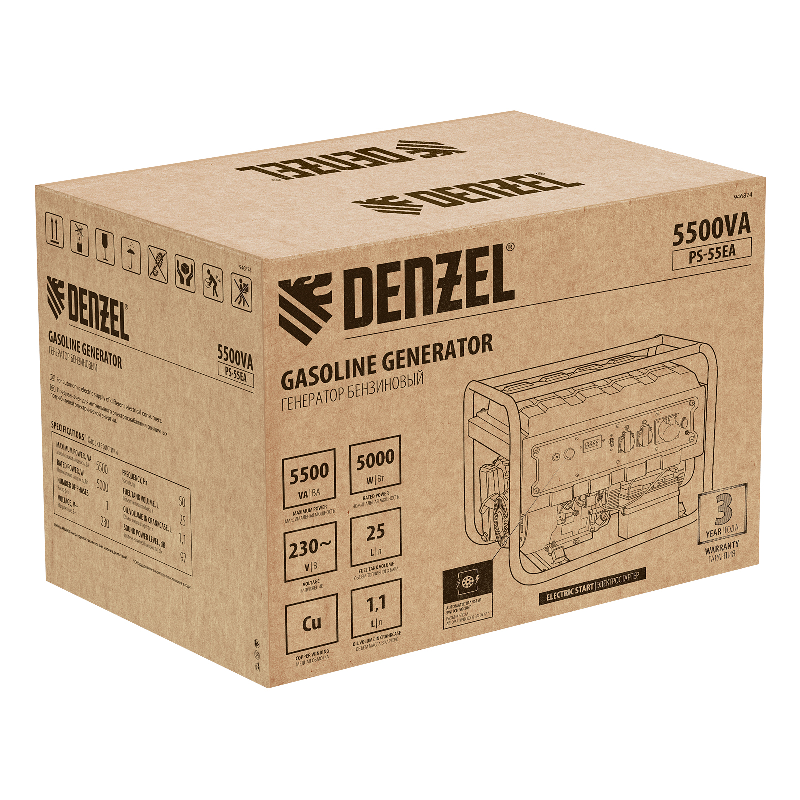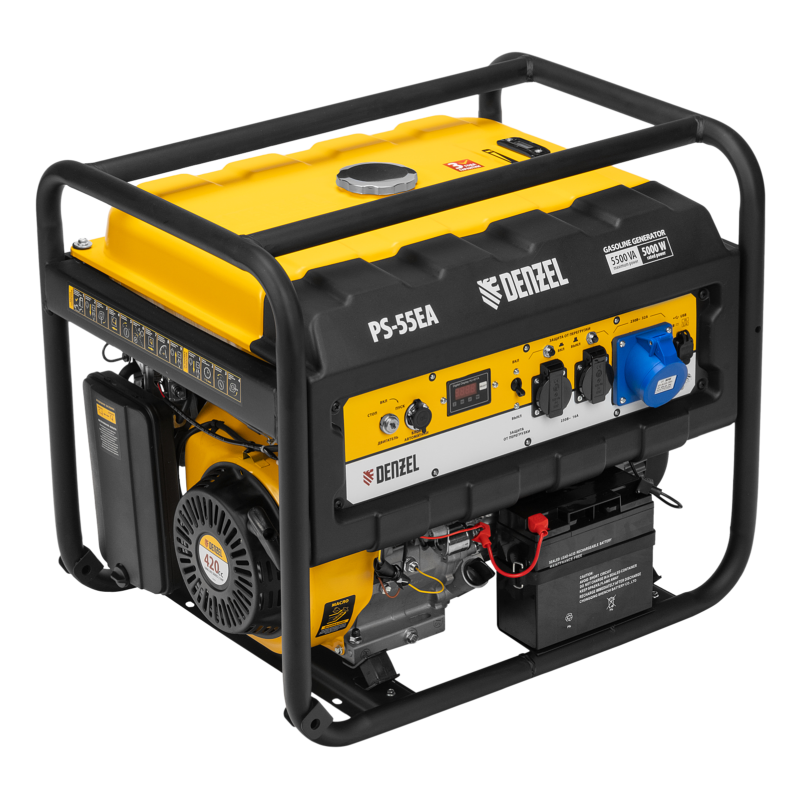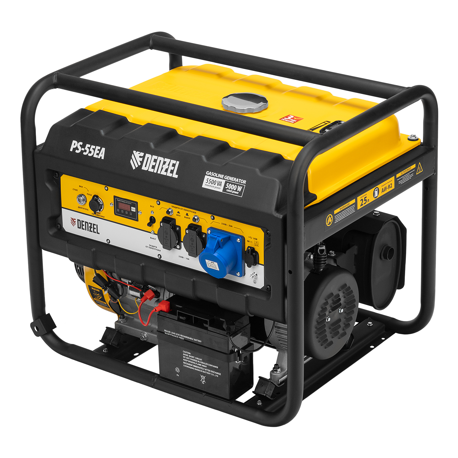 Бензиновый генератор Denzel PS 55 EA 946874 мощностью 5,5 кВт, с коннектором автоматики и электростартером, имеет бак объемом 25 л и поддерживает напряжение в сети 230 В. Подходит для подключения мощных электроинструментов и бытовых приборов, незаменим в условиях отсутствия электричества. В доме можно одновременно использовать 3 лампы накаливания, холодильник, телевизор, утюг, электрочайник. На стройплощадке можно подключить шлифовальную машину, дрель, циркулярную пилу, бетономешалку, компрессор. Выход постоянного тока USB 5 В позволяет использовать генератор для зарядки смартфона, планшета и других мобильных устройств.