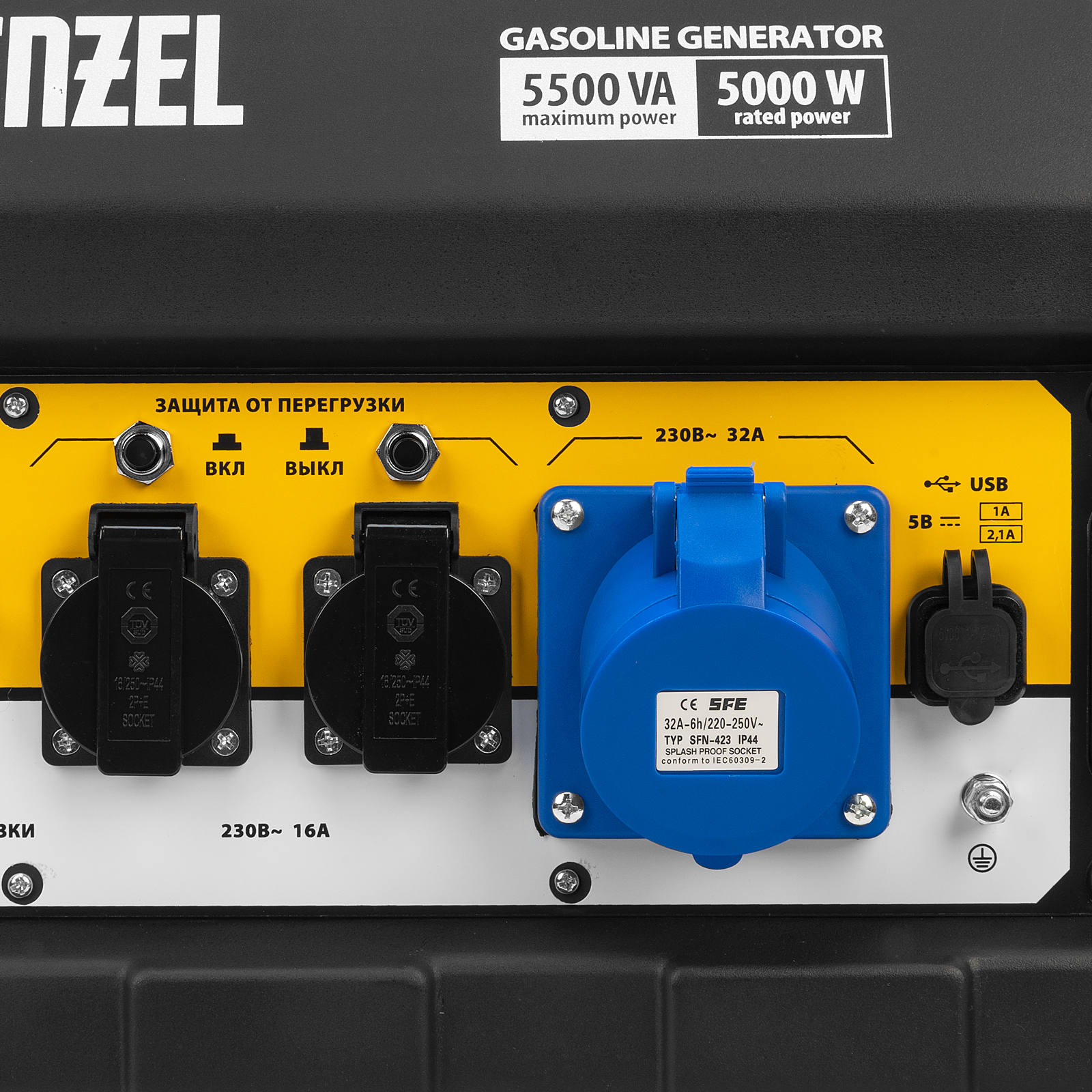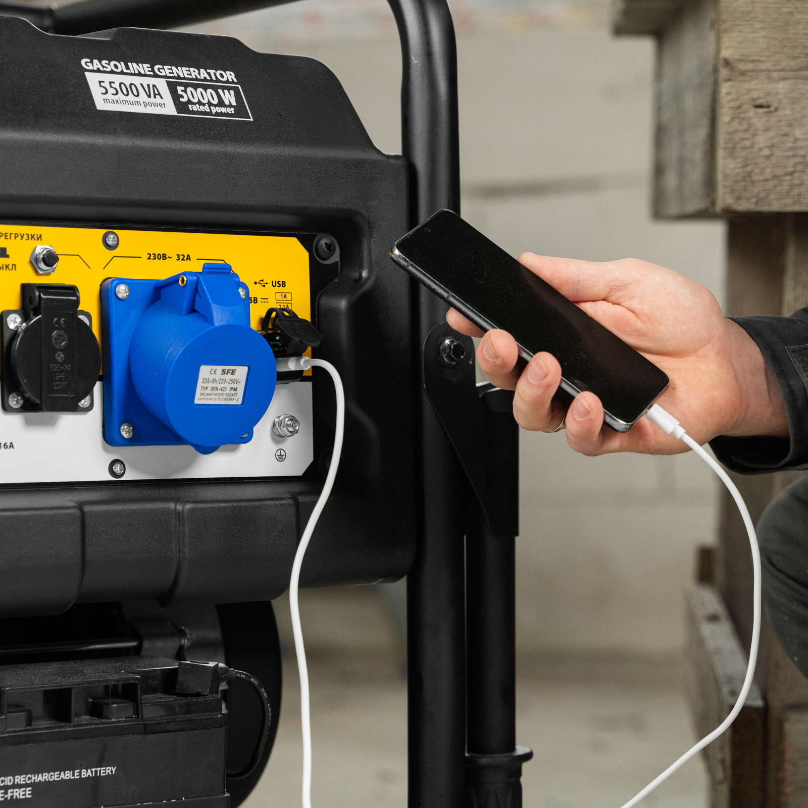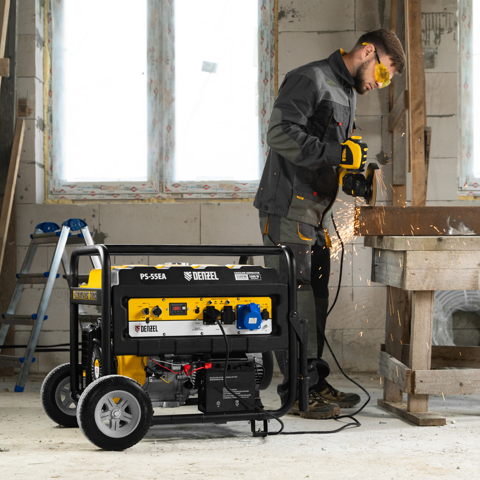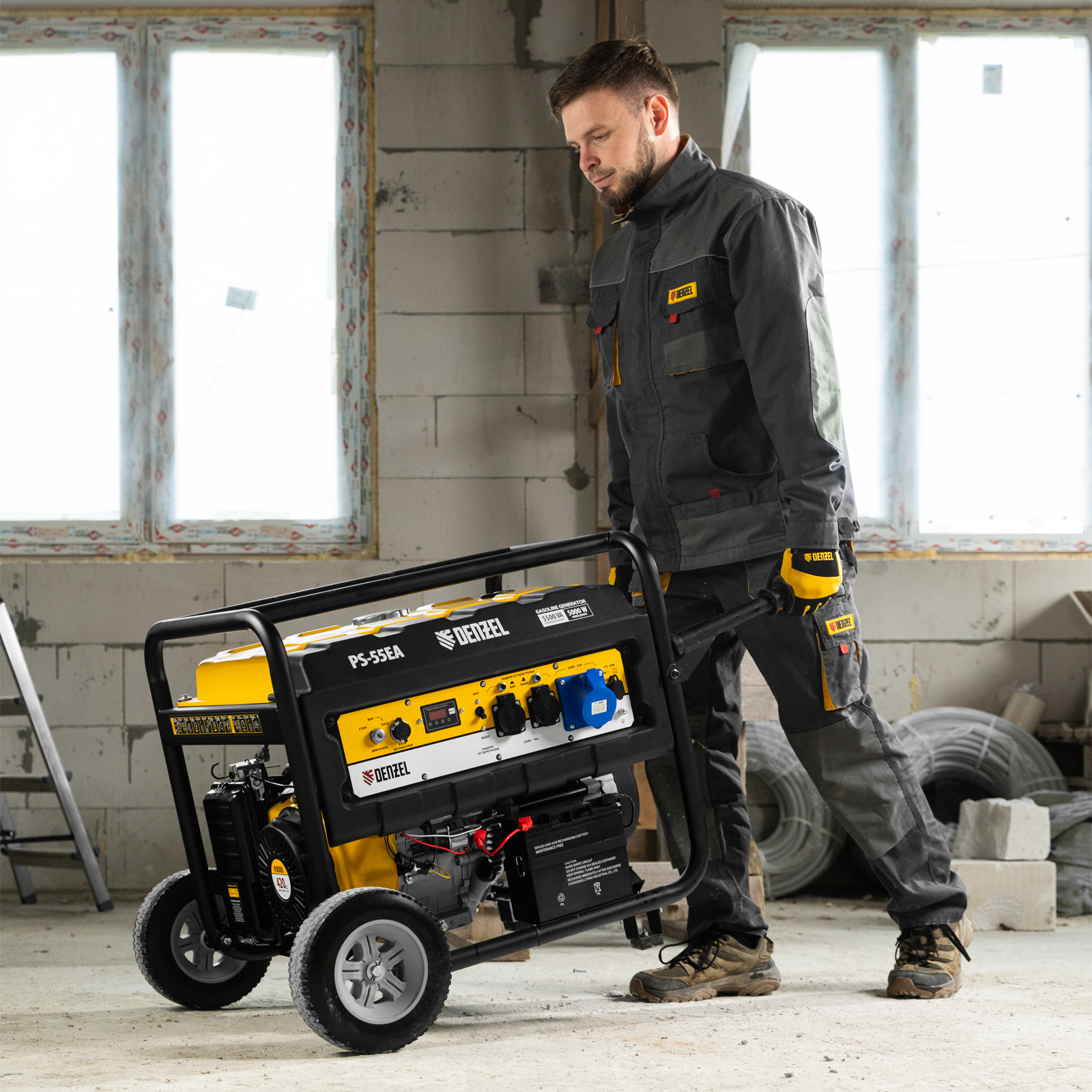 Бензиновый генератор Denzel PS 55 EA 946874 мощностью 5,5 кВт, с коннектором автоматики и электростартером, имеет бак объемом 25 л и поддерживает напряжение в сети 230 В. Подходит для подключения мощных электроинструментов и бытовых приборов, незаменим в условиях отсутствия электричества. В доме можно одновременно использовать 3 лампы накаливания, холодильник, телевизор, утюг, электрочайник. На стройплощадке можно подключить шлифовальную машину, дрель, циркулярную пилу, бетономешалку, компрессор. Выход постоянного тока USB 5 В позволяет использовать генератор для зарядки смартфона, планшета и других мобильных устройств.