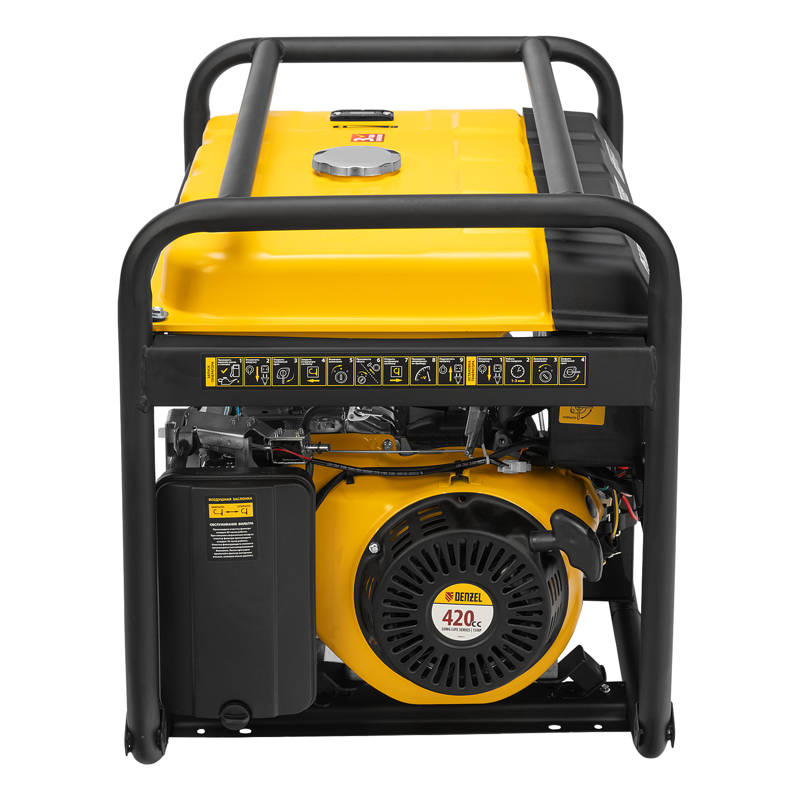 Благодаря увеличенному топливному баку генератор способен работать до 10 часов без дозаправки. Индикатор уровня топлива подскажет, когда следует наполнить бак. Обновленный четырехтактный бензиновый двигатель Denzel Long Life объемом 420 см3 обеспечивает стабильную работу генератора в течение длительного времени. При подключении блока автоматического управления Energomatic PS 115 (артикул 946714, приобретается отдельно) генератор самостоятельно запускается при отсутствии электричества, участие пользователя не требуется.