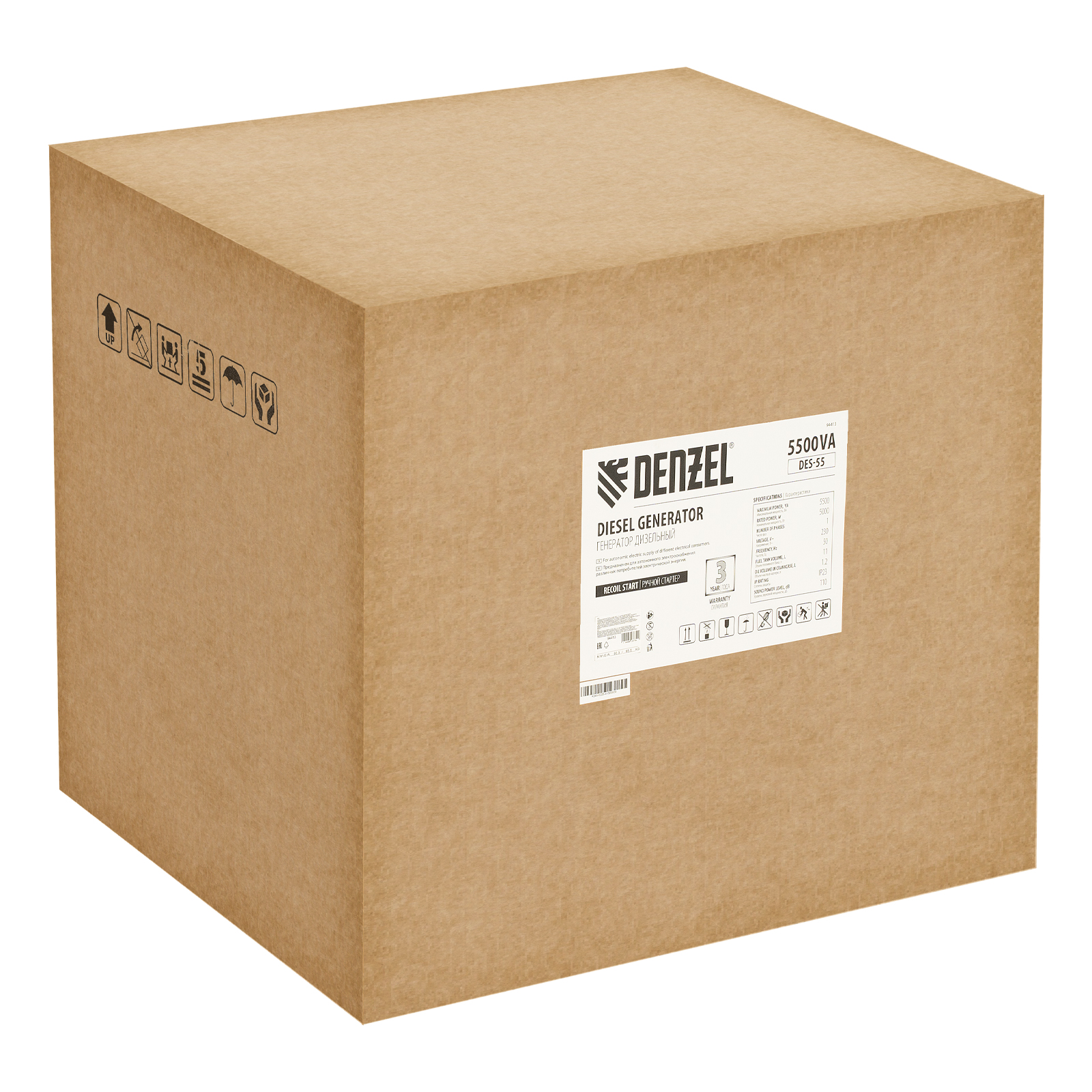 Генератор дизельный Denzel DES-55 94413 с объемом топливного бака 11 л, с ручным стартером, имеет максимальную выходную мощность 5,5 кВт и поддерживает напряжение в сети 230 В. Используется для снабжения энергией потребителей однофазного тока (осветительных приборов, бытовой техники, электроинструмента) при отсутствии доступа к стационарному источнику питания. Для подключения электроприборов служат 2 розетки: 230 В/16 А и 230 В/32 А. Клеммы постоянного тока 12 В позволяют заряжать автомобильные аккумуляторы, а двойной выход USB 5 В предназначен для подключения мобильных устройств (планшетов, смартфонов и т. д.). Генератор пригодится на строительной площадке и в загородном доме.