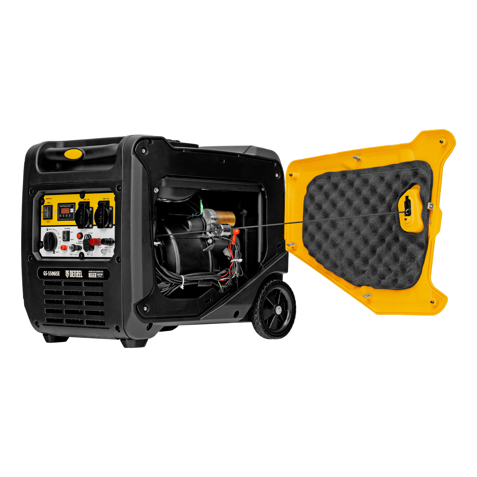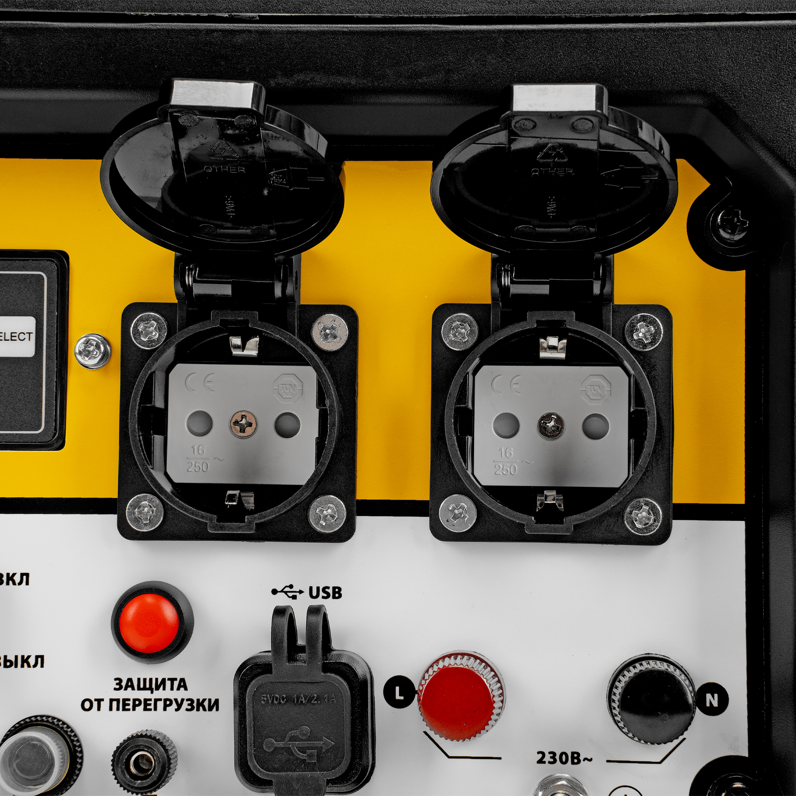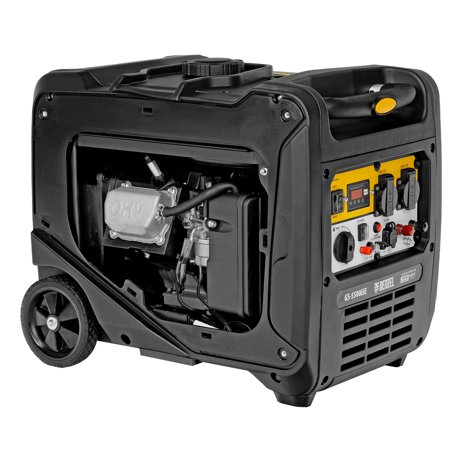 Генератор инверторный Denzel GS-5500iSE 94712 максимальной мощностью 5,5 кВт, в закрытом корпусе, с электростартером, поддерживает напряжение в сети 230 В и используется для обеспечения работоспособности бытовой техники, электроинструмента и осветительных приборов в условиях отсутствия бытовой сети. Для подключения потребителей предусмотрено две розетки 230 В / 16 А. Выход USB 5 В позволяет подключать мобильное устройство, например, смартфон или планшет, а клеммы постоянного тока 12 В служат для зарядки автомобильных аккумуляторов. Предусмотрена возможность снятия полной мощности одним потребителем: на панели управления имеются силовые клеммы. Генератор незаменим в загородном доме.