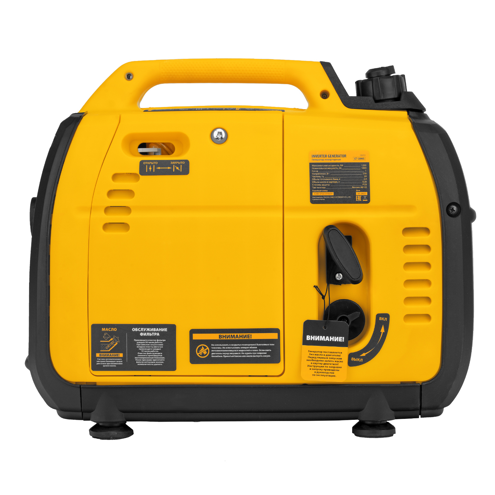 - Визуальный контроль — индикаторы на передней панели информируют о работе генератора, недостаточном уровне масла и о перегрузке.