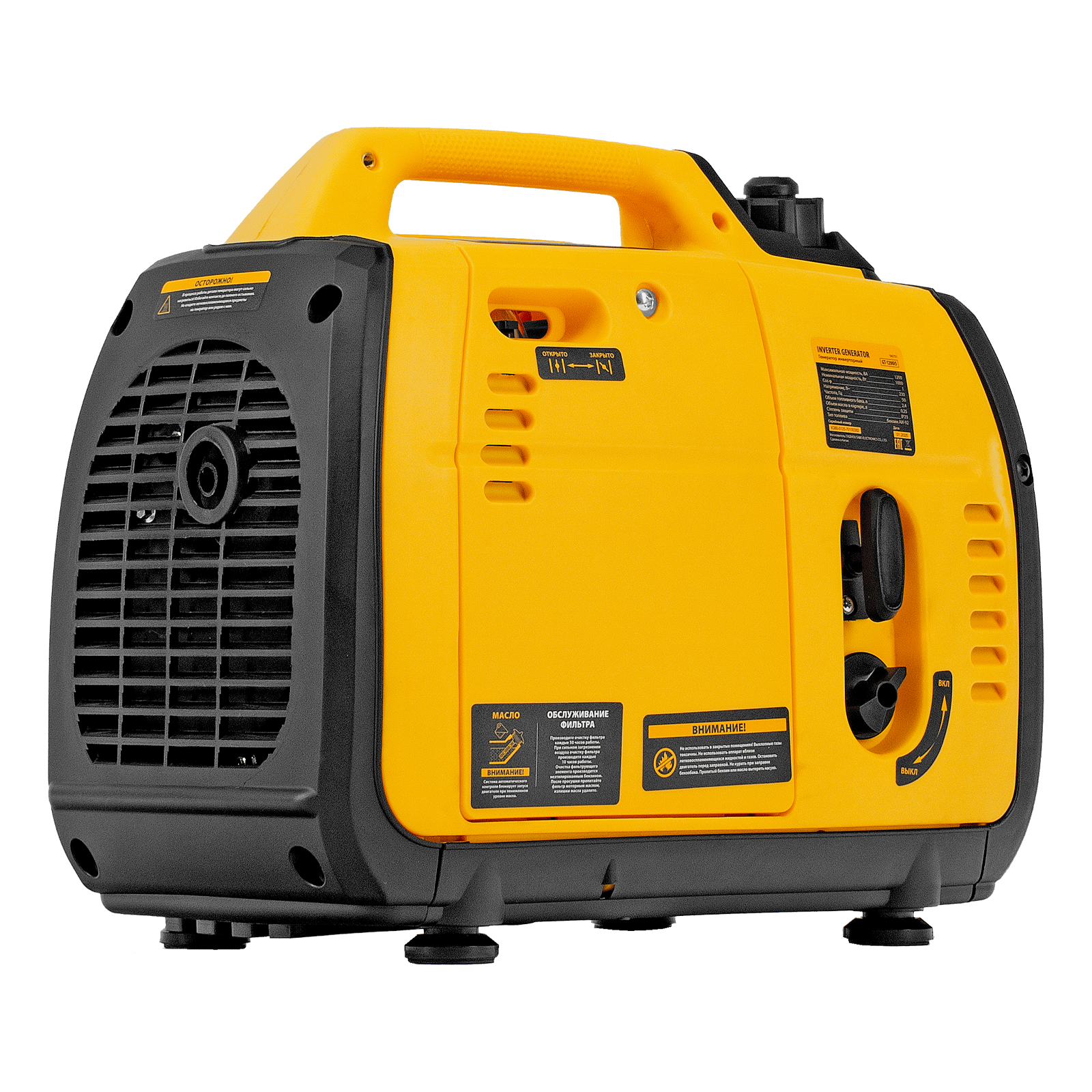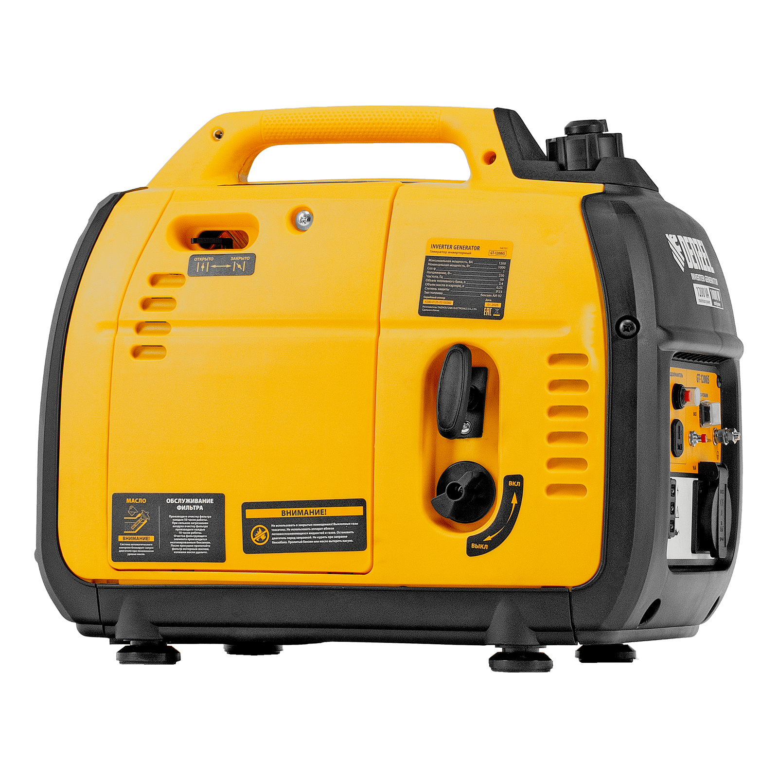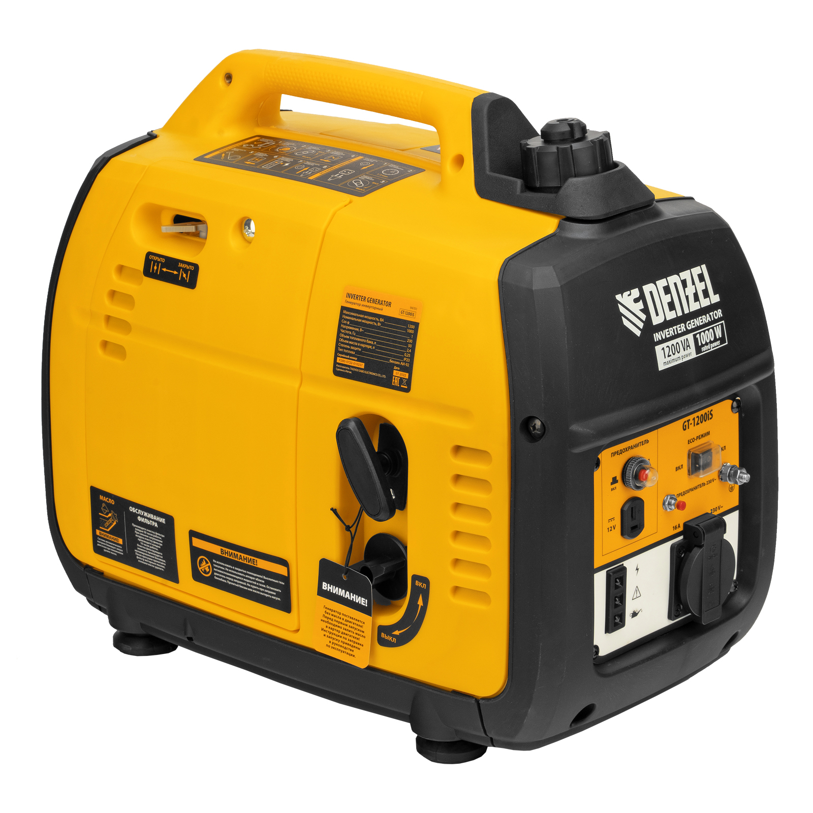 Инверторный генератор Denzel GT-1200iS 94701 мощностью 1,2 кВт, в закрытом корпусе, с ручным стартом, — самый компактный, легкий и экономичный в своей линейке, с ним легко справится даже неопытный пользователь. Идеально подходит для выездов на природу и рыбалку, также будет незаменим на дачном участке и в торговой палатке. Четырехтактный двигатель мощностью 1,8 л.с. и объемом 53,5 куб. см работает стабильно и имеет небольшой уровень шума 52 дБ.