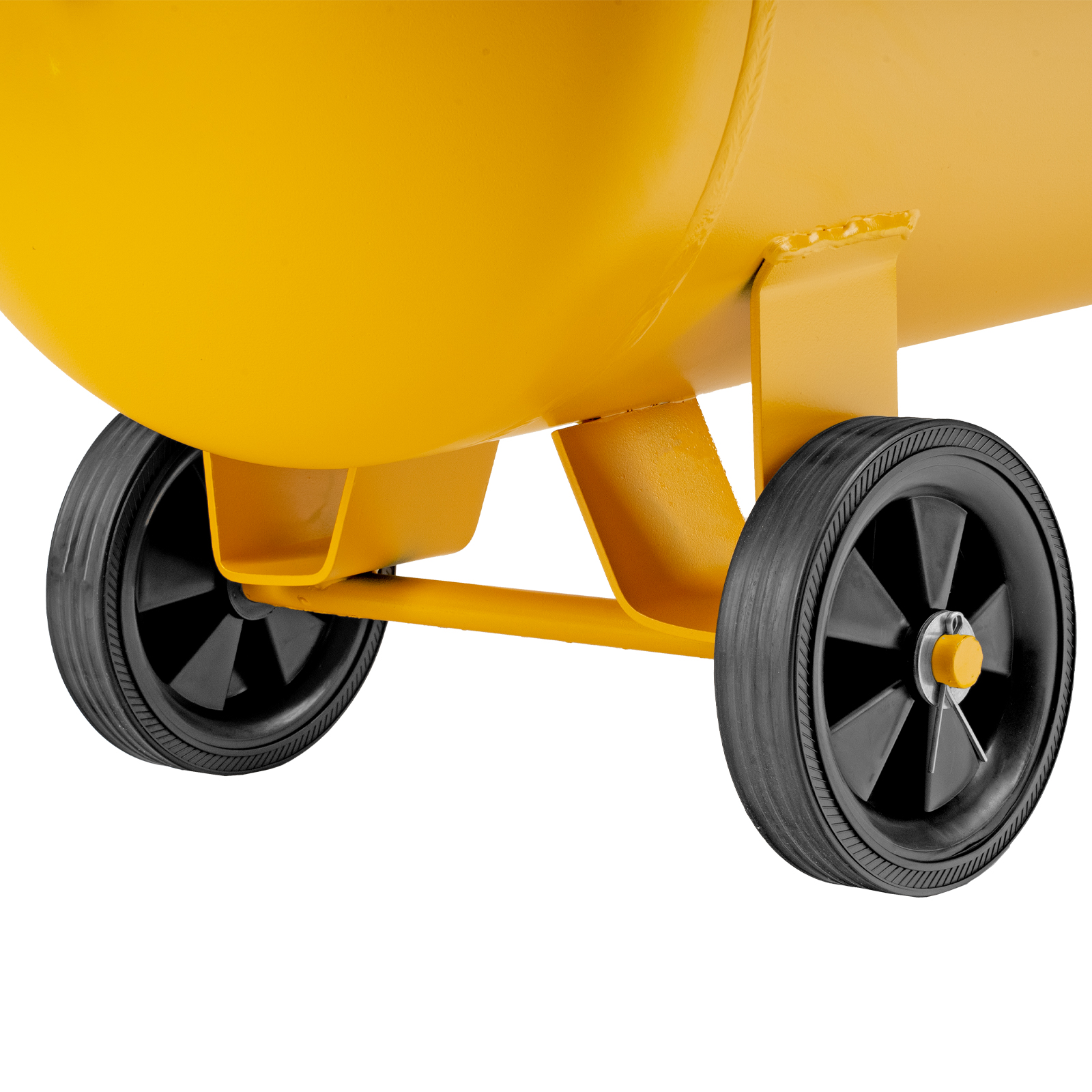 - Мобильность — 3 колеса, в том числе 1 поворотное, и транспортировочная рукоятка упрощают перемещение компрессора по рабочей зоне.