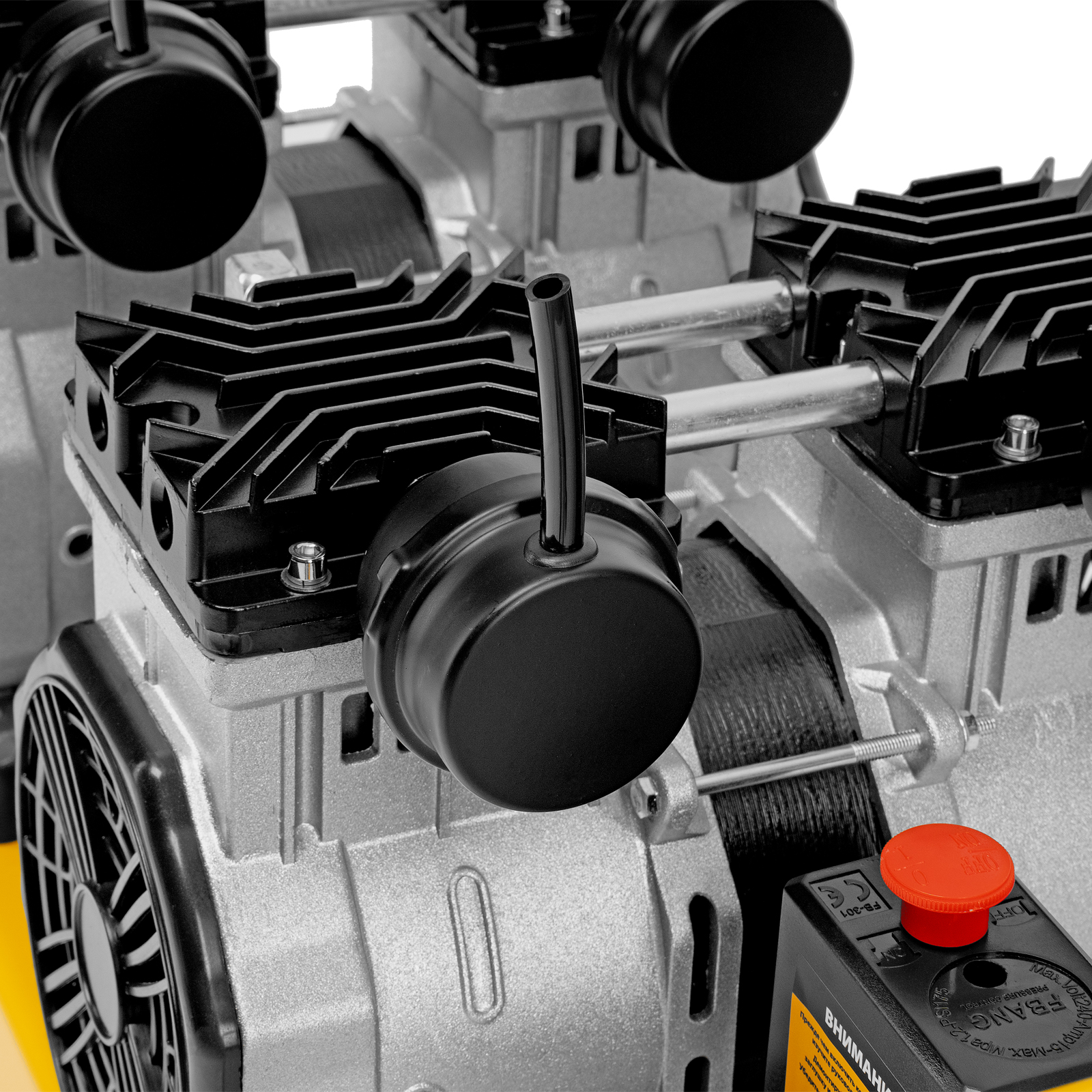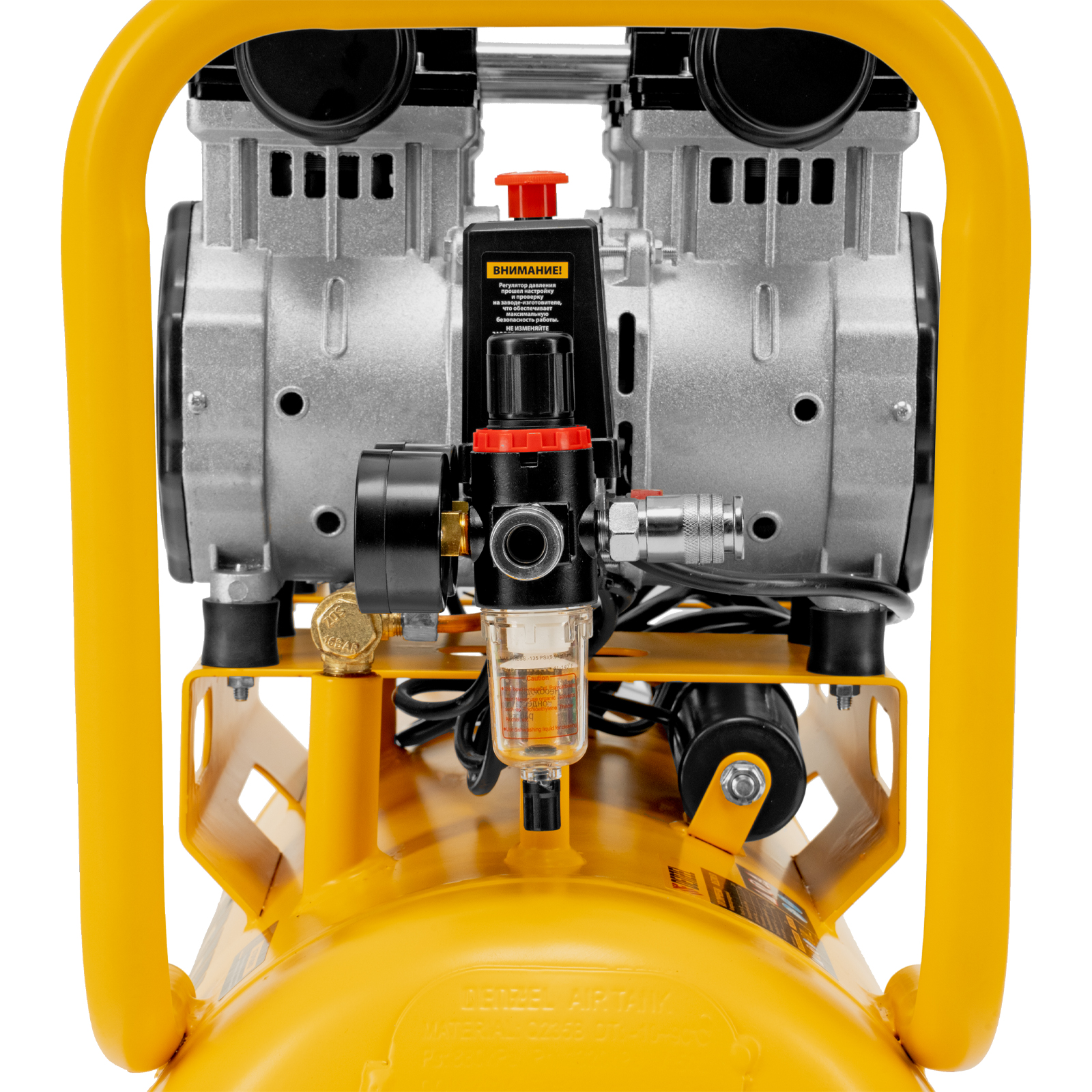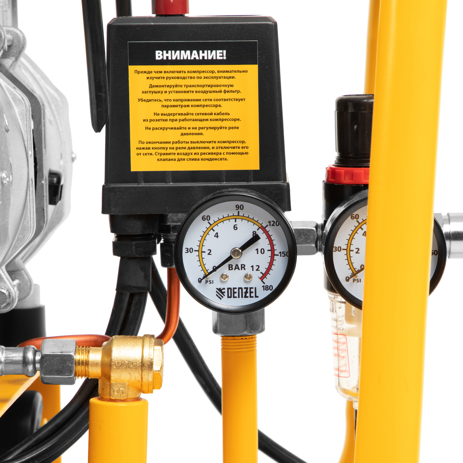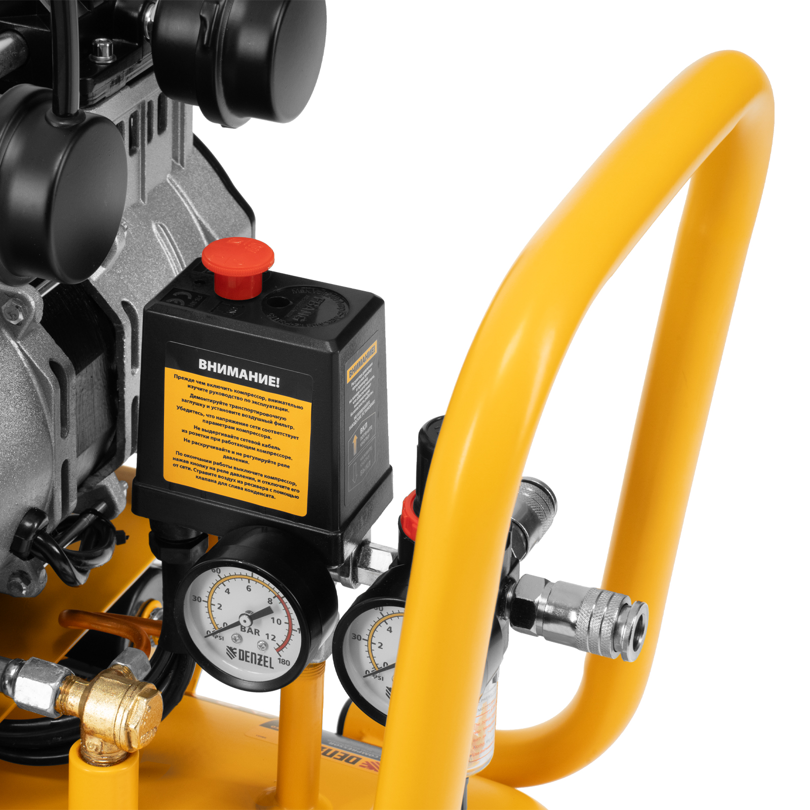 - Контроль давления в ресивере и на выходной магистрали — компрессор оборудован двумя манометрами.