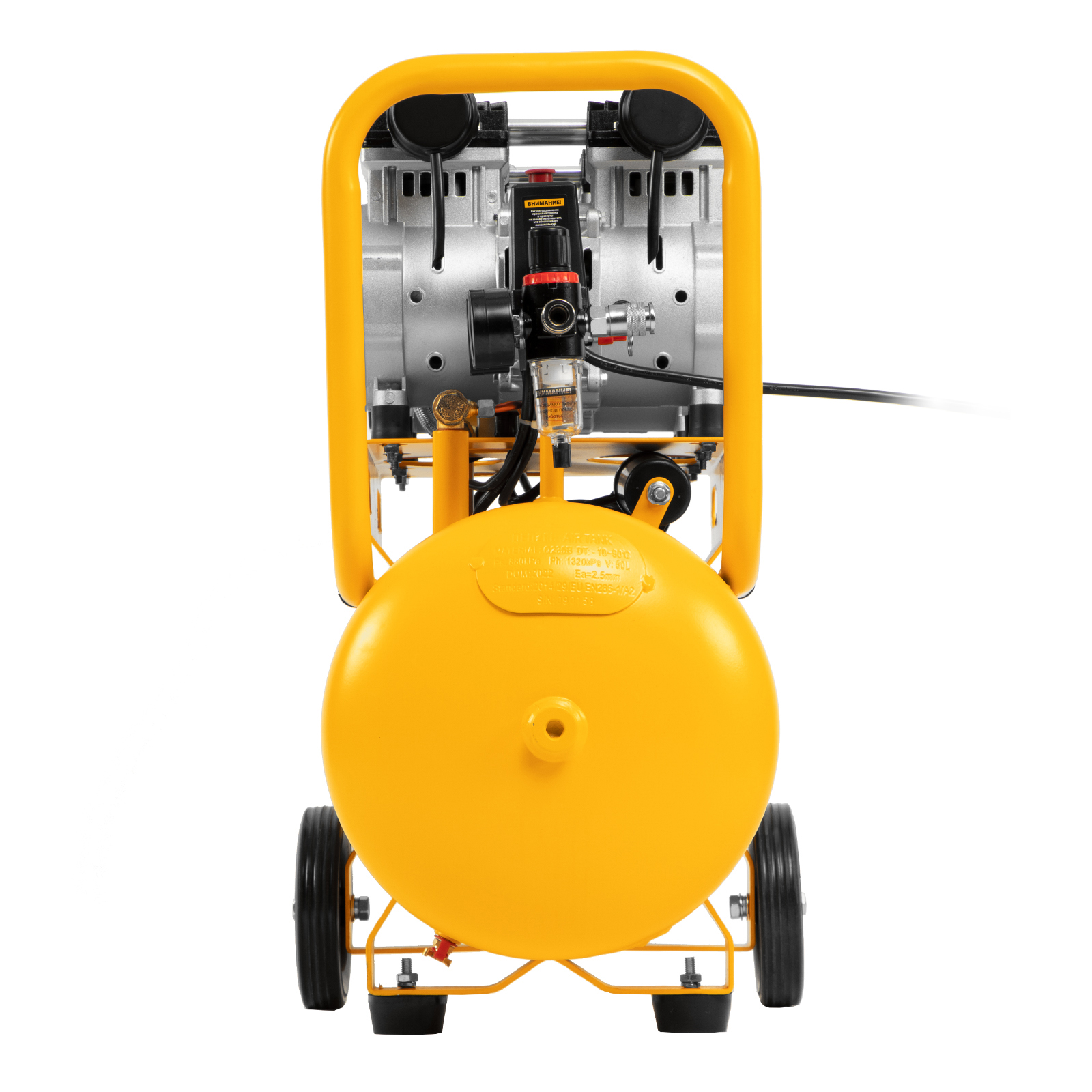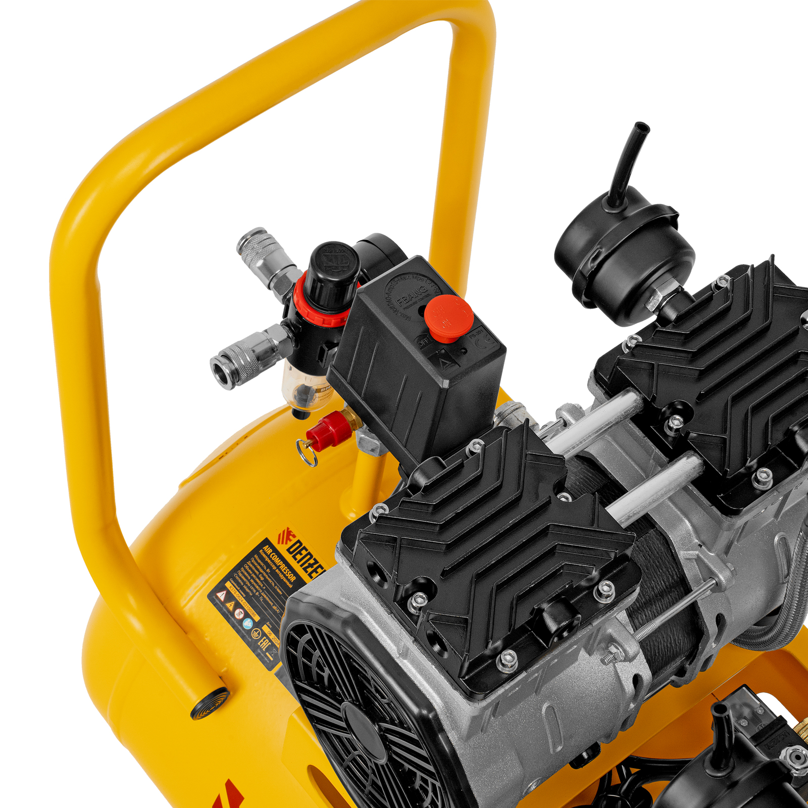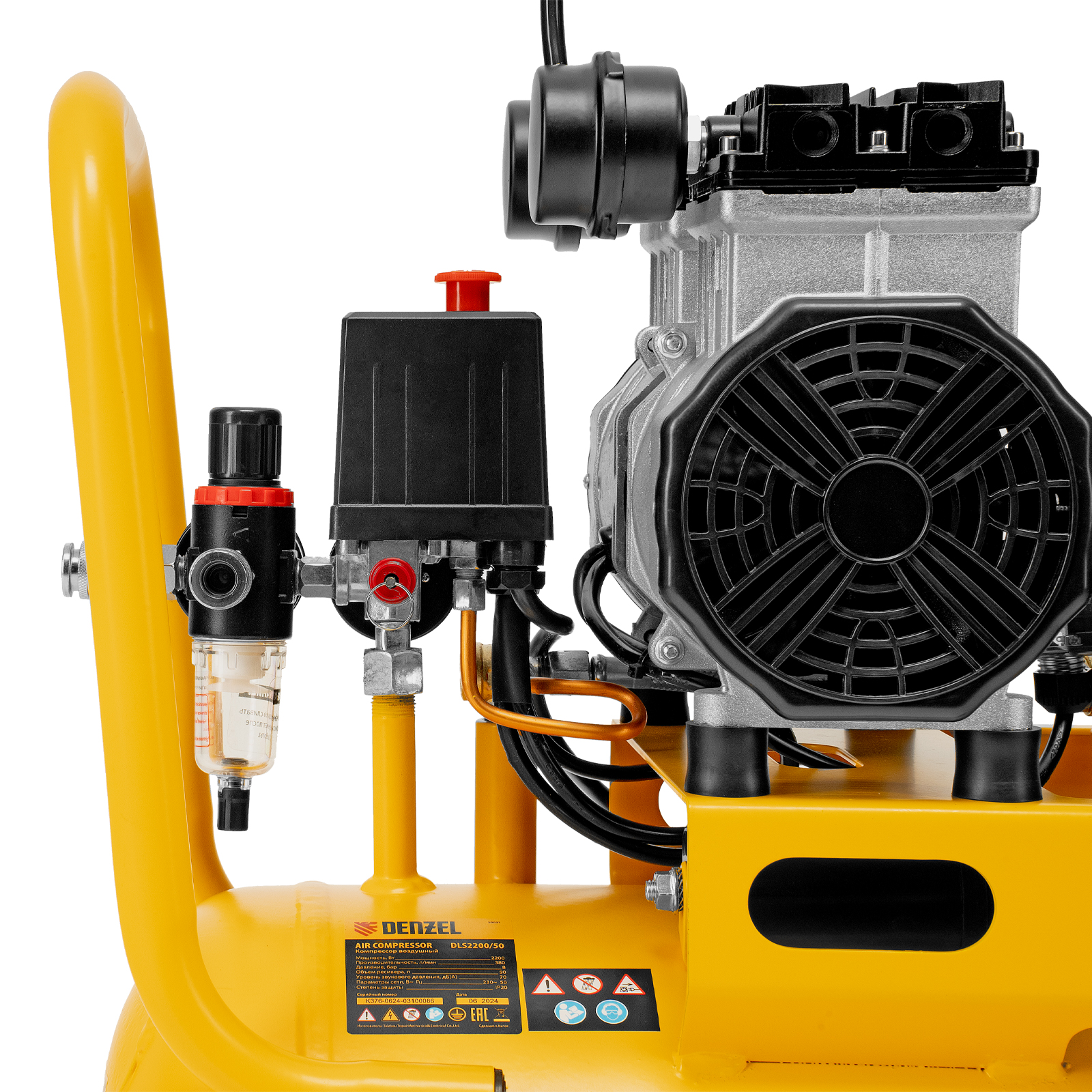 Безмасляный малошумный компрессор Denzel DLS 2200/50 58031 мощностью 2200 (2 х 1100) Вт, объемом ресивера 50 л и производительностью 380 л/мин предназначен для обеспечения пневмоинструмента сжатым воздухом, подаваемым под давлением до 8 бар. Частота вращения вала составляет 2800 об/мин, что позволило добиться увеличения производительности более чем на 40%. Компрессор позволяет подключить пневматический заклепочник, дрель, шлифмашину и т.д. Оптимален для работы с краскопультом и для продувки электронных компонентов, т. к. в сжатом воздухе отсутствуют частицы масла. Компрессор пригодится в мастерской, гараже, на строительной площадке.
