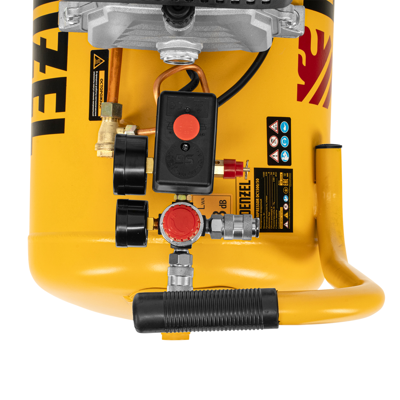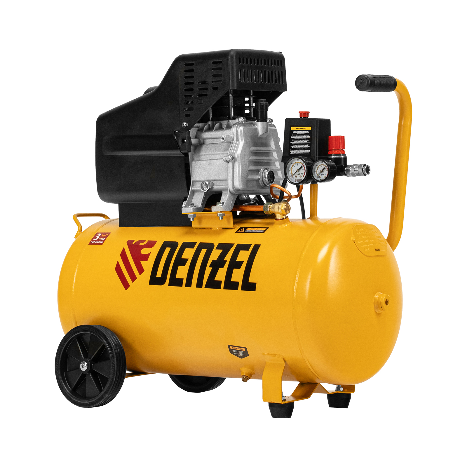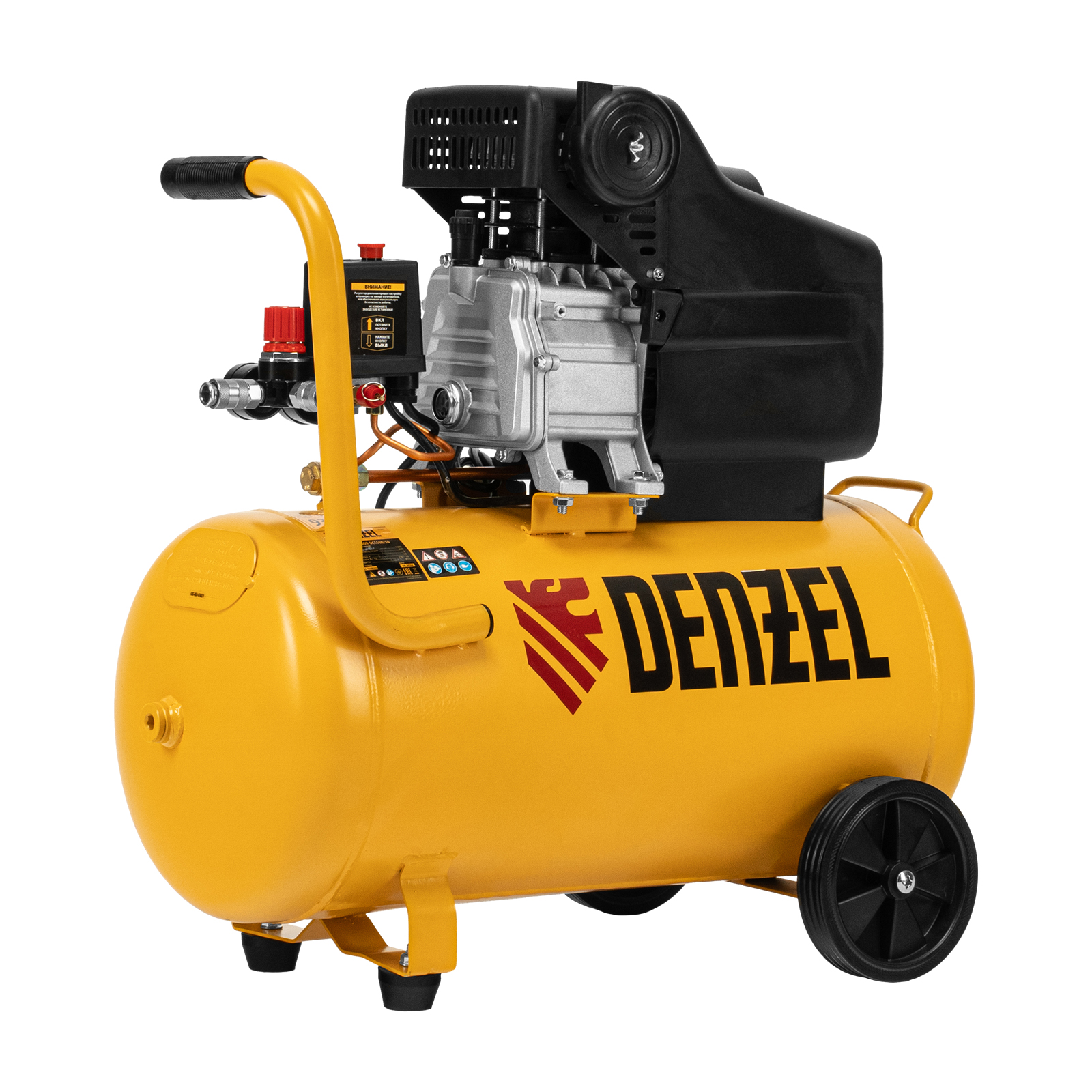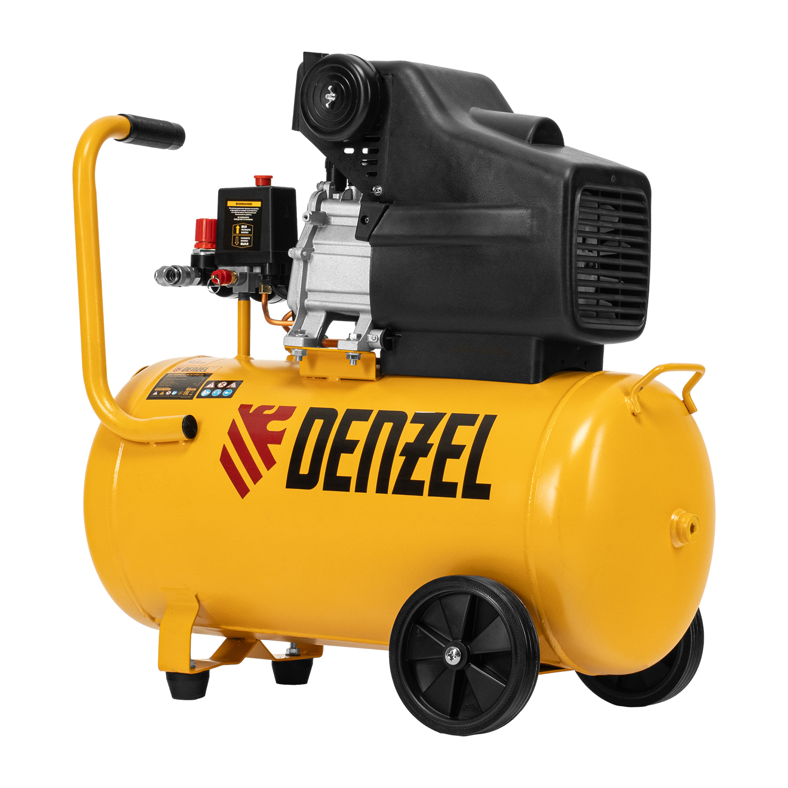 Воздушный компрессор с прямым приводом Denzel DC1500/50 58161 мощностью 1,5 кВт и производительностью 220 л/мин, с объемом ресивера 50 л, используется для подачи сжатого воздуха к пневмоинструменту, например, пневмогайковерту, пневмодрели, пневмостеплеру, пневмозубилу. Благодаря использованию смазочного масла, которое снижает износ деталей, компрессор выдерживает длительную работу и подходит для профессионального применения в автомастерской, гараже или на строительной площадке.