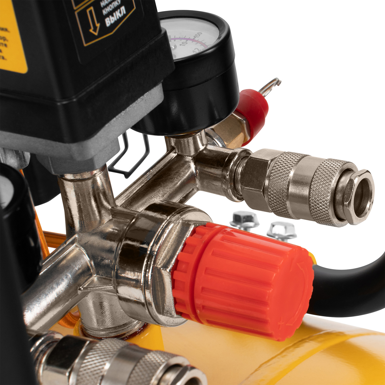 - Удобный контроль работы — 2 манометра позволяют без труда отслеживать уровень давления как в ресивере, так и на выходной магистрали.