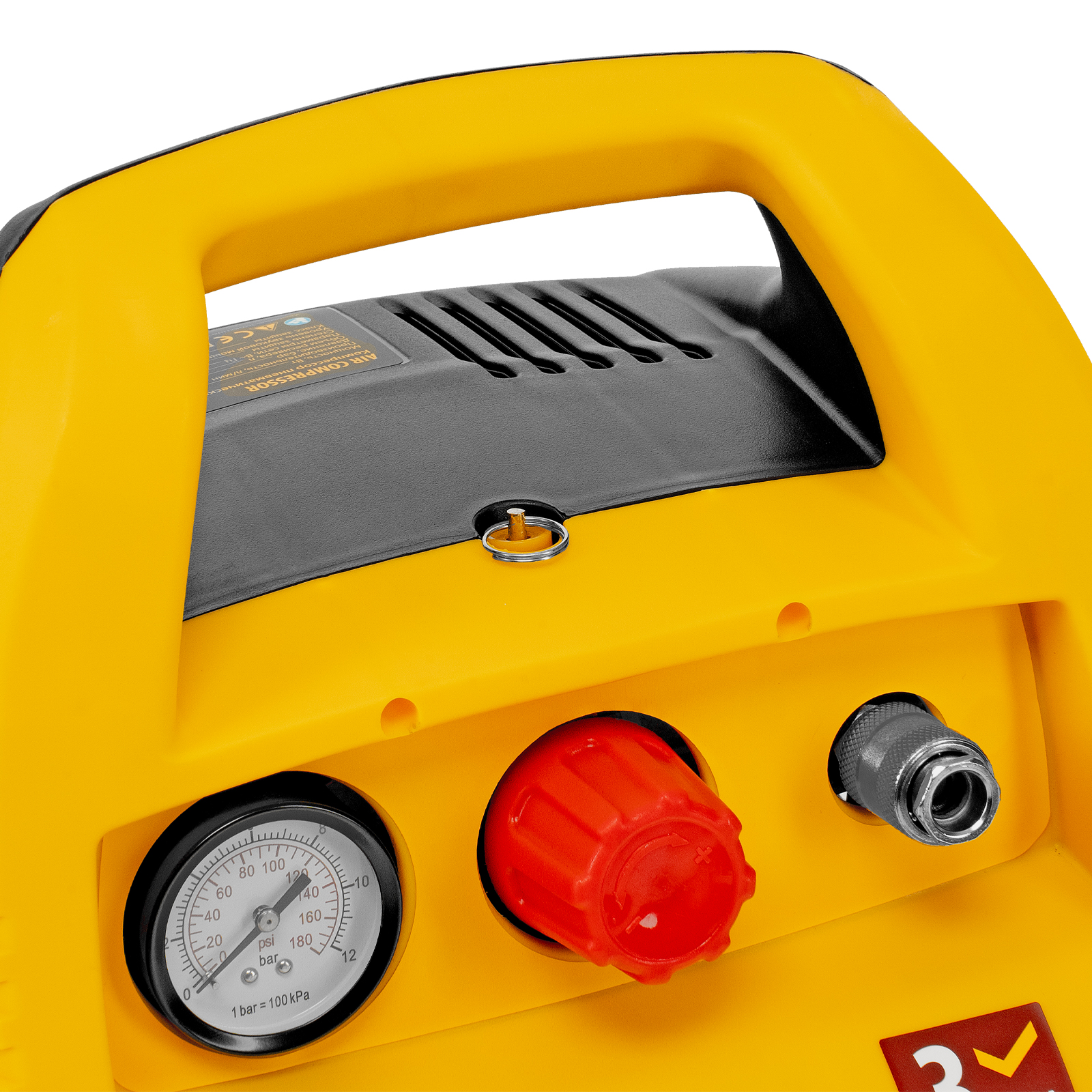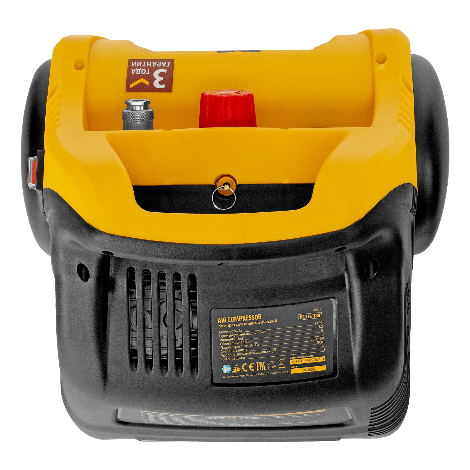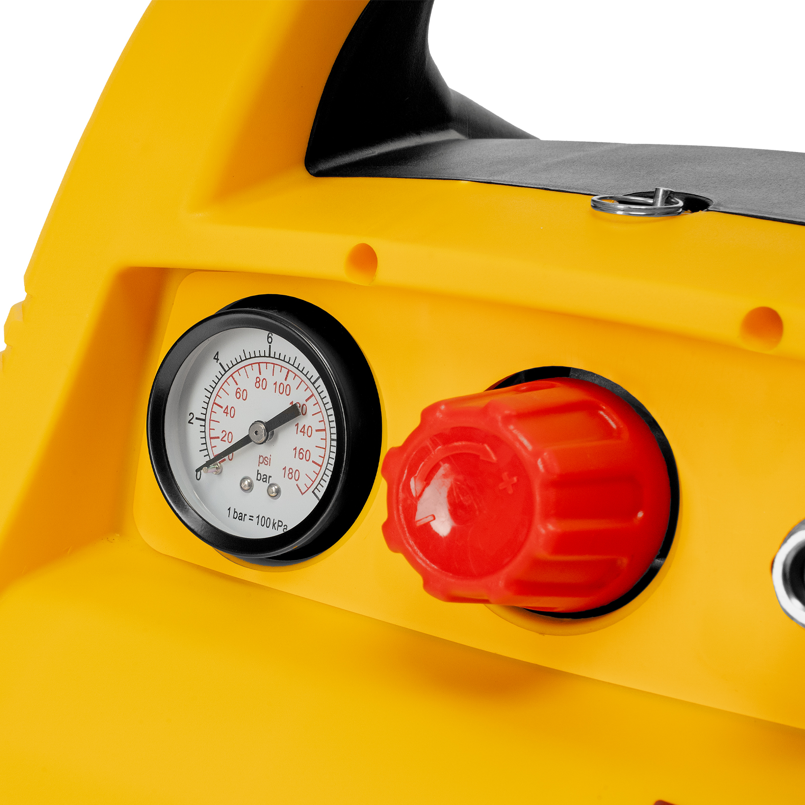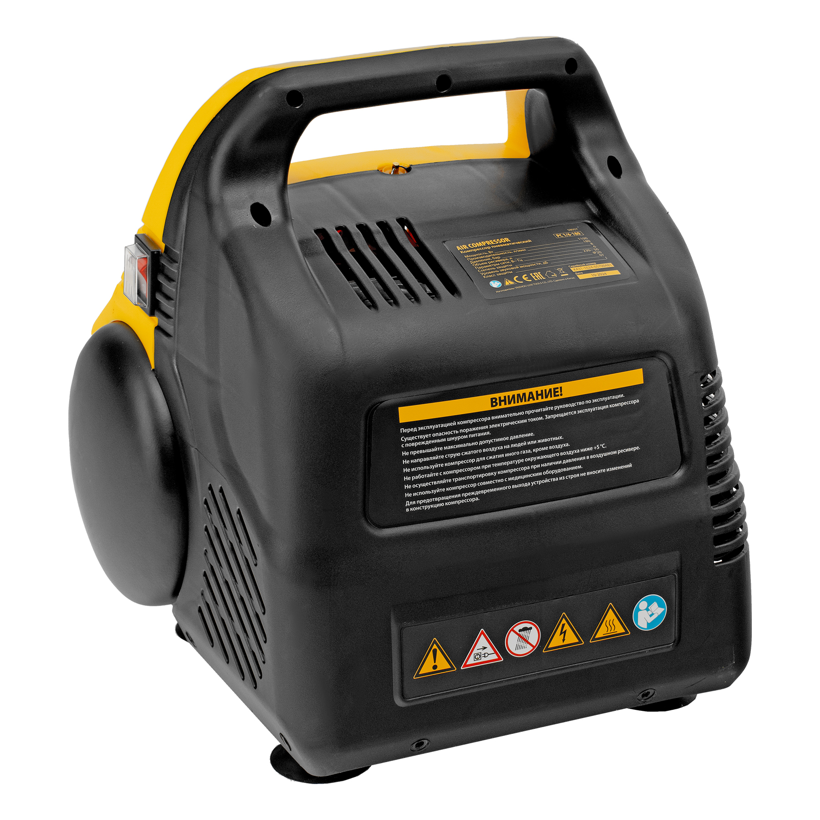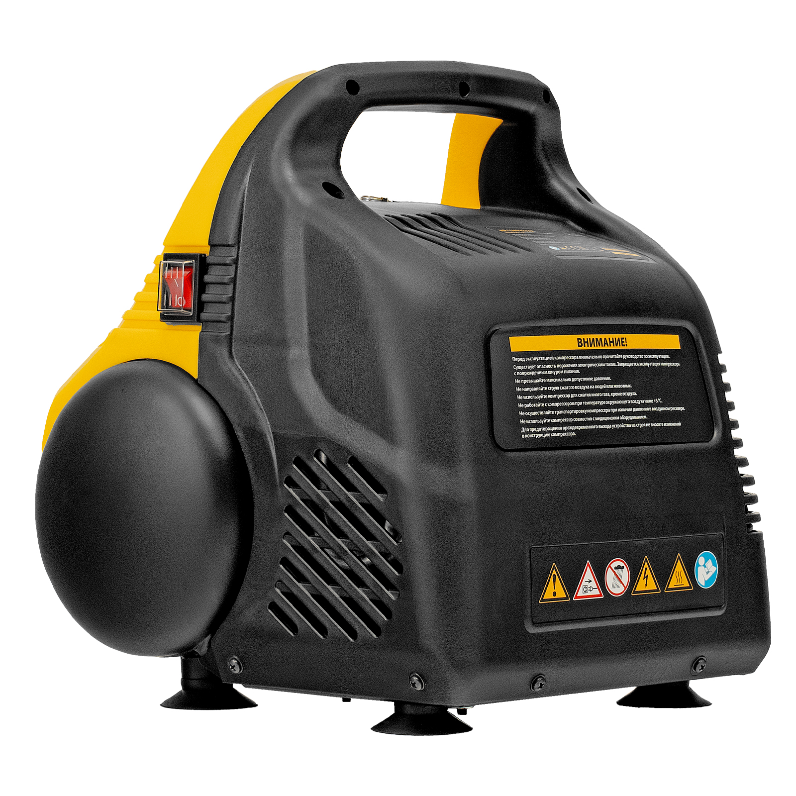 Безмасляный компрессор подходит для работ, не допускающих попадания масла в воздух: покраски, накачки шин, продувки компьютерной техники, чистки строительных инструментов. Допускается подключение пневмонейлера и пневмогравера. Безмасляная технология RTFE значительно упрощает работу с устройством: не нужно использовать маслоуловители или маслоотделители, искать масло и следить за его уровнем.,Генератор энергии сжатого воздуха вырабатывает 180 л в минуту с мощностью 1.1 кВт, что является пиковым значением для безмасляных моделей такого класса. ,Компактные размеры и продуманный дизайн позволяют легко переносить компрессор за удобную транспортировочную ручку. Вес 11.15 кг и габариты 30 х 33 х 36 см упрощают размещение устройства на рабочей площадке и хранение.