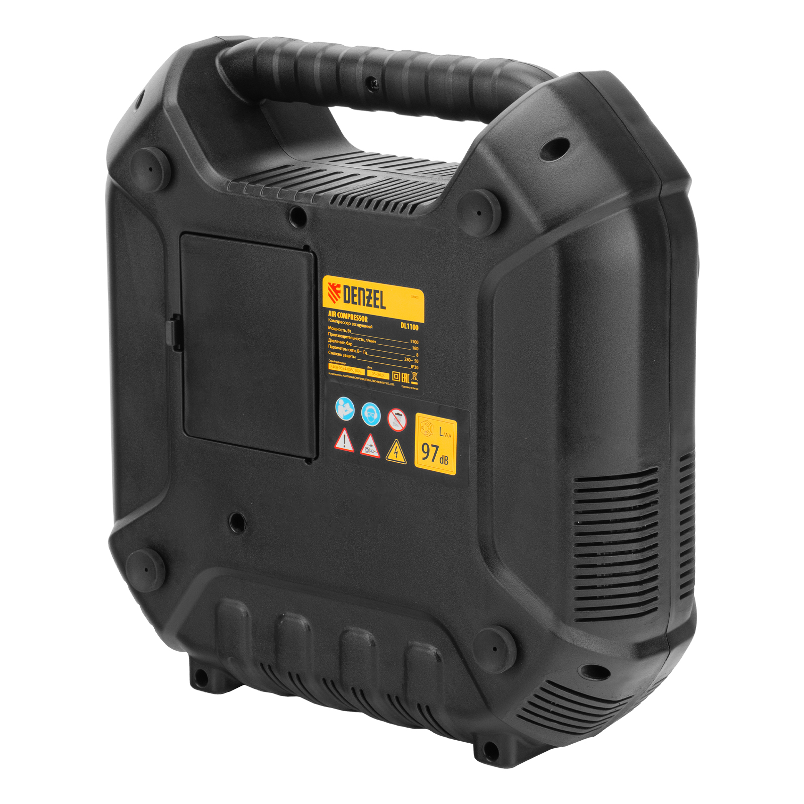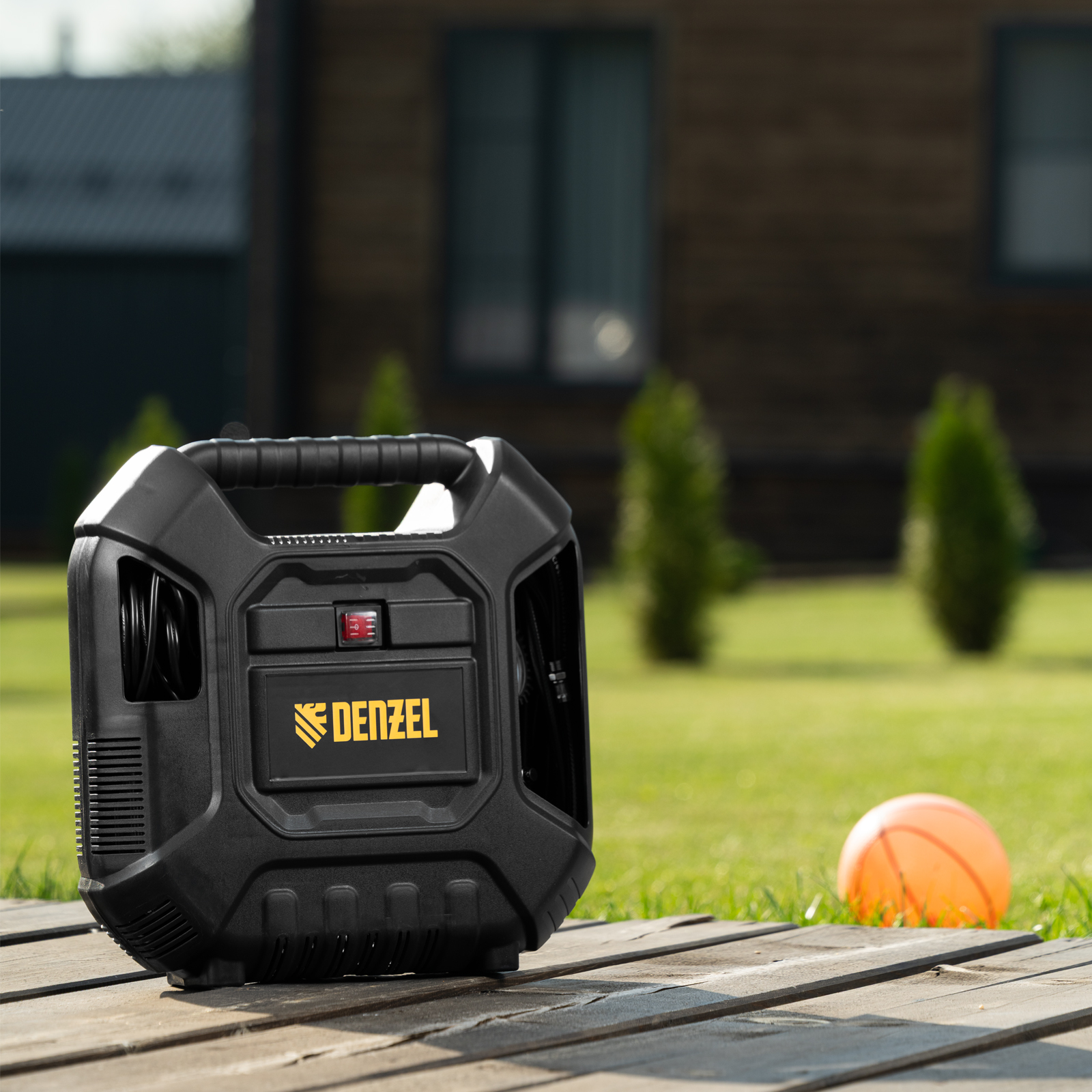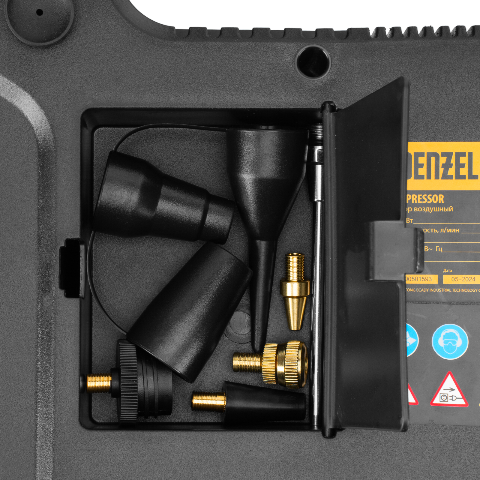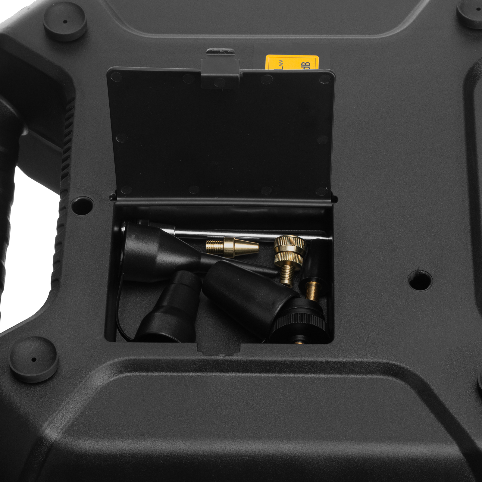 - Компактность — в компрессоре предусмотрены отсеки для кабеля питания, аксессуаров и пневмопистолета со шлангом. Такое решение позволяет аккуратно расположить комплектующие в одном месте и с удобством переносить оборудование.