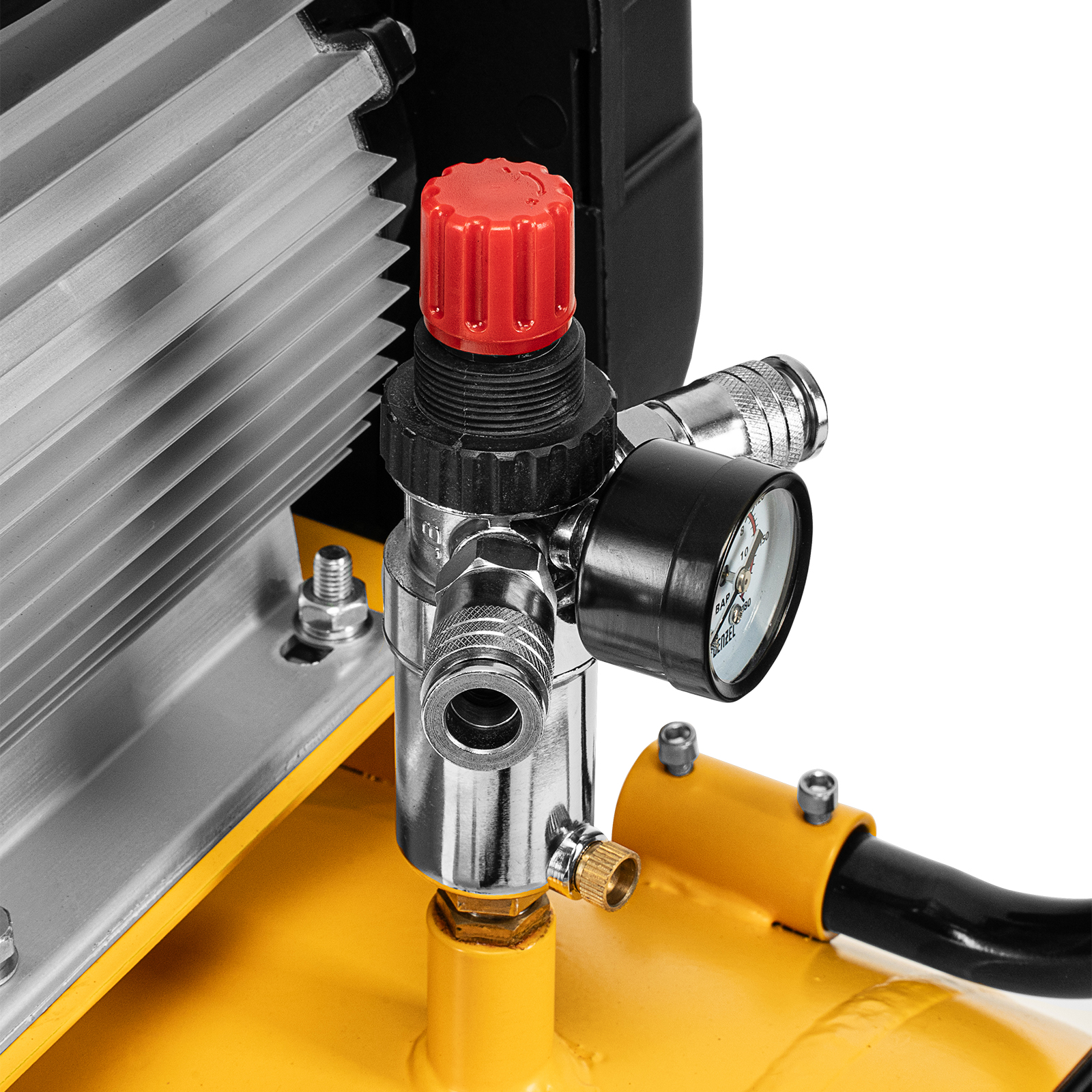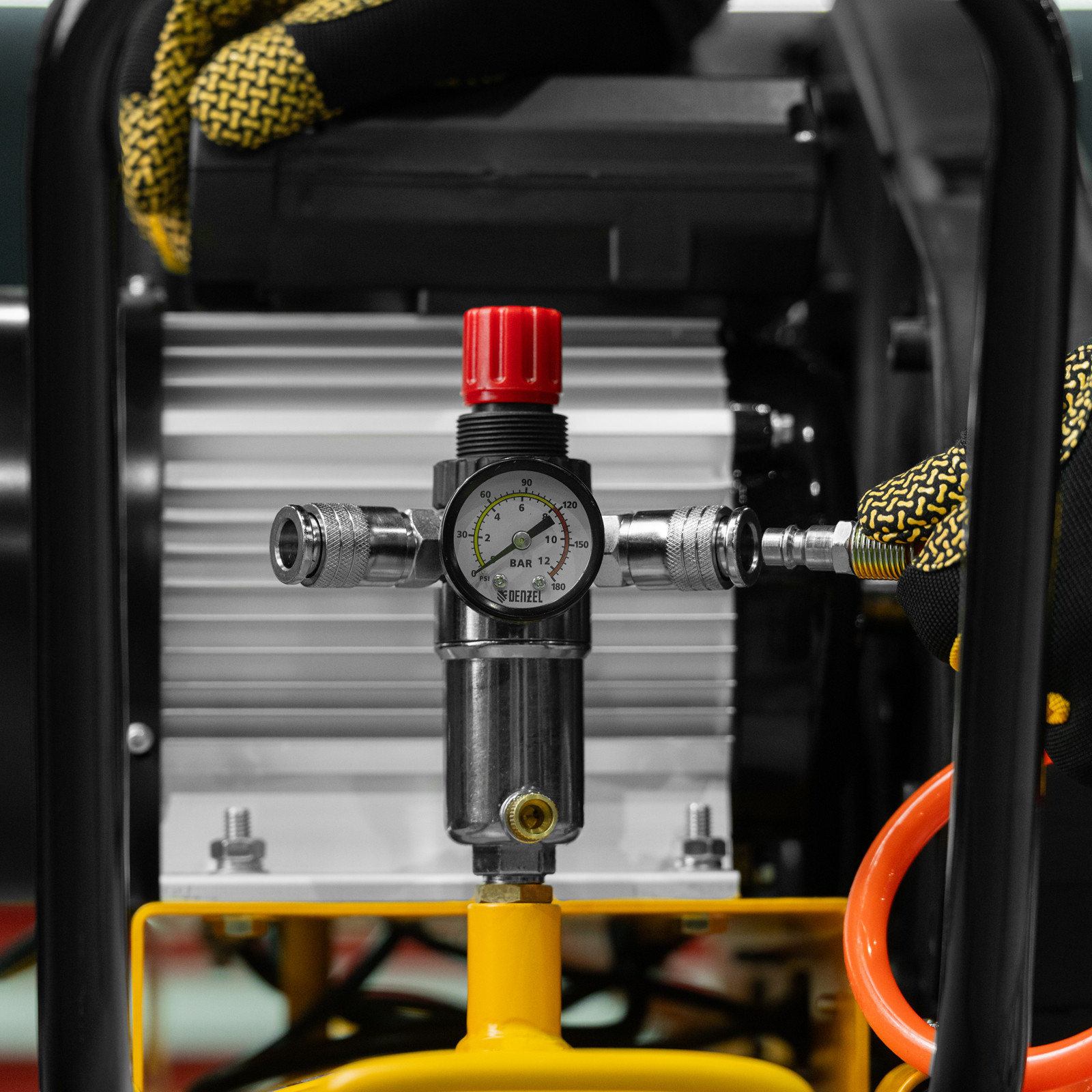 - Удобный контроль давления в ресивере и пневмомагистрали — компрессор оснащен двумя механическими манометрами.
